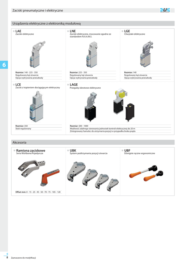 Zaciski pneumatyczne i elektryczne UNIVER GROUP Urządzenia elektryczne z elektroniką modułową LAE LNE LGE Rozmiar: 140 - 225 - 350 Regulowany kąt otwarcia Opcja wykrywania przeszkody Rozmiar: 225 - 350 Regulowany kąt otwarcia Opcja wykrywania przeszkody Rozmiar: 140 Regulowany kąt otwarcia Opcja wykrywania przeszkody LCE LAGE Rozmiar: 350 Skok regulowany Rozmiar: 500 - 1000 Możliwość zdalnego sterowania jednostek kontroli elektrycznej do 20 m Zintegrowany hamulec do utrzymania pozycji w przypadku braku prądu Zaciski elektryczne Zaciski elektryczne, mocowanie zgodne ze standardem N.A.A.M.S. Chwytaki elektryczne 6 Zacisk z trzpieniem dociągającym elektryczny Przeguby obrotowe elektryczne Akcesoria Ramiona zaciskowe Seria Wishbone/Pojedyncze Offset mm: 0 - 15 - 25 - 45 - 50 - 70 - 75 - 105 - 120 6 8 Zaznaczone do modyfikacji UBK System podtrzymania pozycji otwarcia UBF Dźwignie ręczne ergonomiczne