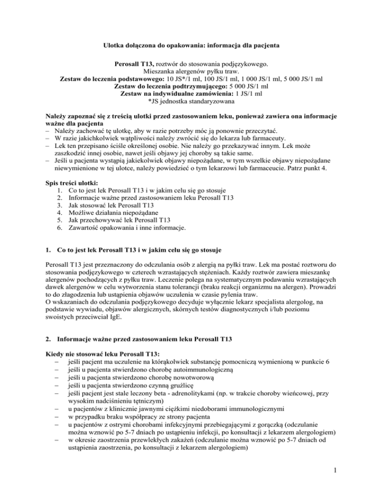 Ulotka dołączona do opakowania: informacja dla pacjenta Perosall T13, roztwór do stosowania podjęzykowego. Mieszanka alergenów pyłku traw. Zestaw do leczenia podstawowego: 10 JS*/1 ml, 100 JS/1 ml, 1 000 JS/1 ml, 5 000 JS/1 ml Zestaw do leczenia podtrzymującego: 5 000 JS/1 ml Zestaw na indywidualne zamówienia: 1 JS/1 ml *JS jednostka standaryzowana Należy zapoznać się z treścią ulotki przed zastosowaniem leku, ponieważ zawiera ona informacje ważne dla pacjenta – Należy zachować tę ulotkę, aby w razie potrzeby móc ją ponownie przeczytać. – W razie jakichkolwiek wątpliwości należy zwrócić się do lekarza lub farmaceuty. – Lek ten przepisano ściśle określonej osobie. Nie należy go przekazywać innym. Lek może zaszkodzić innej osobie, nawet jeśli objawy jej choroby są takie same. – Jeśli u pacjenta wystąpią jakiekolwiek objawy niepożądane, w tym wszelkie objawy niepożądane niewymienione w tej ulotce, należy powiedzieć o tym lekarzowi lub farmaceucie. Patrz punkt 4. Spis treści ulotki: 1. Co to jest lek Perosall T13 i w jakim celu się go stosuje 2. Informacje ważne przed zastosowaniem leku Perosall T13 3. Jak stosować lek Perosall T13 4. Możliwe działania niepożądane 5. Jak przechowywać lek Perosall T13 6. Zawartość opakowania i inne informacje. 1. Co to jest lek Perosall T13 i w jakim celu się go stosuje Perosall T13 jest przeznaczony do odczulania osób z alergią na pyłki traw. Lek ma postać roztworu do stosowania podjęzykowego w czterech wzrastających stężeniach. Każdy roztwór zawiera mieszankę alergenów pochodzących z pyłku traw. Leczenie polega na systematycznym podawaniu wzrastających dawek alergenów w celu wytworzenia stanu tolerancji (braku reakcji organizmu na alergen). Prowadzi to do złagodzenia lub ustąpienia objawów uczulenia w czasie pylenia traw. O wskazaniach do odczulania podjęzykowego decyduje wyłącznie lekarz specjalista alergolog, na podstawie wywiadu, objawów alergicznych, skórnych testów diagnostycznych i/lub poziomu swoistych przeciwciał IgE. 2. Informacje ważne przed zastosowaniem leku Perosall T13 Kiedy nie stosować leku Perosall T13: jeśli pacjent ma uczulenie na którąkolwiek substancję pomocniczą wymienioną w punkcie 6 jeśli u pacjenta stwierdzono chorobę autoimmunologiczną jeśli u pacjenta stwierdzono chorobę nowotworową jeśli u pacjenta stwierdzono czynną gruźlicę jeśli pacjent jest stale leczony beta - adrenolitykami (np. w trakcie choroby wieńcowej, przy wysokim nadciśnieniu tętniczym) u pacjentów z klinicznie jawnymi ciężkimi niedoborami immunologicznymi w przypadku braku współpracy ze strony pacjenta u pacjentów z ostrymi chorobami infekcyjnymi przebiegającymi z gorączką (odczulanie można wznowić po 5-7 dniach po ustąpieniu infekcji, po konsultacji z lekarzem alergologiem) w okresie zaostrzenia przewlekłych zakażeń (odczulanie można wznowić po 5-7 dniach od ustąpienia zaostrzenia, po konsultacji z lekarzem alergologiem) 1 u pacjentów z niestabilnymi chorobami układu krążenia np. z niestabilną chorobą wieńcową (wymagającymi okresowego stosowania beta-adrenolityków lub inhibitorów ACE) u pacjentów z astmą ciężką, niestabilną – z pomiarami w spirometrii - FEV1 poniżej 70% wartości należnej u pacjentów z ciężkim atopowym zapaleniem skóry w zaostrzeniu. Ostrzeżenia i środki ostrożności jeśli pojawią się działania niepożądane, należy natychmiast powiadomić o nich lekarza w dniu przyjęcia leku należy unikać nadmiernego wysiłku, picia alkoholu oraz przegrzania (np. sauna, gorący prysznic, opalanie). Dzieci nie stosować leku Perosall T13 u dzieci poniżej 5. roku życia. Perosall T13 i inne leki równoczesne przyjmowanie leków przeciwalergicznych np. przeciwhistaminowych, kromonów, kortykosteroidów może modyfikować (przesunąć w czasie) rzeczywistą reakcję na lek jeżeli w jednym czasie zaplanowano rozpoczęcie odczulania (leczenie podstawowe) i szczepienie zgodnie z Programem Szczepień Ochronnych, odczulanie powinno być rozpoczęte po wykonaniu szczepienia jeżeli w jednym czasie zaplanowano dawki podtrzymujące i szczepienie zgodnie z Programem Szczepień Ochronnych, szczepienie należy wykonać pomiędzy kolejnymi dawkami podtrzymującymi i kontynuować odczulanie zgodnie ze schematem (nie stosować odczulania i szczepień ochronnych w tym samym dniu). Należy powiedzieć lekarzowi lub farmaceucie o wszystkich lekach przyjmowanych obecnie lub ostatnio a także o lekach, które pacjent planuje przyjmować. Perosall T13 z jedzeniem i piciem Lek należy stosować na czczo, co najmniej 15 minut przed posiłkiem. Ciąża i karmienie piersią Jeśli pacjentka jest w ciąży lub karmi piersią, przypuszcza, że może być w ciąży lub gdy planuje mieć dziecko, powinna poradzić się lekarza przed zastosowaniem tego leku. Podczas ciąży i w okresie karmienia piersią nie należy rozpoczynać terapii lekiem Perosall T13. Jeżeli leczenie takie zostało rozpoczęte przed zajściem w ciążę, może być kontynuowane w porozumieniu z lekarzem prowadzącym. Obecnie brak jest odpowiednio udokumentowanych danych dotyczących stosowania odczulania alergenami u kobiet ciężarnych. Potencjalne ryzyko dla matki i płodu jest więc nieznane. Prowadzenie pojazdów i obsługiwanie maszyn Lek nie wpływa na zdolność prowadzenia pojazdów mechanicznych i obsługiwania maszyn. 3. Jak stosować lek Perosall T13 Lek Perosall T13 należy stosować przed sezonem pylenia roślin, zanim pojawią się objawy uczulenia. Stosować na czczo, co najmniej 15 minut przed posiłkiem. Odchylić nieco głowę do tyłu i wkrapiać pod język zalecaną ilość kropli. Butelka po przechyleniu sama dozuje krople dzięki odpowiedniej konstrukcji zakraplacza. Dziecku lek może podawać opiekun. Leczenie dzieli się na dwa etapy: 2 leczenie podstawowe – stopniowe zwiększanie dawki leczenie podtrzymujące –stała dawka. Lec
