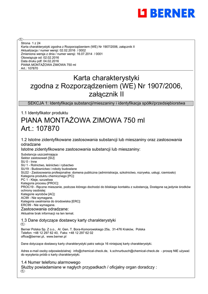 Strona 1 z 24 Karta charakterystyki zgodna z Rozporządzeniem (WE) Nr 1907/2006, załącznik II Aktualizacja / numer wersji: 02.02.2016 / 0002 Zmieniona wersja z dnia / numer wersji: 16.07.2014 / 0001 Obowiązuje od: 02.02.2016 Data druku pdf: 04.02.2016 PIANA MONTAŻOWA ZIMOWA 750 ml Art.: 107870 Karta charakterystyki zgodna z Rozporządzeniem (WE) Nr 1907/2006, załącznik II SEKCJA 1: Identyfikacja substancji/mieszaniny i identyfikacja spółki/przedsiębiorstwa 1.1 Identyfikator produktu PIANA MONTAŻOWA ZIMOWA 750 ml Art.: 107870 1.2 Istotne zidentyfikowane zastosowania substancji lub mieszaniny oraz zastosowania odradzane Istotne zidentyfikowane zastosowania substancji lub mieszaniny: Substancja uszczelniająca Sektor zastosowań [SU]: SU 0 - Inne SU 1 - Rolnictwo, leśnictwo i rybactwo SU19 - Budownictwo i roboty budowlane SU22 - Zastosowania profesjonalne: domena publiczna (administracja, szkolnictwo, rozrywka, usługi, rzemiosło) Kategoria produktu chemicznego [PC]: PC 1 - Kleje, szczeliwa Kategoria procesu [PROC]: PROC19 - Ręczne mieszanie, podczas którego dochodzi do bliskiego kontaktu z substancją. Dostępne są jedynie środków ochrony osobistej Kategorie wyrobów [AC]: AC99 - Nie wymagane. Kategoria uwalniania do środowiska [ERC]: ERC99 - Nie wymagane. Zastosowania odradzane: Aktualnie brak informacji na ten temat. 1.3 Dane dotyczące dostawcy karty charakterystyki Berner Polska Sp. Z o.o., Al. Gen. T. Bora-Komorowskiego 25a, 31-476 Kraków, Polska Telefon: +48 12 297 62 40, Faks: +48 12 297 62 02 [email protected], www.berner.pl Dane dotyczące dostawcy karty charakterystyki patrz sekcja 16 niniejszej karty charakterystyki. Adres e-mail osoby odpowiedzialnej: [email protected], [email protected] - proszę NIE używać do wysyłania próśb o karty charakterystyki. 1.4 Numer telefonu alarmowego Służby powiadamiane w nagłych przypadkach / oficjalny organ doradczy : Strona 2 z 24 Karta charakterystyki zgodna z Rozporządzeniem (WE) Nr 1907/2006, załącznik II Aktualizacja / numer wersji: 02.02.2016 / 0002 Zmieniona wersja z dnia / numer wersji: 16.07.2014 / 0001 Obowiązuje od: 02.02.2016 Data druku pdf: 04.02.2016 PIANA MONTAŻOWA ZIMOWA 750 ml Art.: 107870 Centrum Informacji Toksykologicznej - Gdańsk. NZOZ Pomorskie Centrum Toksykologii, ul. Kartuska 4/6, 80-104 Gdańsk. Telefon alarmowy (24 h): (058) 682 04 04 Numer alarmowy spółki: +49 (0) 700 / 24 112 112 (BRC) SEKCJA 2: Identyfikacja zagrożeń 2.1 Klasyfikacja substancji lub mieszaniny Klasyfikacja zgodnie z rozporządzeniem (WE) Nr 1272/2008 (CLP) Klasa Kategoria Zwrot określający zagrożenie zagrożenia zagrożenia Eye Irrit. 2 H319-Działa drażniąco na oczy. STOT SE 3 H335-Może powodować podrażnienie dróg oddechowych. Skin Irrit. 2 H315-Działa drażniąco na skórę. Resp. Sens. 1 H334-Może powodować objawy alergii lub astmy lub trudności w oddychaniu w następstwie wdychania. Skin Sens. 1 H317-Może powodować reakcję alergiczną skóry. STOT RE 2 H373-Może powodować uszkodzenie narządów poprzez długotrwałe lub narażenie powtarzane. Lact. Dodatkowa kategoria H362-Może działać szkodliwie na dzieci karmione piersią. Carc. 2 H351-Podejrzewa się, że powoduje raka. Aquatic Chronic 4 H413-Może powodować długotrwałe szkodliwe skutki dla organizmów wodnych. Aerosol 1 H222-Skrajnie łatwopalny aerozol. Aerosol 1 H229-Pojemnik pod ciśnieniem: Ogrzanie grozi wybuchem. 2.2 Elementy oznakowania Oznakowanie zgodnie z rozporządzeniem (WE) Nr 1272/2008 (CLP) Niebezpieczeństwo Strona 3 z 24 Karta charakterystyki zgodna z Rozporządzeniem (WE) Nr 1907/2006, załącznik II Aktualizacja / numer wersji: 02.02.2016 / 0002 Zmieniona wersja z dnia / numer wersji: 16.07.2014 / 0001 Obowiązuje od: 02.02.2016 Data druku pdf: 04.02.2016 PIANA MONTAŻOWA ZIMOWA 750 ml Art.: 107870 H319-Działa drażniąco na oczy. H335-Może powodować podrażnienie dróg oddechowych. H315-Działa drażniąco na skórę. H334-Może powodować objawy alergii lub astmy lub trudności w oddychaniu w następstwie wdychania. H317Może powodować reakcję alergiczną skóry. H373-Może powodować uszkodzenie narządów poprzez długotrwałe lub narażenie powtarzane. H362-Może działać szkodliwie na dzieci karmione piersią. H351-Podejrzewa się, że powoduje raka. H413-Może powodować długotrwałe szkodliwe skutki dla organizmów wodnych. H222-Skrajnie łatwopalny aerozol. H229-Pojemnik pod ciśnieniem: Ogrzanie grozi wybuchem. P210-Przechowywać z dala od źródeł ciepła, gorących powierzchni, źródeł iskrzenia, otwartego ognia i innych źródeł zapłonu. Nie palić. P211-Nie rozpylać nad otwartym ogniem lub innym źródłem zapłonu. P251-Nie przekłuwać ani nie spalać, nawet po zużyciu. P260-Nie wdychać par i rozpylonej cieczy. P263-Unikać kontaktu w czasie ciąży/karmienia piersią. P280-Stosować rękawice ochronne/odzież ochronną i ochronę twarzy/oczu. P284-Stosować indywidualne środki ochrony dróg oddechowych. P304+P340-W PRZYPADKU DOSTANIA SIĘ DO DRÓG ODDECHOWYCH: wyprowadzić lub wynieść poszkodowanego na świeże powietrze i zapewnić mu warunki do swobodnego oddychania. P308+P313-W przypadku narażenia lub styczności: Zasięgnąć porady/zgłosić się pod opiekę lekarza. P410+P412-Chronić przed światłem słonecznym. Nie wystawiać na działanie temperatury przekraczającej 50 °C. EUH204-Zawiera izocyjaniany. Może powodować wystąpienie reakcji alergicznej. Bez wystarczającej wentylacji możliwość tworzenia się mieszanek wybuchowych. diizocyjanian difenylometanu, mieszanina izomerów i homologów Alkany, C14-17, chloro 2.3 Inne zagrożenia Mieszanina nie zawiera substancji vPvB (vPvB = very persistent, very bioaccumulative) bądź nie jest wykazana w załączniku XIII rozporządzenia (WE) 1907/2006. Mieszanina nie zawiera substancji PBT (PBT = persistent, bioaccumulative, toxic) bądź nie jest wykazana w załączniku XIII rozporządzenia (WE) 1907/2006. SEKCJA 3: Skł