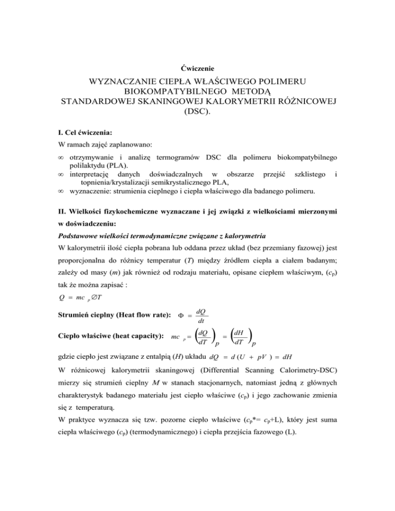 Ćwiczenie WYZNACZANIE CIEPŁA WŁAŚCIWEGO POLIMERU BIOKOMPATYBILNEGO METODĄ STANDARDOWEJ SKANINGOWEJ KALORYMETRII RÓŻNICOWEJ (DSC). I. Cel ćwiczenia: W ramach zajęć zaplanowano: • • • otrzymywanie i analizę termogramów DSC dla polimeru biokompatybilnego polilaktydu (PLA). interpretację danych doświadczalnych w obszarze przejść szklistego i topnienia/krystalizacji semikrystalicznego PLA, wyznaczenie: strumienia cieplnego i ciepła właściwego dla badanego polimeru. II. Wielkości fizykochemiczne wyznaczane i jej związki z wielkościami mierzonymi w doświadczeniu: Podstawowe wielkości termodynamiczne związane z kalorymetria W kalorymetrii ilość ciepła pobrana lub oddana przez układ (bez przemiany fazowej) jest proporcjonalna do różnicy temperatur (T) między źródłem ciepła a ciałem badanym; zależy od masy (m) jak również od rodzaju materiału, opisane ciepłem właściwym, (cp) tak że można zapisać : Q = mc p ∆ T Strumień cieplny (Heat flow rate): Φ = dQ dt ( ) ( ) Ciepło właściwe (heat capacity): mc p = dQ dT = p dH dT p gdzie ciepło jest związane z entalpią (H) układu dQ = d (U + pV ) = dH W różnicowej kalorymetrii skaningowej (Differential Scanning Calorimetry-DSC) mierzy się strumień cieplny Μ w stanach stacjonarnych, natomiast jedną z głównych charakterystyk badanego materiału jest ciepło właściwe (cp) i jego zachowanie zmienia się z temperaturą. W praktyce wyznacza się tzw. pozorne ciepło właściwe (cp*= cp+L), który jest suma ciepła właściwego (cp) (termodynamicznego) i ciepła przejścia fazowego (L). W standardowej różnicowej kalorymetrii skaningowej (DSC) stosuje się liniowy program wzrostu temperatury: T ( t ) = T 0 + qt Różnicowa kalorymetria skaningowa ( Differential Scanning Calorimetry-DSC) Standardowa DSC W różnicowej kalorymetrii skaningowej (DSC) stosuje się liniowy program wzrostu temperatury: Różnicowa kalorymetria skaningowa Różnicowa kalorymetria skaningowa Strumień cieplny (Heat flow rate) Φ= dQ dt Ciepło właściwe (heat capacity): Q = mc p ∆T Φ= dQ dT = mc p = mc p q dt dt Φ= mc p = K∆T Φ = q q dQ = K∆T dt Odpowiedzią układu jest strumień cieplny, z którego można otrzymać ciepło właściwe zgodnie z powyższym schematem. Standard DSC (Q1000 TA Inst ) Endotherm 10 mW Heat - flow Rate PLA -H PLA -L 300 350 400 450 Temperature (K) Rysunek 1 Strumień cieplny dla PLA dla różnej zawartości D-isomerycznej formy. -1 -1. 400 Standard DSC (Q1000 TA Inst ) semicrystalline PLA-L . Heat Capacity (J K mol ) 500 300 amorphous PLA-H 200 100 300 320 340 360 380 400 420 440 460 Temperature (K) Rysunek 2 Przestawia przykład całkowitego ciepła właściwego dla PLA z Rys. 1. III. Odczynniki i aparatura: 1. Próbki polimerów: polilaktydu (PLA) 2. Tygle aluminiowe (pans) do umieszczenia próbek; 3. Układ do przygotowania próbki (prasa do zamykania tygli); 4. Zestaw kalorymetryczny (DSC) składający się z : różnicowej kalorymetrii skaningowej TDSC – Q1000 TA Instrument; zestaw do chłodzenia (intracooler); komputer z oprogramowaniem TA Inst. do kontroli doświadczenia i analizy; 5. Waga analityczna; 6. Pęseta i nóż; IV. Przebieg ćwiczenia: 1. Przygotować próbkę polimeru o masie 10- 30 mg w tyglu używając specjalnej prasy, włóż próbkę i referencyjny tygiel do komory DSC; 2. Uruchomić na 10-15 min przepływ azotu przez intracooler z prędkością 50ml/min (przed uruchomieniem intracoolera). 3. Włączyć DSC 4. Włączyć komputera: należy się zalogować komputer z oprogramowaniem TA Inst. do kontroli doświadczenia. 5. Włączyć intracooler temperatura w celce pomiarowej automatycznie obniża się poniżej 0°C do minimalnej temperatury ok. –90°C. Po uruchomieniu dowolnego pomiaru i jego zresetowaniu temperatura w celce pomiarowej wynosić będzie 30°C (temp. „stand by”). 5. Przebieg pomiaru: Wybierz metodę pomiaru: tzn. należy wybrać istniejący lub podać nowy przebieg temperaturowy ( z możliwa jest kombinacja przebiegów grzania, chłodzenia z różnym przyrostem temperatury oraz przebiegi izotermiczne); każdą nową metodę należy nazwać; Podaj nazwę analizowanej substancji (Sample Name) i jej masy (Size); ustawić w Summery tab: mode: standard DSC …Procedure tab: ustalić metodę.. Notes tab: dodaj zadane informacje. Zakończ przez wduszenie hasła : Apply. Aby eksperyment rozpocząć naciśnij: Control, Start. Dane są rejestruje automatycznie Po skończonych pomiarach prowadzący zamyka okna dialogowe DSC i kalorymetr. V. Opracowanie wyników-analiza : Wyniki pomiarów opracować przy pomocy oprogramowania Universal Analysis software -TA Instrument. Program TA Inst rejestruje automatycznie krzywą DSC. analizować termogramy: strumienia cieplnego w funkcji czasu lub temperatury przeanalizować obszar ciekawe dla danego polimeru, wyznaczyć charakterystyki pomiaru, dla DSC przeanalizować dane doświadczalne w obszarze przejść: zeszklenia i topnienia/krystalizacji, wyznaczenie strumienia cieplnego i ciepła właściwego dla badanego polimeru. VI. Sprawozdanie: Sprawozdanie z przeprowadzonego ćwiczenia powinno zawierać: nazwiska wykonawców, datę i tytuł przeprowadzonego ćwiczenia; krótki opis zastosowanej metody (maksymalnie 1 strona formatu A4); rodzaj aparatury i odczynników wykorzystanych w ćwiczeniu; warunki pomiarów; opracowanie wyników analiza i omówienie wyników. VII. Zagadnienia literaturowe do kolokwium: 1. Rodzaje kalorymetrycznych metod. 2. Zasada oznaczania parametrów polimerów metodą różnicowej kalorymetrii skaningowej (DSC ) . 3. Interpretację danych doświadczalnych z DSC: strumienia cieplnego i ciepła właściwego dla badanych polimerów LITERATURA 1. B. Wunderlich, Macromolecular Physics, Vol. 1, 2,3; Academic Press, PDF Reprint of the book published in 1973 with a new Preface, Knoxville, 2005. 2. M. Pyda, R. C. Bopp, and B. Wunderlich, Heat Capacity of Poly(lactic Acid) J. Chem. Thermodynami