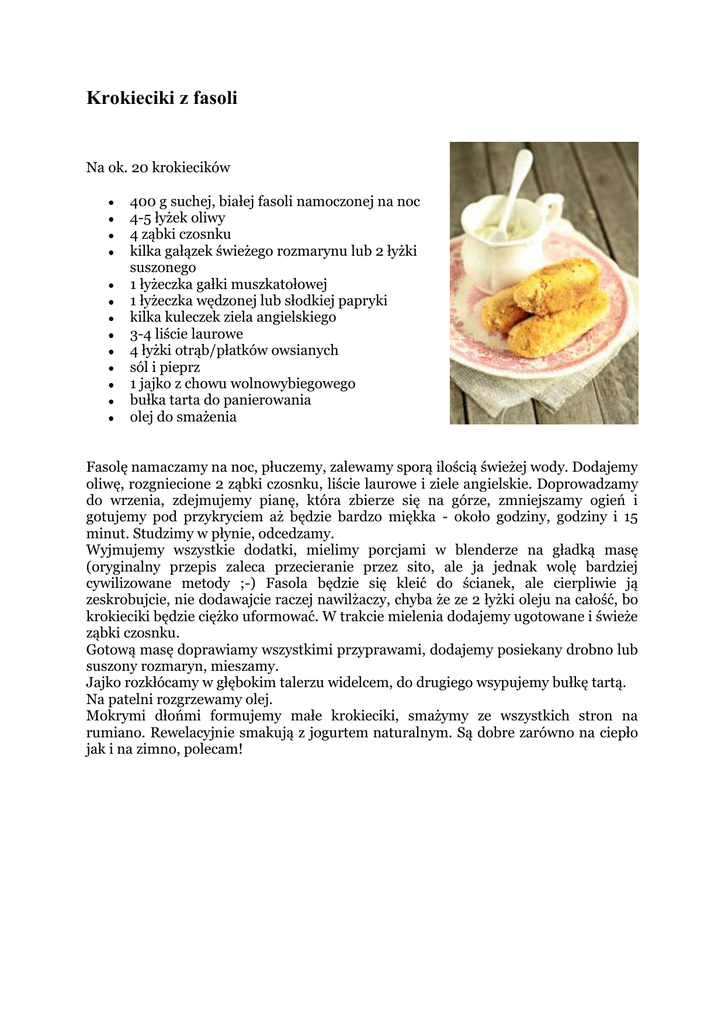 Krokieciki z fasoli Na ok. 20 krokiecików 400 g suchej, białej fasoli namoczonej na noc 4-5 łyżek oliwy 4 ząbki czosnku kilka gałązek świeżego rozmarynu lub 2 łyżki suszonego 1 łyżeczka gałki muszkatołowej 1 łyżeczka wędzonej lub słodkiej papryki kilka kuleczek ziela angielskiego 3-4 liście laurowe 4 łyżki otrąb/płatków owsianych sól i pieprz 1 jajko z chowu wolnowybiegowego bułka tarta do panierowania olej do smażenia Fasolę namaczamy na noc, płuczemy, zalewamy sporą ilością świeżej wody. Dodajemy oliwę, rozgniecione 2 ząbki czosnku, liście laurowe i ziele angielskie. Doprowadzamy do wrzenia, zdejmujemy pianę, która zbierze się na górze, zmniejszamy ogień i gotujemy pod przykryciem aż będzie bardzo miękka - około godziny, godziny i 15 minut. Studzimy w płynie, odcedzamy. Wyjmujemy wszystkie dodatki, mielimy porcjami w blenderze na gładką masę (oryginalny przepis zaleca przecieranie przez sito, ale ja jednak wolę bardziej cywilizowane metody ;-) Fasola będzie się kleić do ścianek, ale cierpliwie ją zeskrobujcie, nie dodawajcie raczej nawilżaczy, chyba że ze 2 łyżki oleju na całość, bo krokieciki będzie ciężko uformować. W trakcie mielenia dodajemy ugotowane i świeże ząbki czosnku. Gotową masę doprawiamy wszystkimi przyprawami, dodajemy posiekany drobno lub suszony rozmaryn, mieszamy. Jajko rozkłócamy w głębokim talerzu widelcem, do drugiego wsypujemy bułkę tartą. Na patelni rozgrzewamy olej. Mokrymi dłońmi formujemy małe krokieciki, smażymy ze wszystkich stron na rumiano. Rewelacyjnie smakują z jogurtem naturalnym. Są dobre zarówno na ciepło jak i na zimno, polecam!
