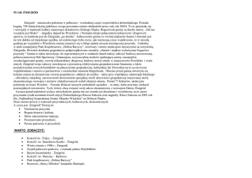 55-140 ŻMIGRÓD Żmigród – miasteczko położone w północno - wschodniej części województwa dolnośląskiego. Posiada bogatą, 750-letnią historią (jubileusz swego powstania miasto obchodziło przez cały rok 2003). To tu spotykały się i rozwijały w harmonii kultury stanowiące dziedzictwo Dolnego Śląska. Bogactwem gminy są skarby natury. „Od nas wszędzie jest blisko” – dogodny dojazd do Wrocławia i Poznania dzięki połączeniom kolejowym i drogowym sprawia, że każdemu jest do Żmigrodu „po drodze”. Jednocześnie gmina ze swoimi pięknymi lasami i stawami jest na tyle daleko od miejskiego zgiełku, od szaleńczego trybu życia, jaki narzucają czasy współczesne, że w niecałą godzinę po wyjeździe z Wrocławia można zanurzyć się w błogi spokój niczym niezmąconej przyrody. Unikalny w skali europejskiej Park Krajobrazowy „Dolina Baryczy", rezerwaty i tereny atrakcyjnie turystycznie są wizytówką Żmigrodu. Również działania gospodarcze podporządkowano zasadzie „chronić i mądrze wykorzystać bogactwo przyrody." Gmina to także inwestycje: do najważniejszych w ostatnich latach należy zaliczyć budowę nowoczesnej, pełnowymiarowej Hali Sportowej i Gimnazjum, oczyszczalnię ścieków spełniającą normy europejskie, zwodociągowanie gminy, rozwój infrastruktury drogowej, budowę nowej szkoły w miejscowości Powidzko i wiele innych. Żmigród swoje sukcesy zawdzięcza z pewnością efektywnemu gospodarowaniu finansami, a także poszukiwaniom nowych kontaktów na płaszczyźnie gospodarczej, kulturalnej itd. Dowodem na to są ożywione współdziałania i umowa o partnerstwie z niemieckim miastem Bargteheide. Obecnie przed gminą otworzyła się kolejna szansa na dynamiczny rozwój gospodarczy: oddanie do użytku – także przy współpracy samorządu lokalnego – obwodnicy miejskiej, zaowocowało utworzeniem specjalnej strefy aktywności gospodarczej (nazywanej strefą ekonomicznego rozwoju) z terenów zlokalizowanych wokół obejścia miasta. Ponad 77 hektarów, atrakcyjne położenie na trasie Wrocław – Poznań, bliskość naszych zachodnich sąsiadów – to atuty, które powinny zachęcić potencjalnych inwestorów. Tych, którzy chcą związać swój sukces ekonomiczny z rozwojem Gminy Żmigród. Licząca ponad piętnaście tysięcy mieszkańców gmina nie raz została już doceniona i wyróżniona, m.in. przez przyznanie tytułu nominata trzech edycji Dolnośląskiego Klucza Sukcesu oraz nagrody: Klucz Sukcesu za 2001 rok dla „Najbardziej Gospodarnej Gminy Miejsko-Wiejskiej” na Dolnym Śląsku. Dużo można mówić o walorach przyrodniczych, kulturowych, ekonomicznych. A czym jest Żmigród? Dzisiaj to: • Nieskażona przyroda. • Bogata historia i kultura. • Silnie zakorzeniona tradycja. • Poszanowanie przeszłości. • Pewne patrzenie w przyszłość. WARTO ZOBACZYĆ: • • • • • • • • Kościół św. Trójcy – Żmigród. Kościół św. Stanisława Kostki – Żmigród. Wieża ciśnień z 1900 r.- Żmigród. Zespół pałacowo-parkowy z ruinami pałacu Hatzfeldtów. Baszta kasztelańska – Żmigród. Kościół św. Marcina - Barkowo Park krajobrazowy „Dolina Baryczy” Rezerwat „Stawy Milickie” kompleks Radziądz. ADMINISTRACJA Urząd Miejski czynny od poniedziałku do piątku w godz. 7.30 – 15.30 w środy w godz. 7.30 – 16.30 Żmigród, pl. Wojska Polskiego 2-3 tel. 071 385 30 57, fax. 071 385 35 56 e-mail:[email protected] www.zmigrod.com.pl www.sgtbarycz.trzebnica.net ------------------------------- 1 Urząd Miejski w godz. 7.30 – 15.30 w środy w godz. 7.30 – 16.30 Żmigród , pl. Wojska Polskiego 2-3 tel. 071 385 30 57, fax. 071 385 35 56 e-mail:[email protected] www.zmigrod.com.pl www.sgtbarycz.trzebnica.net 2 Zespół Placówek Kultury, czynny od poniedziałku do piątku w godz. 8.00 – 20.00 Żmigród, ul. Wrocławska 12 Tel 0-71 385 31 34 Fax 0-71 385 27 45 www.zpkzmgrod.pl e-mail: [email protected] INFORMACJA TURYSTYCZNA PLAN IMPREZ CYLICZNYCH KULTURALNYCH, SPORTOWYCH ORAZ SPORTOWO – REKREACYJNYCH ORGANIZOWANYCH W 2006 ROKU Zespół Placówek Kultury w Żmigrodzie jest instytucją, którą tworzą zarówno ośrodki kultury w Żmigrodzie i Korzeńsku, jak i biblioteki publiczne w Żmigrodzie, Korzeńsku, Radziądzu, Powidzku i Barkowie, oraz świetlice wiejskie w Barkowie, Borkach, Borzęcinie, Bychowie, Chodlewie, Dębnie, Dobrosławicach, Gatce, Garbcach, Grądziku, Kaszycach Milickich, Kędziach, Kliszkowicach, Książęcej Wsi, Karnicach, Laskowie, Łapczycach, Marzęcinie, Niezgodzie, Osieku, Powidzku, Radziądzu, Saniach, Kanclerzowicach i Żmigródku. Zespół Placówek Kultury jest także opiekunem Ośrodka Sportu i Rekreacji w Żmigrodzie, na którym znajduje się zabytkowy basen kąpielowy (czynny od czerwca do sierpnia). Ta różnorodność pozwala na organizowanie imprez kulturalnych i rekreacyjnych, które są adresowane do szerokich kręgów odbiorców. Żmigrodzki Ośrodek Kultury czynny jest codziennie od godziny 7.00 do 21.00. Działają tu sekcje: • Taneczna dla dzieci • Taneczna dla młodzieży • Muzyczna • Plastyczna • Szachowa • Tenisa stołowego • Gier karcianych – „Magic the gathering” • Sztuki walki – „Capoeira” Budynek jest udostępniany wszystkim, którzy chcą rozwijać swoje zainteresowania. W ośrodku kultury mają swoje próby zespoły: Mini – Max, Drum, Adrenalina, Sanhedryn, Ripper oraz Suwatur. Przy ZPK w Żmigrodzie działa zespół ludowy i kapela ludowa „DYSZEL” oraz „Klub Seniora” Z ZPK współpracują szkoły podstawowe, gimnazja z gminy Żmigród oraz opiekunowie dzieci ze świetlicy socjoterapeutycznej „Tęcza”. Sama świetlica mieści się w budynku Biblioteki Publicznej w Żmigrodzie. Tamże od 5 listopada 2005 roku funkcjonuje Gminne Centrum Informacji, które dostępne jest od godz. 8.00 do godz. 18.00 przez sześć dni w tygodniu. W Żmigrodzkim Ośrodku Kultury znajduje się równ