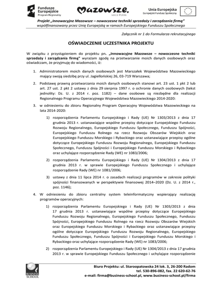 Projekt „Innowacyjne Mazowsze – nowoczesne techniki sprzedaży i zarządzania firmą” współfinansowany przez Unię Europejską w ramach Europejskiego Funduszu Społecznego Załącznik nr 1 do Formularza rekrutacyjnego OŚWIADCZENIE UCZESTNIKA PROJEKTU W związku z przystąpieniem do projektu pn. „Innowacyjne Mazowsze – nowoczesne techniki sprzedaży i zarządzania firmą” wyrażam zgodę na przetwarzanie moich danych osobowych oraz oświadczam, że przyjmuję do wiadomości, iż: 1. Administratorem moich danych osobowych jest Marszałek Województwa Mazowieckiego mający swoją siedzibę przy ul. Jagiellońskiej 26, 03-719 Warszawa; 2. Podstawę prawną przetwarzania moich danych osobowych stanowi art. 23 ust. 1 pkt 2 lub art. 27 ust. 2 pkt 2 ustawy z dnia 29 sierpnia 1997 r. o ochronie danych osobowych (tekst jednolity: Dz. U. z 2014 r. poz. 1182) – dane osobowe są niezbędne dla realizacji Regionalnego Programu Operacyjnego Województwa Mazowieckiego 2014-2020: 3. w odniesieniu do zbioru Regionalny Program Operacyjny Województwa Mazowieckiego na lata 2014-2020: 1) rozporządzenia Parlamentu Europejskiego i Rady (UE) Nr 1303/2013 z dnia 17 grudnia 2013 r. ustanawiające wspólne przepisy dotyczące Europejskiego Funduszu Rozwoju Regionalnego, Europejskiego Funduszu Społecznego, Funduszu Spójności, Europejskiego Funduszu Rolnego na rzecz Rozwoju Obszarów Wiejskich oraz Europejskiego Funduszu Morskiego i Rybackiego oraz ustanawiające przepisy ogólne dotyczące Europejskiego Funduszu Rozwoju Regionalnego, Europejskiego Funduszu Społecznego, Funduszu Spójności i Europejskiego Funduszu Morskiego i Rybackiego oraz uchylające rozporządzenie Rady (WE) nr 1083/2006; 2) rozporządzenia Parlamentu Europejskiego i Rady (UE) Nr 1304/2013 z dnia 17 grudnia 2013 r. w sprawie Europejskiego Funduszu Społecznego i uchylające rozporządzenie Rady (WE) nr 1081/2006; 3) ustawy z dnia 11 lipca 2014 r. o zasadach realizacji programów w zakresie polityki spójności finansowanych w perspektywie finansowej 2014–2020 (Dz. U. z 2014 r., poz. 1146); 4. W odniesieniu do zbioru centralny system teleinformatyczny wspierający realizację programów operacyjnych: 1) rozporządzenia Parlamentu Europejskiego i Rady (UE) Nr 1303/2013 z dnia 17 grudnia 2013 r. ustanawiające wspólne przepisy dotyczące Europejskiego Funduszu Rozwoju Regionalnego, Europejskiego Funduszu Społecznego, Funduszu Spójności, Europejskiego Funduszu Rolnego na rzecz Rozwoju Obszarów Wiejskich oraz Europejskiego Funduszu Morskiego i Rybackiego oraz ustanawiające przepisy ogólne dotyczące Europejskiego Funduszu Rozwoju Regionalnego, Europejskiego Funduszu Społecznego, Funduszu Spójności i Europejskiego Funduszu Morskiego i Rybackiego oraz uchylające rozporządzenie Rady (WE) nr 1083/2006; 2) rozporządzenia Parlamentu Europejskiego i Rady (UE) Nr 1304/2013 z dnia 17 grudnia 2013 r. w sprawie Europejskiego Funduszu Społecznego i uchylające rozporządzenie Biuro Projektu: ul. Staroopatowska 24 lok. 3, 26-200 Radom tel. 530-896-082, fax. 22 620-62-76 e-mail: [email protected], www.business-school.pl/firma Projekt „Innowacyjne Mazowsze – nowoczesne techniki sprzedaży i zarządzania firmą” współfinansowany przez Unię Europejską w ramach Europejskiego Funduszu Społecznego Rady (WE) nr 1081/2006; 3) ustawy z dnia 11 lipca 2014 r. o zasadach realizacji programów w zakresie polityki spójności finansowanych w perspektywie finansowej 2014–2020 (Dz. U. z 2014 r., poz. 1146); 4) rozporządzenia Wykonawczego Komisji (UE) Nr 1011/2014 z dnia 22 września 2014 r. ustanawiające szczegółowe przepisy wykonawcze do rozporządzenia Parlamentu Europejskiego i Rady (UE) nr 1303/2013 w odniesieniu do wzorów służących do przekazywania Komisji określonych informacji oraz szczegółowe przepisy dotyczące wymiany informacji między beneficjentami a instytucjami zarządzającymi, certyfikującymi, audytowymi i pośredniczącymi; 5. Moje dane osobowe będą przetwarzane wyłącznie w celu realizacji projektu . „Innowacyjne Mazowsze – nowoczesne techniki sprzedaży i zarządzania firmą”, w szczególności potwierdzenia kwalifikowalności wydatków, udzielenia wsparcia, monitoringu, ewaluacji, kontroli, audytu i sprawozdawczości oraz działań informacyjno-promocyjnych w ramach Regionalnego Programu Operacyjnego Województwa Mazowieckiego 2014-2020 (RPO WM); 6. Moje dane osobowe zostały powierzone do przetwarzania Instytucji Pośredniczącej – Mazowieckiej Jednostki Wdrażania Programów Unijnych ul. Jagiellońska 74, 03-301 Warszawa beneficjentowi realizującemu projekt . „Innowacyjne Mazowsze – nowoczesne techniki sprzedaży i zarządzania firmą” – Business School Hanna Polak, Marcin Polak Spółka Jawna ul. Bagatela 13, 00-585 Warszawa oraz podmiotom, które na zlecenie beneficjenta uczestniczą w realizacji projektu. Moje dane osobowe mogą zostać przekazane podmiotom realizującym badania ewaluacyjne na zlecenie Powierzającego, Instytucji Pośredniczącej lub beneficjenta. Moje dane osobowe mogą zostać również powierzone specjalistycznym firmom, realizującym na zlecenie Powierzającego, Instytucji Pośredniczącej oraz beneficjenta kontrole i audyt w ramach Regionalnego Programu Operacyjnego Województwa Mazowieckiego na lata 2014-2020; 7. Podanie danych jest dobrowolne, aczkolwiek odmowa ich podania jest równoznaczna z brakiem możliwości udzielenia wsparcia w ramach projektu; 8. W ciągu 4 tygodni po zakończeniu udziału w projekcie udostępnię dane dot. mojego statusu na rynku pracy oraz informacje nt. udziału w kształceniu lub szkoleniu oraz uzyskania kwalifikacji lub nabycia kompetencji; 9. Mam prawo dostępu do treści swoich danych i ich poprawiania. …………………………………………………… ……………………………………………………….…………… MIEJSCOWOŚĆ I DATA CZYTELNY PODPIS UCZESTNIKA PROJEKTU Biuro Projektu: ul