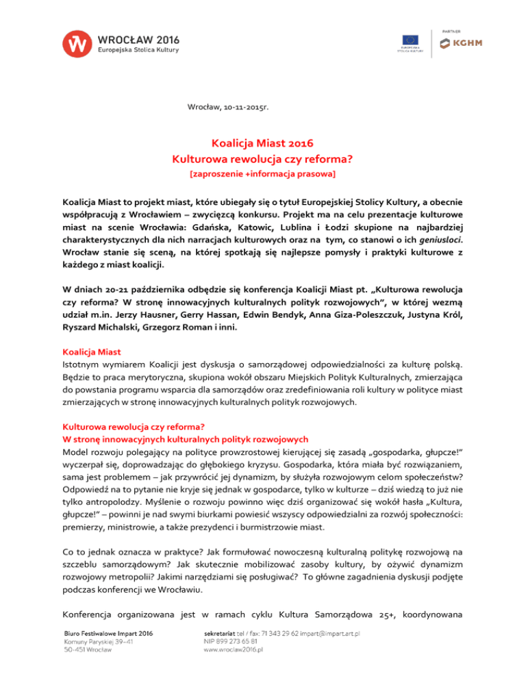 Wrocław, 10-11-2015r. Koalicja Miast 2016 Kulturowa rewolucja czy reforma? [zaproszenie +informacja prasowa] Koalicja Miast to projekt miast, które ubiegały się o tytuł Europejskiej Stolicy Kultury, a obecnie współpracują z Wrocławiem – zwycięzcą konkursu. Projekt ma na celu prezentacje kulturowe miast na scenie Wrocławia: Gdańska, Katowic, Lublina i Łodzi skupione na najbardziej charakterystycznych dla nich narracjach kulturowych oraz na tym, co stanowi o ich geniusloci. Wrocław stanie się sceną, na której spotkają się najlepsze pomysły i praktyki kulturowe z każdego z miast koalicji. W dniach 20-21 października odbędzie się konferencja Koalicji Miast pt. „Kulturowa rewolucja czy reforma? W stronę innowacyjnych kulturalnych polityk rozwojowych”, w której wezmą udział m.in. Jerzy Hausner, Gerry Hassan, Edwin Bendyk, Anna Giza-Poleszczuk, Justyna Król, Ryszard Michalski, Grzegorz Roman i inni. Koalicja Miast Istotnym wymiarem Koalicji jest dyskusja o samorządowej odpowiedzialności za kulturę polską. Będzie to praca merytoryczna, skupiona wokół obszaru Miejskich Polityk Kulturalnych, zmierzająca do powstania programu wsparcia dla samorządów oraz zredefiniowania roli kultury w polityce miast zmierzających w stronę innowacyjnych kulturalnych polityk rozwojowych. Kulturowa rewolucja czy reforma? W stronę innowacyjnych kulturalnych polityk rozwojowych Model rozwoju polegający na polityce prowzrostowej kierującej się zasadą „gospodarka, głupcze!” wyczerpał się, doprowadzając do głębokiego kryzysu. Gospodarka, która miała być rozwiązaniem, sama jest problemem – jak przywrócić jej dynamizm, by służyła rozwojowym celom społeczeństw? Odpowiedź na to pytanie nie kryje się jednak w gospodarce, tylko w kulturze – dziś wiedzą to już nie tylko antropolodzy. Myślenie o rozwoju powinno więc dziś organizować się wokół hasła „Kultura, głupcze!” – powinni je nad swymi biurkami powiesić wszyscy odpowiedzialni za rozwój społeczności: premierzy, ministrowie, a także prezydenci i burmistrzowie miast. Co to jednak oznacza w praktyce? Jak formułować nowoczesną kulturalną politykę rozwojową na szczeblu samorządowym? Jak skutecznie mobilizować zasoby kultury, by ożywić dynamizm rozwojowy metropolii? Jakimi narzędziami się posługiwać? To główne zagadnienia dyskusji podjęte podczas konferencji we Wrocławiu. Konferencja organizowana jest w ramach cyklu Kultura Samorządowa 25+, koordynowana przez Narodowe Centrum Kultury, współorganizowana przez Biuro Europejskiej Stolicy Kultury Wrocław 2016. Projekt finansowany ze środków Ministerstwa Kultury i Dziedzictwa Narodowego. PROGRAM 20 października Część I – zamknięta 09.30 – 11.30 Skierowana bezpośrednio do przedstawicieli Koalicji Miast 2016: Gdańsk, Katowice, Lublin, Łódź, Wrocław. Część II – zamknięta 11:30 – 13.00 Spotkanie Komisji Unii Metropolii Polskich ds. Kultury i Sportu przedstawiciele 12 miast członkowskich UMP. Dyskusja w gronie osób odpowiedzialnych za metropolitalne polityki kulturalne o wyzwaniach tych polityk. 13:00 – 14.00 Przerwa Obiadowa Część III – otwarta 14.00 – Otwarcie konferencji 14.00 – 15.00 Wykład inauguracyjny: Gerry Hassan (tbc), Dreaming the City, o doświadczeniu Glasgow jako Europejskiej Stolicy Kultury i miasta foresightu społecznego. 15.00 – 16.30 Od rządzenia do współzarządzania. Foresight społeczny jako praktyka uspołecznienia zarządzania przyszłością i rozwojem. Wprowadzenie: Anna Giza-Poleszczuk – foresight społeczny jako narzędzie zarządzania zmianą społeczną i kulturową; Dyskusja panelowa: Justyna Król, Ryszard Michalski, Grzegorz Roman. 17.00 – 18.30 Dobre praktyki: prezentacja przykładów innowacji w polityce kulturalnej. Panel otwarty. 21 października 2015 r. 10.00 – 10.45 Wprowadzenie: Jerzy Hausner – Zrozumieć rozwój. 10.45 – 12.15 Dyskusja Panelowa : Od polityki kulturalnej do kulturalnej polityki rozwojowej z udziałem Prezydentów Miast Koalicji 2016. 12.30 – 14.00 Giełda wyzwań i problemów: odwrócenie giełdy innowacji zamiast propozycji rozwiązań miasta prezentują wyzwania, z jakimi się mierzą. Może ktoś zna rozwiązanie? Wie, gdzie takiego rozwiązania szukać? Panel otwarty. 14:00 – 15.00 Przerwa Obiadowa 15.00 – 17.00 Dyskusja o tym, jak wymieniać się wiedzą, doświadczeniem, praktyką; Moderacja:Paweł Kubicki Prezentacja platformy „Kultura i rozwój” (magazyn naukowy i serwis internetowy pod redakcją Jerzego Hausnera i Edwina Bendyka. Wydawca Narodowe Centrum Kultury). Prezentacja innych rozwiązań systemowych służących wymianie wiedzy i doświadczeń. Otwarta dyskusja możliwości wykorzystania platformy „Kultura i rozwój” przez samorządy lokalne, inne możliwości współpracy i wymiany. 17.00 Podsumowanie konferencji: Edwin Bendyk ZAPRASZAMY! Wrocław Europejska Stolica Kultury2016 Europejska Stolica Kultury Wrocław 2016 to rozpisany na kilka lat z kulminacją w 2016 roku program składający się z 400projektów, w skład których wchodzi około tysiąca wydarzeń artystycznych, festiwali, koncertów i imprez w przestrzeni miejskiej oraz zestaw programów społecznych, kulturalnych i edukacyjnych skierowanych dla mieszkańców Wrocławia. Istotnymi punktami Europejskiej Stolicy Kultury we Wrocławiu są inicjatywy wrocławian współtworzących program ESK m.in. przez program mikroGRANTÓW, czy, zainicjowanych w tym roku, Parków ESK. Nad realizacją planu ESK WRO 2016, wchodzącej w skład strategii rozwoju Wrocławia, pracuje zespół ekspertów, menedżerów, artystów skupionych wokół Biura Europejskiej Stolicy Kultury Wrocław 2016. Program imprez konstruują kuratorzy poszczególnych sekcji (architektura, film, literatura, muzyka, opera, sztuki wizualne, teatr, performance), połączeni spójną wizją miasta – tętniącego kulturą forum. Wrocław jest pierwszym polskim mi
