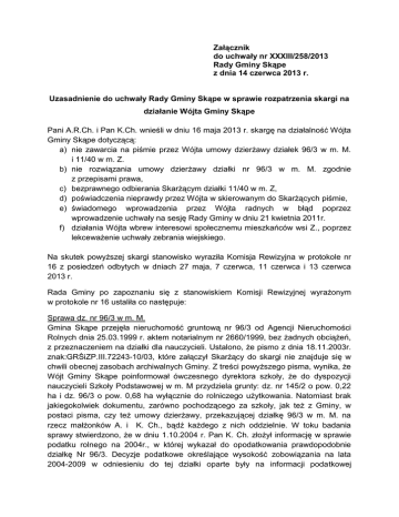 Załącznik do uchwały nr XXXIII/258/2013 Rady Gminy Skąpe z dnia 14 czerwca 2013 r. Uzasadnienie do uchwały Rady Gminy Skąpe w sprawie rozpatrzenia skargi na działanie Wójta Gminy Skąpe Pani A.R.Ch. i Pan K.Ch. wnieśli w dniu 16 maja 2013 r. skargę na działalność Wójta Gminy Skąpe dotyczącą: a) nie zawarcia na piśmie przez Wójta umowy dzierżawy działek 96/3 w m. M. i 11/40 w m. Z. b) nie rozwiązania umowy dzierżawy działki nr 96/3 w m. M. zgodnie z przepisami prawa, c) bezprawnego odbierania Skarżącym działki 11/40 w m. Z, d) poświadczenia nieprawdy przez Wójta w skierowanym do Skarżących piśmie, e) świadomego wprowadzenia przez Wójta radnych w błąd poprzez wprowadzenie uchwały na sesję Rady Gminy w dniu 21 kwietnia 2011r. f) działania Wójta wbrew interesowi społecznemu mieszkańców wsi Z., poprzez lekceważenie uchwały zebrania wiejskiego. Na skutek powyższej skargi stanowisko wyraziła Komisja Rewizyjna w protokole nr 16 z posiedzeń odbytych w dniach 27 maja, 7 czerwca, 11 czerwca i 13 czerwca 2013 r. Rada Gminy po zapoznaniu się z stanowiskiem Komisji Rewizyjnej wyrażonym w protokole nr 16 ustaliła co następuje: Sprawa dz. nr 96/3 w m. M. Gmina Skąpe przejęła nieruchomość gruntową nr 96/3 od Agencji Nieruchomości Rolnych dnia 25.03.1999 r. aktem notarialnym nr 2660/1999, bez żadnych obciążeń, z przeznaczeniem na działki dla nauczycieli. Ustalono, że pismo z dnia 18.11.2003r. znak:GRŚiZP.III.72243-10/03, które załączył Skarżący do skargi nie znajduje się w chwili obecnej zasobach archiwalnych Gminy. Z treści powyższego pisma, wynika, że Wójt Gminy Skąpe poinformował ówczesnego dyrektora szkoły, że do dyspozycji nauczycieli Szkoły Podstawowej w m. M przydziela grunty: dz. nr 145/2 o pow. 0,22 ha i dz. 96/3 o pow. 0,68 ha wyłącznie do rolniczego użytkowania. Natomiast brak jakiegokolwiek dokumentu, zarówno pochodzącego za szkoły, jak też z Gminy, w postaci pisma, czy też umowy dzierżawy, przekazującej działkę 96/3 w m. M. na rzecz małżonków A. i K. Ch., bądź każdego z nich oddzielnie. W toku badania sprawy stwierdzono, że w dniu 1.10.2004 r. Pan K. Ch. złożył informację w sprawie podatku rolnego na 2004r., w której wykazał do opodatkowania prawdopodobnie działkę Nr 96/3. Decyzje podatkowe określające wysokość zobowiązania na lata 2004-2009 w odniesieniu do tej działki oparte były na informacji podatkowej Skarżących. Decyzje podatkowe, przedłożone przez Skarżących obejmowały działkę zgodnie ze złożona przez nich informacją podatkową. Odnosząc się do zarzutu poświadczenia przez Wójta nieprawdy w korespondencji dot. działki nr 96/3 stwierdzono, że wobec braku w dokumentach Gminy pisma z 2003r. użyte sformułowanie nie było poświadczeniem nieprawdy, tylko wyjaśnieniem dokonanym na podstawie posiadanych dokumentów, co wyraźnie wynika z treści pisma. Ponadto z akt sprawy wynika, że Skarżąca pismami z dnia 10.01.2009r. oraz z dnia 13.01.2010 r. zwracała się o przywrócenie prawa do działki nauczycielskiej poł. w M. Wójt Gminy w swoich pismach z dnia 7.01.2010r. i 3.02.2010r. wyjaśniał, że działka nr 96/3 poł. w M. była przedmiotem dzierżawy na rzecz 2 nauczycieli w okresie 16.10.1982 r. do 1.10.1992 r. przy czym ograniczono jej pow. do 0,25 ha dla każdego z nich, co potwierdzają znajdujące się w aktach sprawy pisemne umowy dzierżawy. Badając sprawę, stwierdzono, że ówczesny dyrektor pełniący funkcję do sierpnia 2004r. nie wskazał organowi prowadzącemu nauczycieli, na rzecz których ma zastać przydzielona działka 96/3, jak również w późniejszym okresie nie dokonano żadnego przydziału. Po analizie dokumentów Rada podziela stanowisko komisji, że w sprawie nie nastąpiło naruszenie przepisów a zbycie działki nastąpiło zgodnie z procedurą określoną w ustawie z dnia 21 sierpnia 1997 r. o gospodarce nieruchomościami (Dz.U. z 2004 r. Nr 261, poz.2603 z późn. zm.) poprzedzone zostało umieszczeniem na okres 6 tygodni (25.03.2009 r. – 14.05.2009 r.) wykazu nieruchomości przewidzianych do sprzedaży na tablicy ogłoszeń w Urzędzie Gminy, na stronach internetowych Gminy Skąpe oraz w Gazecie „Dzień za dniem” z dnia 1.04.2009 r. Jak wynika z dokumentów osoby zainteresowane, w ww. okresie miały możliwość wnoszenia uwag i roszczeń. Ponieważ nie wpłynęły żadne uwagi i zastrzeżenia, ani też wnioski do zamierzonej sprzedaży, w dniu 10.07.2009 r. odbył się publiczny przetarg nieograniczony w wyniku którego zbyto działki. Mając na względzie powyższy stan faktyczny stwierdzono, że w sprawie nie nastąpiło naruszenie przepisów. Sam fakt przeznaczenia gruntu na cele nauczycielskie nie przesądza o takim jego faktycznym wykorzystaniu. Z treści art. 56 KN wynika, że nauczyciel ma prawo otrzymać do osobistego użytkowania i jego rodziny działkę gruntu szkolnego a więc jest to uprawnienie a nie obowiązek korzystania z gruntu. W aktach sprawy nie ma żadnych wniosków ani decyzji przydziałowych. Natomiast wykazanie przez Pana K. Ch. do opodatkowania pow. 0,68 ha, było niezgodne z art. 56 KN, ponieważ przeznaczone mogłyby być grunty do pow. 0,25 ha, jak również Skarżący nie posiadał prawa wykazania dz. nr 96/3 w informacji podatkowej. Sprawa działki 11/40 W dniu 02.01.2003 r. Wójt Gminy zawarł ze Skarżącym umowę dzierżawy działki nr 11/40 oraz działki Nr 11/41 w m. Z. na okres 3 lat. W dniu 16.02.2010 r. Skarżący składają pismo w sprawie wydzierżawienia działki 11/40. Wójt Gminy wyraża zgodę, informując o tym fakcie stronę pismem z dnia 08.04.2010 r. jednocześnie zapraszając do podpisania umowy. Strona nie stawia się i umowa nie zostaje zawarta. W dniu 15.03.2011 r. Skarżący składają pismo o zawarcie umowy na dzierżawę działki nr 11/40 na czas nieokreślony. Sprawa dzierżawy ww. nieruchomości trafia pod obrady Rady Gminy Skąpe, o czym Wójt Gminy informu
