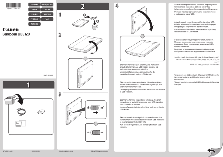 SVENSKA NORSK(BOKMÅL) DANSK SUOMI POLSKI MAGYAR РУССКИЙ العربية 2 1 4 Skaner nie ma przełącznika zasilania. Po podłączeniu komputera do skanera za pomocą kabla USB i włączeniu go zasilanie skanera zostanie aktywowane. Podczas instalacji oprogramowania pojawi się monit o podłączenie kabla USB. 1 2 A lapolvasónak nincs tápkapcsolója. Amint az USBkábellel a lapolvasóhoz csatlakoztatott számítógépet bekapcsolják, a lapolvasó is bekapcsolódik. TÜRKÇE A szoftvertelepítés során a rendszer kérni fogja, hogy csatlakoztassa az USB-kábelt. 2 У сканера отсутствует переключатель питания. Питание сканера активируется после того, как компьютер будет подключен к нему через USBкабель и включен. Во время установки программного обеспечения отобразится запрос на подключение USB-кабеля. بمجرد توصيل الكمبيوتر بالماسحة.ال تحتوي الماسحة الضوئية على مفتاح طاقة سيتم تنشيط الطاقة الخاصة بالماسحة، وتشغيلهUSB الضوئية من خالل كبل .الضوئية Skannern har inte någon strömbrytare. När datorn ansluts till skannern via USB-kabeln och slås på aktiveras även skannerns nätström. Under installationen av programvaran får du meddelande om att ansluta USB-kabeln. RMC: K10402 1 Skanneren har ingen strømbryter. Når datamaskinen kobles til skanneren via USB-kabelen og slås på, slås strømmen til skanneren på. Under programvareinstallasjonen blir du bedt om å koble til USB-kabelen. 3 Scanneren har ikke nogen tænd-/slukknap. Så snart computeren er sluttet til scanneren med USB-kablet og tændt, tændes scanneren. Under softwareinstallation vil du blive bedt om at tilslutte USB-kablet. Skannerissa ei ole virtakytkintä. Skanneriin tulee virta, kun skanneri yhdistetään tietokoneeseen USB-kaapelilla ja tietokoneeseen kytketään virta. Kun asennat ohjelmistoa, se pyytää kytkemään USBkaapelin. QT6-0370-V01 XXXXXXXX © CANON INC. 2014 PRINTED IN XXXXXXXX .USB سيُطلب منك أثناء تثبيت البرامج توصيل كبل Tarayıcının güç düğmesi yok. Bilgisayar USB kablosuyla tarayıcıya bağlanıp açıldığında, tarayıcı gücü etkinleştirilir. Yazılım kurulumu sırasında USB kablosunun bağlanması isteniyor. 3 Du kan börja skanna via programvaran som startas i Quick Menu eller med hjälp av skannerknapparna. Du kan begynne å skanne med programvaren som er startet fra Quick Menu eller ved å bruke skannerknappene. Du kan starte med at scanne med softwaren ved at starte den fra Quick Menu eller ved hjælp af scannerknapperne. Voit aloittaa skannaamisen ohjelmistolla Quick Menu-valikosta tai käyttämällä skannerin painikkeita. Można rozpocząć skanowanie za pomocą oprogramowania, rozpoczynając od Quick Menu, lub użyć przycisków skanera. För Windows-datorer finns även en installations-CD. A Quick Menu menüből elindított szoftverrel vagy a lapolvasógombokkal megkezdheti a beolvasást. Installerings-CD-ROM er også tilgjengelig for Windows-PC. Начать сканирование можно с помощью программного обеспечения, запущенного из Quick Menu, или с помощью кнопок сканера. Installations-cd-rommen er også tilgængelig for Windows-pc. Asennus-CD on saatavilla myös Windows-tietokoneille. Instalacyjny dysk CD-ROM jest dostępny także na komputery z systemem Windows. Windows PC-hez Telepítő CD-ROM is rendelkezésre áll. Установочный компакт-диск также доступен для Windows PC. .Windows يتوفر أيضًا القرص المضغوط الخاص باإلعداد لجهاز الكمبيوتر بنظام Windows PC için Kurulum CD-ROM'u da kullanılabilir. . أو باستخدام أزرار الماسحة الضوئيةQuick Menu يمكنك بدء المسح الضوئي من خالل البرنامج الذي يتم بدء تشغيله من Quick Menu'den başlatılan yazılımla veya Tarayıcı Düğmeleri'ni kullanarak taramayı başlatabilirsiniz.