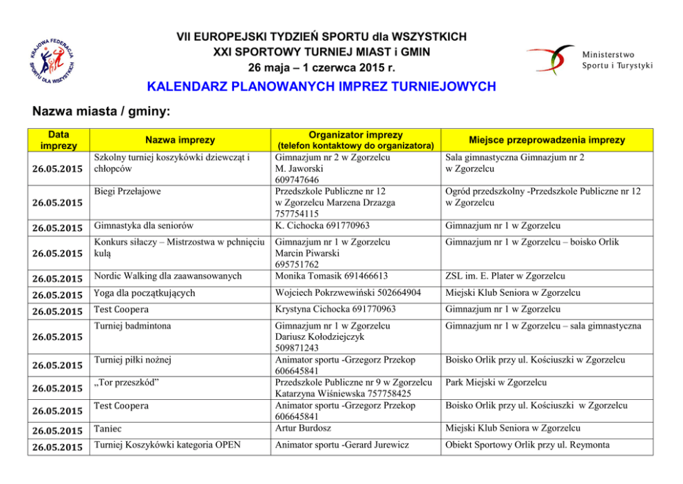 VII EUROPEJSKI TYDZIEŃ SPORTU dla WSZYSTKICH XXI SPORTOWY TURNIEJ MIAST i GMIN 26 maja – 1 czerwca 2015 r. KALENDARZ PLANOWANYCH IMPREZ TURNIEJOWYCH Nazwa miasta / gminy: Data imprezy 26.05.2015 Nazwa imprezy Szkolny turniej koszykówki dziewcząt i chłopców Biegi Przełajowe 26.05.2015 Organizator imprezy (telefon kontaktowy do organizatora) Miejsce przeprowadzenia imprezy Gimnazjum nr 2 w Zgorzelcu M. Jaworski 609747646 Przedszkole Publiczne nr 12 w Zgorzelcu Marzena Drzazga 757754115 K. Cichocka 691770963 Sala gimnastyczna Gimnazjum nr 2 w Zgorzelcu Gimnazjum nr 1 w Zgorzelcu – boisko Orlik Ogród przedszkolny -Przedszkole Publiczne nr 12 w Zgorzelcu 26.05.2015 Gimnastyka dla seniorów 26.05.2015 Konkurs siłaczy – Mistrzostwa w pchnięciu kulą 26.05.2015 Nordic Walking dla zaawansowanych Gimnazjum nr 1 w Zgorzelcu Marcin Piwarski 695751762 Monika Tomasik 691466613 26.05.2015 Yoga dla początkujących Wojciech Pokrzwewiński 502664904 Miejski Klub Seniora w Zgorzelcu 26.05.2015 Test Coopera Krystyna Cichocka 691770963 Gimnazjum nr 1 w Zgorzelcu Turniej badmintona Gimnazjum nr 1 w Zgorzelcu – sala gimnastyczna Obiekt Sportowy Orlik przy ul. Reymonta 26.05.2015 Taniec Gimnazjum nr 1 w Zgorzelcu Dariusz Kołodziejczyk 509871243 Animator sportu -Grzegorz Przekop 606645841 Przedszkole Publiczne nr 9 w Zgorzelcu Katarzyna Wiśniewska 757758425 Animator sportu -Grzegorz Przekop 606645841 Artur Burdosz 26.05.2015 Turniej Koszykówki kategoria OPEN Animator sportu -Gerard Jurewicz 26.05.2015 26.05.2015 26.05.2015 26.05.2015 Turniej piłki nożnej „Tor przeszkód” Test Coopera Gimnazjum nr 1 w Zgorzelcu ZSL im. E. Plater w Zgorzelcu Boisko Orlik przy ul. Kościuszki w Zgorzelcu Park Miejski w Zgorzelcu Boisko Orlik przy ul. Kościuszki w Zgorzelcu Miejski Klub Seniora w Zgorzelcu 26.05.2015 26.05.2015 Test Coopera Turniej Koszykówki zespoły 2 osobowe 26.05.2015 Test Coopera 26.05.2015 Olimpiada Przedszkolaka – konkurencje sportowe w grupach 26.05.2015 XIX Przedszkolna Olimpiada Sportowa w Zgorzelcu 26.05.2015 Mistrzostwa Dolnego Śląska w Lekkiej Atletyce Juniorek i Juniorów 26.05.2015 26.05.2015 Międzyszkolny Turniej Gry Frizby kl. IV-VI „Lekkoatletyka dla każdego” 26.05.2015 Gry i zabawy rekreacyjno-sportowe 26.05.2015 Lekkoatletyka dla wszystkich 27.05.2015 Szkolny turniej piłki siatkowej dziewcząt i chłopców Ćwiczenia z woreczkami – rzuty do celu 27.05.2015 27.05.2015 Turniej koszykówki dziewcząt Szkolny Turniej RINGO 27.05.2015 27.05.2015 Turniej tenisa stołowego 787451610 w Zgorzelcu Animator sportu -Gerard Jurewicz 787451610 Animator sportu -Janusz Włodarczyk 534202098 Animator sportu -Janusz Włodarczyk 534202098 Przedszkole Publiczne nr 2 w Zgorzelcu Helena Michniewicz 757752360 Przedszkole Publiczne nr 8 w Zgorzelcu K. Kułakowska V. Czubak-Dacko 757758978 Zrzeszenie Ludowe Zespoły Sportowe Powiatu Zgorzelec 756494058 Szkoła Podstawowa nr 5 w Zgorzelcu Nauczyciele w-f 757754121 Szkoła Podstawowa nr 2 w Zgorzelcu Danuta Śliwińska 600819405 Gimnazjum nr 3 w Zgorzelcu Wojciech Pawłowski 757752280 Szkoła Podstawowa „Tęcza” w Zgorzelcu D. Śliwińska 600819405 Gimnazjum nr 2 w Zgorzelcu S. Szubartowski 535840047 Przedszkole Publiczne nr 12 w Zgorzelcu Aneta Zalewska 757754115 Animator sportu -Grzegorz Przekop 606645841 Gimnazjum nr 1 w Zgorzelcu Izabela Różyło, Marzena Plucińska, Dariusz Kołodziejczyk 509871243 Gimnazjum nr 1 w Zgorzelcu Dariusz Kołodziejczyk 509871243 Obiekt Sportowy Orlik przy ul. Reymonta w Zgorzelcu Obiekt Sportowy Orlik przy ul. Reymonta w Zgorzelcu Obiekt Sportowy Orlik przy ul. Reymonta w Zgorzelcu Przedszkole Publiczne nr 2 w Zgorzelcu Przedszkole Publiczne nr 8 w Zgorzelcu Stadion Miejski w Zgorzelcu Boisko przy szkole Boisko przy szkole Sala gimnastyczna Sala gimnastyczna w szkole Tęcza Sala gimnastyczna Gimnazjum nr 2 w Zgorzelcu Sala przedszkolna Przedszkole Publiczne nr 12 w Zgorzelcu Boisko Orlik przy ul. Kościuszki w Zgorzelcu Gimnazjum nr 1 w Zgorzelcu – sala gimnastyczna Gimnazjum nr 1 w Zgorzelcu – sala gimnastyczna „Gra w dwa ognie” 28.05.2015 Test Coopera Przedszkole Publiczne nr 9 w Zgorzelcu Kostrzewa, G. Psonak 757758425 Animator sportu -Janusz Włodarczyk 534202098 Animator sportu -Gerard Jurewicz 787451610 Przedszkole Publiczne nr 2 w Zgorzelcu Dyrektor – Dorota Święcicka 781790185 Przedszkole Publiczne nr 8 w Zgorzelcu A. Zajączkowska, M. Sobierajska, A. Słabicka 757758978 Szkoła Podstawowa nr 3 w Zgorzelcu U. Halicka, M. Kawka, A. Kupińska 757752369 Szkoła Podstawowa nr 5 w Zgorzelcu Nauczyciele w-f 757754121 Gimnazjum nr 3 w Zgorzelcu Jacek Matusewicz 757752280 Szkoła Podstawowa „Tęcza” w Zgorzelcu nauczyciele w-f Gimnazjum nr 2 w Zgorzelcu Ł. Kubala 792232783 Przedszkole Publiczne nr 12 w Zgorzelcu Elżbieta Hurkasiewicz 757754115 Krystyna Cichocka 691770963 28.05.2015 Gimnastyka dla seniorów Krystyna Cichocka 691770963 Gimnazjum nr 1 w Zgorzelcu Turniej koszykówki chłopców Animator sportu -Grzegorz Przekop 606645841 Gimnazjum nr 1 w Zgorzelcu Marcin Piwarski 695751762 Przedszkole Publiczne nr 9 D. Michalska D. Józefik 757758425 Animator sportu -Gerard Jurewicz 787451610 Animator sportu -Janusz Włodarczyk Boisko Orlik przy ul. Kościuszki w Zgorzelcu 27.05.2015 27.05.2015 27.05.2015 Gry i zabawy ruchowe z piłki , konkurencje rzutowe Zabawy sportowe na wesoło Festyn Rodzinny 27.05.2015 27.05.2015 27.05.2015 27.05.2015 27.05.2015 27.05.2015 28.05.2015 Festyn Rodzinny – gry i zabawy sportowe Gry i zabawy sportowe na świeżym powietrzu Turniej w piłkę nożną kl. IV-VI Halowy Turniej piłki nożnej „Tęczowe biegi przełajowe” dla klas III-VI Szkolny turniej piłki ręcznej Skoki na trampolinie i skoki w dal 28.05.2015 28.05.2015 28.05.2015 28.05.2015 28.05.2015 28.05.2015 Konkurs skoczka – mistrzostwa w skoku w dal „Zabawy integracyjne z wykorzystaniem propozycji wg W. Sherborne” Turniej piłki nożnej kategoria OPEN Gry i zabawy ruchowe z pi