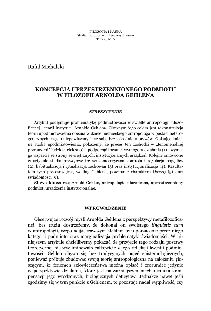 FILOZOFIA I NAUKA Studia filozoficzne i interdyscyplinarne Tom 4, 2016 Rafał Michalski KONCEPCJA UPRZESTRZENNIONEGO PODMIOTU W FILOZOFII ARNOLDA GEHLENA STRESZCZENIE Artykuł podejmuje problematykę podmiotowości w świetle antropologii filozoficznej i teorii instytucji Arnolda Gehlena. Głównym jego celem jest rekonstrukcja teorii upodmiotowienia obecna w dziele niemieckiego antropologa w postaci heterogenicznych, często niepowiązanych ze sobą bezpośrednio motywów. Opisując kolejne stadia upodmiotowienia, pokażemy, że proces ten zachodzi w „fenomenalnej przestrzeni” ludzkiej cielesności podporządkowanej wymogom działania (1) i wymaga wsparcia ze strony zewnętrznych, instytucjonalnych urządzeń. Kolejne omówione w artykule stadia rozwojowe to: sensomotoryczna kontrola i regulacja popędów (2), habitualizacja i rytualizacja zachowań (3) oraz instytucjonalizacja (4). Rezultatem tych procesów jest, według Gehlena, powstanie charakteru (hexis) (5) oraz świadomości (6). Słowa kluczowe: Arnold Gehlen, antropologia filozoficzna, uprzestrzenniony podmiot, urządzenia instytucjonalne. WPROWADZENIE Obserwując rozwój myśli Arnolda Gehlena z perspektywy metafilozoficznej, bez trudu dostrzeżemy, że dokonał on swoistego linguistic turn w antropologii, czego najjaskrawszym efektem było porzucenie przez niego kategorii podmiotu oraz marginalizacja problematyki świadomości. W niniejszym artykule chcielibyśmy pokazać, że przyjęcie tego rodzaju postawy teoretycznej nie wyeliminowało całkowicie z jego refleksji kwestii podmiotowości. Gehlen obywa się bez tradycyjnych pojęć epistemologicznych, ponieważ próbuje zbudować swoją teorię antropologiczną na założeniu głoszącym, że fenomen człowieczeństwa można opisać i zrozumieć jedynie w perspektywie działania, które jest najważniejszym mechanizmem kompensacji jego wrodzonych, biologicznych deficytów. Jednakże nawet jeśli zgodzimy się w tym punkcie z Gehlenem, to pozostaje nadal wątpliwość, czy 96 Rafał Michalski opisywane przez niego procesy odciążania i stabilizacji życia popędowego dają się w ogóle pomyśleć bez jakkolwiek pojętej idei podmiotu świadomości. Wyjaśniając rozmaite procesy dyscyplinowania cielesności, filozof siłą rzeczy musi odwołać się do jakiejś instancji, która przynajmniej (współ)kontroluje psycho-fizyczny i społeczny rozwój jednostki. Jeśli nie jest nią refleksyjne, samoświadome Ja, to w takim razie co innego? W tekstach Gehlena nie znajdziemy jednoznacznej, wyczerpującej odpowiedzi na to pytanie. Nie znaczy to jednak, że jej tam nie ma. Dlatego pierwszym celem tego artykułu będzie próba dokonania „przyjaznej” i rekonstrukcji rozmaitych motywów obecnych u Gehlena, które powiążemy w systematyczną całość, aby pokazać, że problematyka upodmiotowienia odgrywa jednak istotną rolę w jego projekcie filozoficznym. To z kolei pozwoli nam przynajmniej częściowo obronić jego koncepcję przed zarzutem skrajnego konserwatyzmu, który rzekomo nieuchronnie pociąga za sobą tezę o całkowitym podporządkowaniu jednostki hegemonicznej władzy instytucji. Klasyczny przykład takiej krytyki znajduje się w Filozoficznym dyskursie nowoczesności Jürgena Habermasa. Habermas przy okazji polemiki z teorią władzy Michela Foucaulta zarzuca Gehlenowi, że ten cynicznie pomija w swojej twórczości problematykę genezy tożsamości i nie potrafi wyjaśnić najbardziej elementarnych procesów komunikacji. Zacytujmy odnośny fragment: Teoretyk władzy Foucault biedzi się z tym zupełnie tak samo, jak instytucjonalista Gehlen; w obu teoriach brak integracyjnego mechanizmu, takiego jak język (z krzyżującymi się nastawieniami performatywnymi mówcy i słuchacza), który mógłby wyjaśniać indywidualizacyjny efekt uspołecznienia. Foucault, podobnie jak Gehlen, nadrabia tę pojęciową lukę w ten sposób, że gruntownie oczyszcza pojęcie indywidualności z konotacji samookreślenia i samourzeczywistnienia i sprowadza do świata wewnętrznego, który wytwarzany jest przez bodźce zewnętrzne i którego poglądową zawartością można dowolnie manipulować.1 Odwołanie do Gehlena służy tutaj w istocie do uwypuklenia moralnie dwuznacznej luki w teorii Foucaulta, który podobnie jak niemiecki „instytucjonalista” nonszalancko pomija procesy integracyjne odpowiadające za tworzenie ludzkiej tożsamości. Krytyka Habermasa jest nieuzasadniona zarówno wobec Foucaulta, jak i wobec Gehlena, co pokazałem gdzie indziej.2 W tym miejscu podkreślmy tylko, że najważniejsze słabości wytknięte przez autora Filozoficznego dyskursu nowoczesności, tj. nieobecność „mechanizmu integracyjnego takiego jak język” oraz pogląd jakoby świat wewnętrzny człowieka był bez reszty wytwarzany przez bodźce zewnętrzne, całkowicie ————————— J. Habermas, Filozoficzny dyskurs nowoczesności, przeł. M. Łukasiewicz, Kraków 2000, 327. Por. S. Czerniak, R. Michalski, Filozofia jako samokrytyka rozumu. Meandry doktrynalnej ewolucji teorii krytycznej, Toruń 2014, 307–318. 1 2 Koncepcja uprzestrzennionego podmiotu w filozofii Arnolda Gehlena 97 mijają się z intencjami i dokonaniami Gehlena. Po pierwsze, nie tylko rozwija on złożoną koncepcję języka jako systemu integracyjnego, ale ponadto umieszcza język obok działania w samym centrum swojej antropologii.3 Po drugie, co pokażemy w dalszej części artykułu, pozornie paradoksalna teza antropologa o „subiektywizacji przez eksterioryzację”, czyli przekonanie, że ludzkie wnętrze powstaje w znacznej mierze na skutek zmian indukowanych przez zewnętrzne bodźce, nie musi prowadzić do wniosku, że człowiek jest w istocie „zewnątrzsterownym”, uległym obiektem manipulacji. Opisując kolejne stadia upodmiotowienia, pokażemy również, że proces ten zachodzi w „fenomenalnej przestrzeni” ludzkiej cielesności podporządkowanej wymogom działania (1) i wymaga w