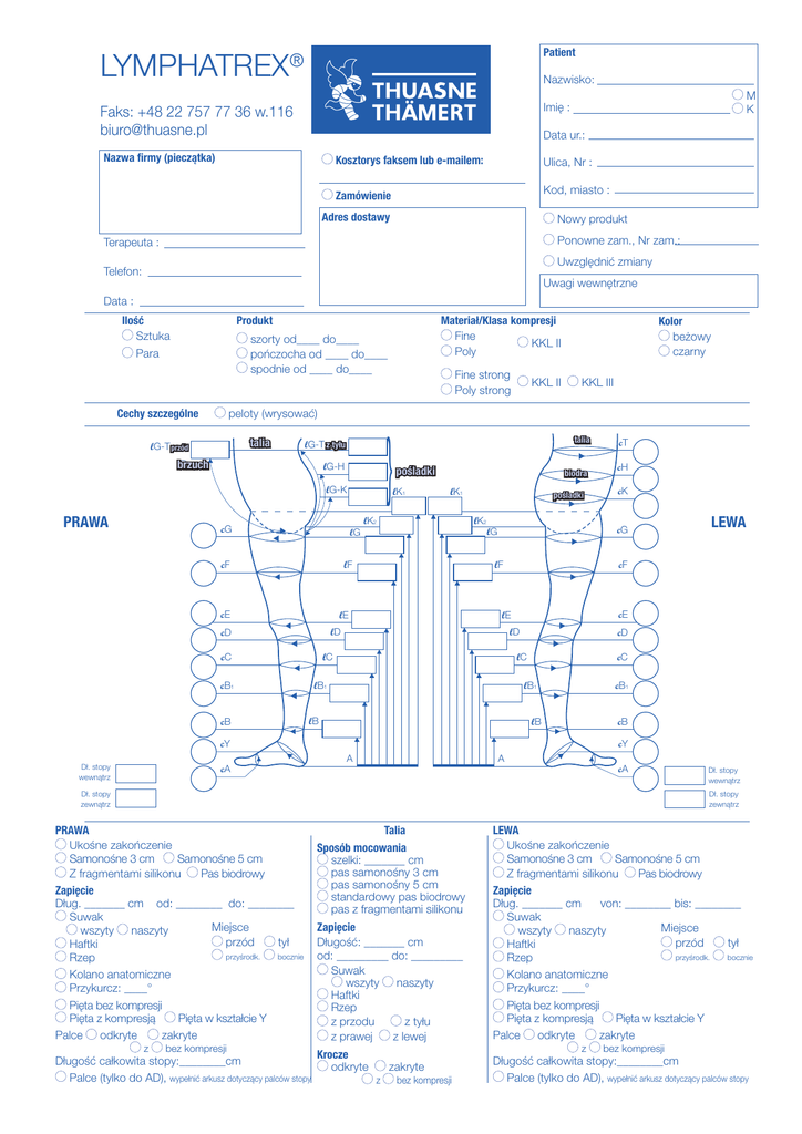 Patient ® LYMPHATREX Nazwisko: M K Imię : Faks: +48 22 757 77 36 w.116 [email protected] Data ur.: Nazwa firmy (pieczątka) Kosztorys faksem lub e-mailem: Ulica, Nr : Kod, miasto : Zamówienie Adres dostawy Nowy produkt Ponowne zam., Nr zam.: Terapeuta : Uwzględnić zmiany Telefon: Uwagi wewnętrzne Data : Ilość Sztuka Produkt Para Cechy szczególne Fine strong Poly strong KKL II Kolor beżowy czarny KKL III peloty (wrysować) talia Taille lG-T przód vorn } lG-T zhinten tyłu Bauch brzuch lG-H lG-K PRAWA Materiał/Klasa kompresji Fine KKL II Poly szorty od____ do____ pończocha od ____ do____ spodnie od ____ do____ pośladki Gesäß lK1 biodra Hüfte lK1 cE lD lD cD cC lB1 lB1 cB1 lB cB1 lB cB cY cY A Dł. stopy wewnątrz LEWA cD lC lC cC cK cE lE lE cH cF lF lF cT cG lG lG cF pośladki Gesäß lK2 lK2 cG cB talia Taille A cA cA Dł. stopy zewnątrz Dł. stopy wewnątrz Dł. stopy zewnątrz PRAWA Ukośne zakończenie Samonośne 3 cm Samonośne 5 cm Z fragmentami silikonu Pas biodrowy Zapięcie Dług. _______ cm od: ________ do: ________ Suwak Miejsce wszyty naszyty przód tył Haftki przyśrodk. bocznie Rzep Kolano anatomiczne Przykurcz: ____° Pięta bez kompresji Pięta z kompresją Pięta w kształcie Y Palce odkryte zakryte z bez kompresji Długość całkowita stopy:________cm Palce (tylko do AD), wypełnić arkusz dotyczący palców stopy Talia Sposób mocowania szelki: _______ cm pas samonośny 3 cm pas samonośny 5 cm standardowy pas biodrowy pas z fragmentami silikonu Zapięcie Długość: _______ cm od: _________ do: _________ Suwak wszyty naszyty Haftki Rzep z przodu z tyłu z prawej z lewej LEWA Ukośne zakończenie Samonośne 3 cm Samonośne 5 cm Z fragmentami silikonu Pas biodrowy Zapięcie Dług. _______ cm von: ________ bis: ________ Suwak Miejsce wszyty naszyty przód tył Haftki przyśrodk. bocznie Rzep Kolano anatomiczne Przykurcz: ____° Pięta bez kompresji Pięta z kompresją Pięta w kształcie Y Palce odkryte zakryte z Krocze odkryte zakryte z bez kompresji bez kompresji Długość całkowita stopy:________cm Palce (tylko do AD), wypełnić arkusz dotyczący palców stopy