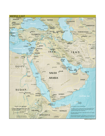MIDDLE EAST ROMANIA Bucharest 30 Black Sea Varna BULGARIA UC AS Sokhumi Istanbul Bursa Dardanelles Aegean GREECE Sea KA RA Ankara . Izmir Athens GU Samsun Trabzon DE NIZ DAGL ARI T I U R U S MO U N T A Adana Lake Rasht Urmia Zanjān Gaziantep Al Jubayl E Aswān Cancer Yanbu’ al Baḩr Administrative boundary 20 N U B D E S E I A R T Red Sea S Port Sudan 30 PAK. Bandar ‘Abbas Strait of Hormuz OMAN Dubai Abu Doha Dhabi Gulf of Oman Muscat UNITED ARAB EMIRATES A R I le Ni Jeddah Mecca N Zāhedān QATAR ARABIA Ḩalā’ib Kermān S Manama Riyadh SAUDI Z of J A Tropic Medina N Persian Gulf BAHRAIN H Luxor I T T IRAN LU R A Shiraz ¯ Ad Dammām Dhahran Buraydah AFG. E S E Herāt ¯RVI E H Bandar-e Būshehr Ḩafar al Bāţin ¯ Ḩā’il¯ T Abādān KUWAIT EGYPT D N Kuwait City Gulf of Aqaba Mary KA N An Nāşiriyah ¯ Al Başrah Tabūk Asyūt¸ U Ahvāz Al ‘Aqabah G DASHT-E K A V ¯I R Eşfahān O R M E IRAQ T A Tehran S T R Z M TS. Arāk O S S E Kermānshāh Baghdad N (lowest point in Asia, -408 m) ez Su E E A Dead Sea f Gulf o W D I JORDAN Suez Al Jizah ¯ Amman R Ashgabat EH Mashhad Qom R Cairo QATTARA DEPRESSION West Bank Y Kirkuk P G 30 Suez Canal Gaza Strip S BU R A Tel AvivYafo Port Said Jerusalem Alexandria Damascus Golan Heights EL Z Beirut LEBANON ISRAEL Mediterranean Sea Homs P GARAGUM D ¯ Qazvin Erbil is Tigr SYRIA CYPRUS Mosul es rat ph Eu Aleppo Latakia Nicosia O ¯ Tabriz Mersin Crete Turkmenabat Balkanabat Van Lake Van Diyarbakir N A Antalya Baku 40 Buxoro TURKMENISTAN Türkmenbaşy K Kayseri Konya UZBEKISTAN Am u Dasoguz Sumqayit AZERBAIJAN Yerevan Erzurum TURKEY Denizli Tbilisi ARMENIA Nukus Caspian Sea GEORGIA Bat'umi S 40 DO Aqtaū (Aktau) rya Da Thessaloníkí Bosporus KAZAKHSTAN KAZAKHSTAN Gora Elbrus (highest point in Europe, 5833 m) Groznyy MO UN TA IN S US 60 Aral Sea RUSSIA Krasnodar CA Sofia 50 40 UKR. Sevastopol' Constant¸a U B' A L K H A OMAN LI 20 R Abhā SUDAN Omdurman Şalālah Jizan ¯ Khartoum Kassala Nile 0 (lowest point in Africa, -155 m) Desē Addis Ababa RI EA T GR Boundary representation is not necessarily authoritative. Bab el DJIBOUTI Mandeb Djibouti Socotra Gulf of Aden (YEMEN) Boosaaso Golan Heights is Israeli-occupied Syria. EY Dirē Dawa Hargeysa ETHIOPIA 40 10 West Bank is Israeli-occupied with current status subject to the Israeli-Palestinian Interim Agreement; permanent status to be determined through further negotiation. SOMALIA The status of the Gaza Strip is a final status issue to be resolved through negotiations. FT 300 Miles 30 Aden Berbera LL 300 Kilometers Arabian Sea Al Mukallā VA Lambert Conformal Conic Projection, standard parallels 12°N and 38°N YEMEN Ta‘izz Scale 1:21,000,000 0 Sanaa Lac Assal Lake Tana 10 Al Ghayḑah Al Ḩudaydah Blue ile e N Whit Wad Medani ERITREA Massawa Asmara Provisional administrative line 50 Israel proclaimed Jerusalem as its capital in 1950, but the US, like nearly all other countries, maintains its Embassy in Tel Aviv-Yafo. 60 803615AI (G00412) 8-13