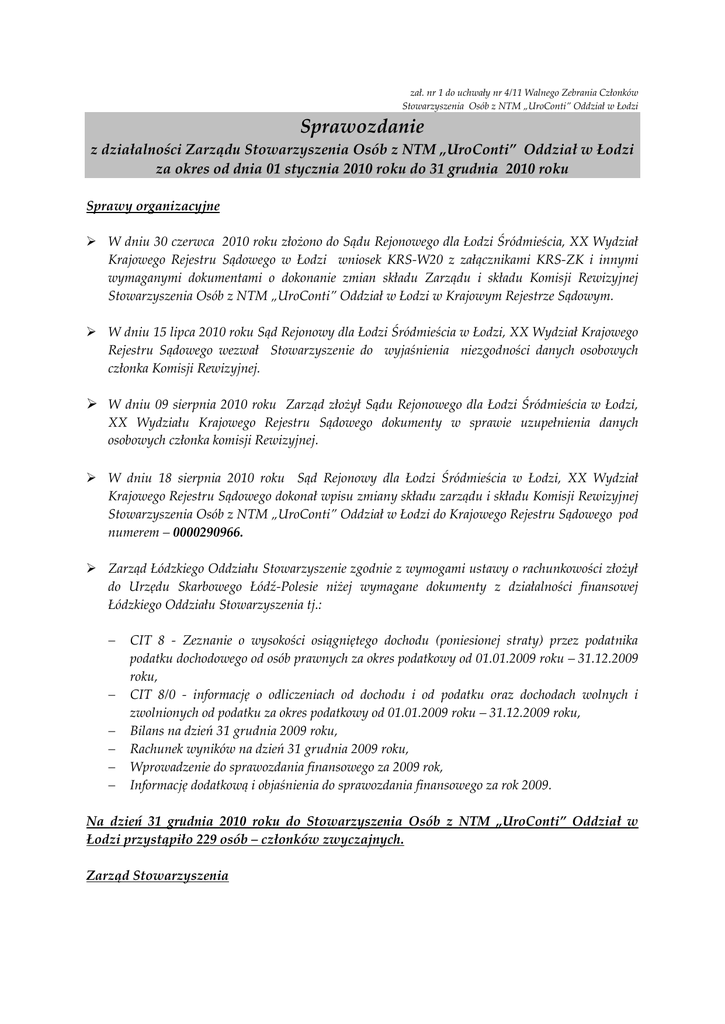 zał. nr 1 do uchwały nr 4/11 Walnego Zebrania Członków Stowarzyszenia Osób z NTM „UroConti” Oddział w Łodzi Sprawozdanie z działalności Zarządu Stowarzyszenia Osób z NTM „UroConti” Oddział w Łodzi za okres od dnia 01 stycznia 2010 roku do 31 grudnia 2010 roku Sprawy organizacyjne W dniu 30 czerwca 2010 roku złożono do Sądu Rejonowego dla Łodzi Śródmieścia, XX Wydział Krajowego Rejestru Sądowego w Łodzi wniosek KRS-W20 z załącznikami KRS-ZK i innymi wymaganymi dokumentami o dokonanie zmian składu Zarządu i składu Komisji Rewizyjnej Stowarzyszenia Osób z NTM „UroConti” Oddział w Łodzi w Krajowym Rejestrze Sądowym. W dniu 15 lipca 2010 roku Sąd Rejonowy dla Łodzi Śródmieścia w Łodzi, XX Wydział Krajowego Rejestru Sądowego wezwał Stowarzyszenie do wyjaśnienia niezgodności danych osobowych członka Komisji Rewizyjnej. W dniu 09 sierpnia 2010 roku Zarząd złożył Sądu Rejonowego dla Łodzi Śródmieścia w Łodzi, XX Wydziału Krajowego Rejestru Sądowego dokumenty w sprawie uzupełnienia danych osobowych członka komisji Rewizyjnej. W dniu 18 sierpnia 2010 roku Sąd Rejonowy dla Łodzi Śródmieścia w Łodzi, XX Wydział Krajowego Rejestru Sądowego dokonał wpisu zmiany składu zarządu i składu Komisji Rewizyjnej Stowarzyszenia Osób z NTM „UroConti” Oddział w Łodzi do Krajowego Rejestru Sądowego pod numerem – 0000290966. Zarząd Łódzkiego Oddziału Stowarzyszenie zgodnie z wymogami ustawy o rachunkowości złożył do Urzędu Skarbowego Łódź-Polesie niżej wymagane dokumenty z działalności finansowej Łódzkiego Oddziału Stowarzyszenia tj.: CIT 8 - Zeznanie o wysokości osiągniętego dochodu (poniesionej straty) przez podatnika podatku dochodowego od osób prawnych za okres podatkowy od 01.01.2009 roku – 31.12.2009 roku, CIT 8/0 - informację o odliczeniach od dochodu i od podatku oraz dochodach wolnych i zwolnionych od podatku za okres podatkowy od 01.01.2009 roku – 31.12.2009 roku, Bilans na dzień 31 grudnia 2009 roku, Rachunek wyników na dzień 31 grudnia 2009 roku, Wprowadzenie do sprawozdania finansowego za 2009 rok, Informację dodatkową i objaśnienia do sprawozdania finansowego za rok 2009. Na dzień 31 grudnia 2010 roku do Stowarzyszenia Osób z NTM „UroConti” Oddział w Łodzi przystąpiło 229 osób – członków zwyczajnych. Zarząd Stowarzyszenia W okresie od dnia 01 stycznia 2010 roku do 31 grudnia 2010 roku Zarząd Łódzkiego Oddziału Stowarzyszenia „UroConti” odbył 5 posiedzeń, na których rozpatrywał sprawy będące przedmiotem statutowych zadań, które są ujęte w porządku obrad każdego posiedzenia Zarządu. Zarząd wyznaczył zgodnie z zaleceniem Zarządu Głównego Panią mgr Aleksandrę Listkowską do współpracy z mediami w imieniu Łódzkiego Oddziału Stowarzyszenia Osób z NTM „UroConti”, reprezentowania Łódzkiego Oddziału w środkach masowego przekazu tj. różnych programach operatorów TVP, radiu, łódzkiej prasie lokalnej a także innej. W dniach 10-11 lutego 2010 roku Pani Maria Kurzep uczestniczyła w „IV Konferencji – spotkania liderów organizacji pacjentów” w związku obchodami Światowego Dnia Chorego, która została zorganizowana przez Instytut Praw Pacjenta i Edukacji Zdrowotnej we współpracy z Zakonem posługujących Chorym – Ojcowie Kamilianie. Konferencja poświęcona była wymianom poglądów i doświadczeń oraz możliwości zadawania pytań zaproszonym gościom między innymi Panu Jackowi Paszkiewiczowi – prezesowi NFZ, Panu Markowi Twardowskiemu podsekretarzowi stanu w MZ, Pani Barbarze Kozłowskiej – rzecznikowi Prawa Pacjenta związanymi z systemem ochrony zdrowia. Odbyła się także uroczysta gala wręczenia nagród św. Kamila – patrona chorych w Galerii Porczyńskich – Muzeum Kolekcji Jana Pawła II. W gali wzięli udział przedstawiciele władz państwowych, kościelnych oraz twórcy życia publicznego. Z Łodzi zostali wyróżnieni Pan prof. Jan Moll oraz Pani dr Jadwiga Moll, którzy pracują w Centrum Matki Polki. Światowy Dzień Chorego jest szczególną okolicznością do integracji środowisk organizacji, stowarzyszeń i fundacji działających dla dobra pacjenta. W dniach 26-28 kwietnia 2010 roku Pani Maria Kurzep uczestniczyła w „Światowym Forum poświęconemu nietrzymania moczu - Global Forum On Incontinence GFI”, które odbyło się w Pradze na którym poruszone zostały tematy dotyczące: ostatnich doniesień w dziedzinie nietrzymania moczu; dlaczego pojawia się nietrzymanie moczu – jak temu zapobiegać?; promowanie zachowań w nietrzymaniu moczu; rozwinięty i rozwijający się; nietrzymanie moczu u mężczyzn a jakość życia; ekonomika nietrzymania moczu; wpływ nowych konceptów w nietrzymaniu moczu na opiekę nad pacjentem w domu; być opiekunem, wybór właściwej drogi. 14 maja 2010 roku Zarząd przesłał zebrane opinie członków Łódzkiego Oddziału Stowarzyszenia w sprawie refundacji leków stosowanych w leczeniu zespołu pęcherza nadreaktywnego, które zostały skierowane do Pani Ewy Kopacz Ministra Zdrowia. Zarząd w dniu 29 maja 2010 roku przesłał do Programu Prospołecznego „NTM „Normalnie Żyć” oraz do Zarządu Głównego Stowarzyszenia 11 listów od członkiń z Łódzkiego Oddziału Stowarzyszenia, które zostały skierowane w związku z ogłoszonym konkursem – „Moje życie z NTM”. W dniach 16 - 17 czerwca 2010 roku Pani Jadwiga Kunce - skarbnik Łódzkiego Oddziału Stowarzyszenia uczestniczyła w posiedzeniu Rady Stowarzyszenia w Kielcach. Na spotkaniu Rady Stowarzyszenia przedstawione zostały: sprawozdania z działalności poszczególnych Oddziałów Stowarzyszenia za okres grudzień 2009 r. - maj 2010 r.; najważniejsze działania Zarządu Głównego w okresie grudzień 2009 r. - maj 2010 r.; obowiązki Stowarzyszenia wynikające ze statutu; informacje o stronie internetowej Stowarzyszenia; współpracy z mediami; udziale w Akademii Pacjenta; legity
