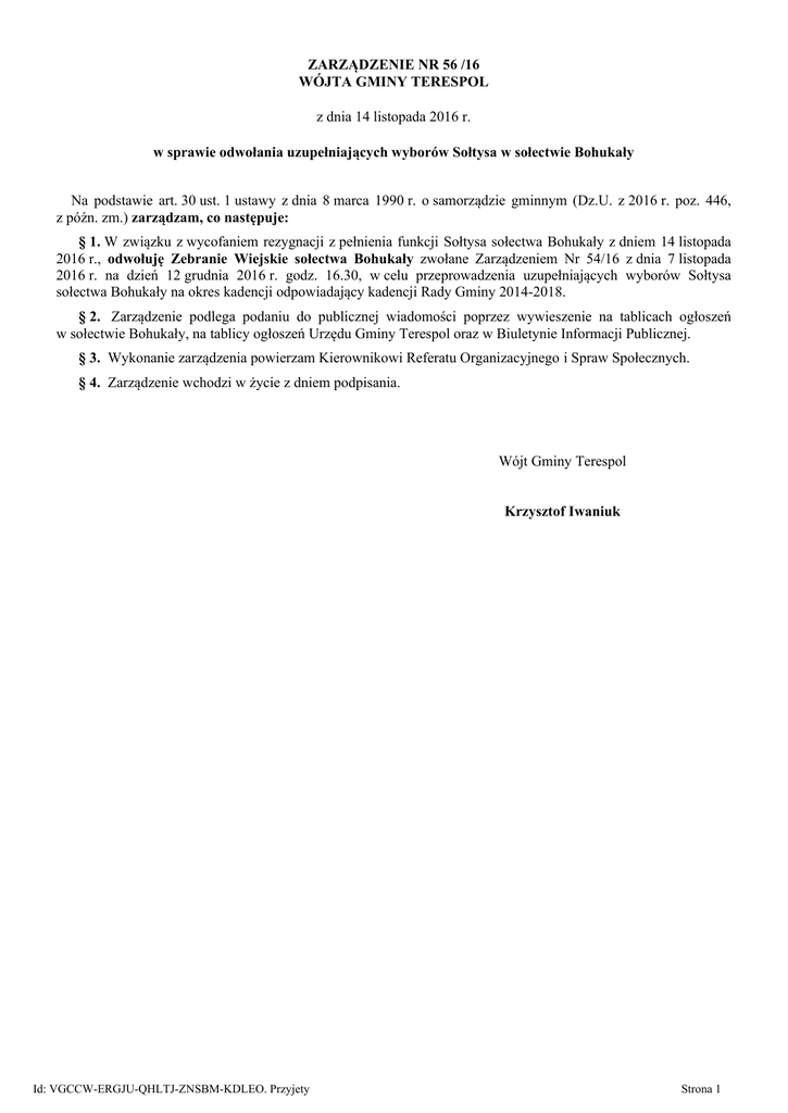ZARZĄDZENIE NR 56 /16 WÓJTA GMINY TERESPOL z dnia 14 listopada 2016 r. w sprawie odwołania uzupełniających wyborów Sołtysa w sołectwie Bohukały Na podstawie art. 30 ust. 1 ustawy z dnia 8 marca 1990 r. o samorządzie gminnym (Dz.U. z 2016 r. poz. 446, z późn. zm.) zarządzam, co następuje: § 1. W związku z wycofaniem rezygnacji z pełnienia funkcji Sołtysa sołectwa Bohukały z dniem 14 listopada 2016 r., odwołuję Zebranie Wiejskie sołectwa Bohukały zwołane Zarządzeniem Nr 54/16 z dnia 7 listopada 2016 r. na dzień 12 grudnia 2016 r. godz. 16.30, w celu przeprowadzenia uzupełniających wyborów Sołtysa sołectwa Bohukały na okres kadencji odpowiadający kadencji Rady Gminy 2014-2018. § 2. Zarządzenie podlega podaniu do publicznej wiadomości poprzez wywieszenie na tablicach ogłoszeń w sołectwie Bohukały, na tablicy ogłoszeń Urzędu Gminy Terespol oraz w Biuletynie Informacji Publicznej. § 3. Wykonanie zarządzenia powierzam Kierownikowi Referatu Organizacyjnego i Spraw Społecznych. § 4. Zarządzenie wchodzi w życie z dniem podpisania. Wójt Gminy Terespol Krzysztof Iwaniuk Id: VGCCW-ERGJU-QHLTJ-ZNSBM-KDLEO. Przyjety Strona 1