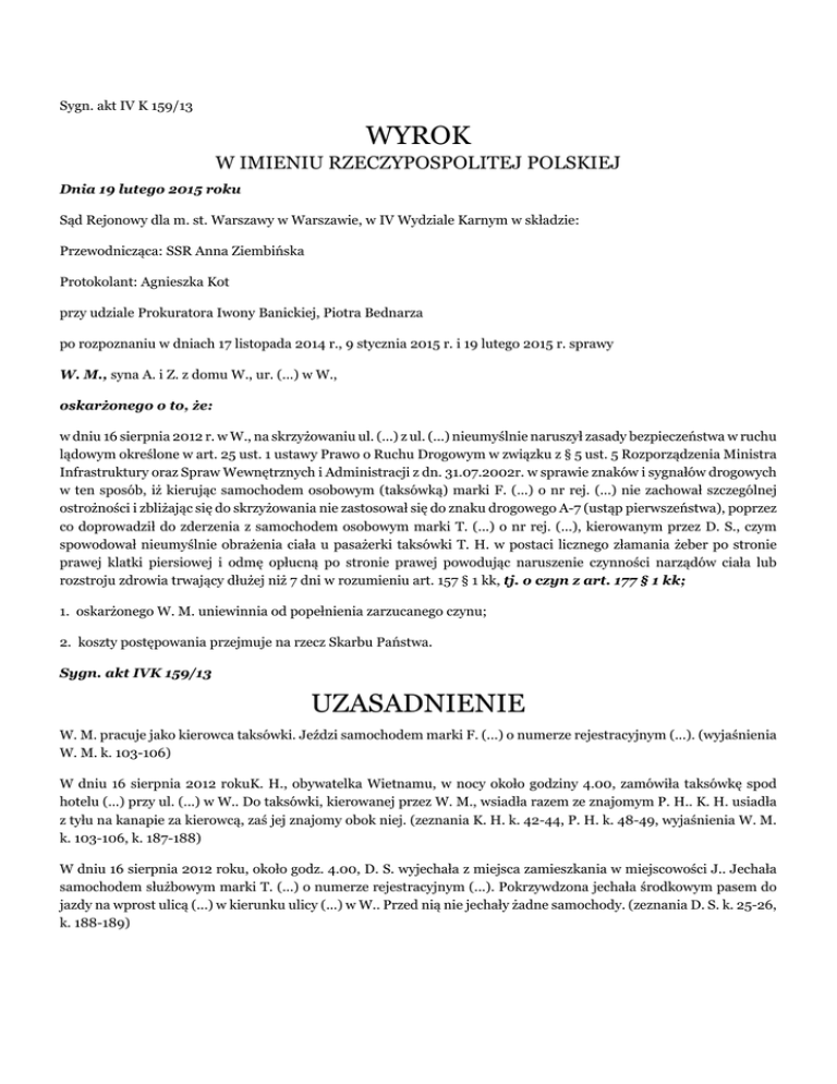 Sygn. akt IV K 159/13 WYROK W IMIENIU RZECZYPOSPOLITEJ POLSKIEJ Dnia 19 lutego 2015 roku Sąd Rejonowy dla m. st. Warszawy w Warszawie, w IV Wydziale Karnym w składzie: Przewodnicząca: SSR Anna Ziembińska Protokolant: Agnieszka Kot przy udziale Prokuratora Iwony Banickiej, Piotra Bednarza po rozpoznaniu w dniach 17 listopada 2014 r., 9 stycznia 2015 r. i 19 lutego 2015 r. sprawy W. M., syna A. i Z. z domu W., ur. (...) w W., oskarżonego o to, że: w dniu 16 sierpnia 2012 r. w W., na skrzyżowaniu ul. (...) z ul. (...) nieumyślnie naruszył zasady bezpieczeństwa w ruchu lądowym określone w art. 25 ust. 1 ustawy Prawo o Ruchu Drogowym w związku z § 5 ust. 5 Rozporządzenia Ministra Infrastruktury oraz Spraw Wewnętrznych i Administracji z dn. 31.07.2002r. w sprawie znaków i sygnałów drogowych w ten sposób, iż kierując samochodem osobowym (taksówką) marki F. (...) o nr rej. (...) nie zachował szczególnej ostrożności i zbliżając się do skrzyżowania nie zastosował się do znaku drogowego A-7 (ustąp pierwszeństwa), poprzez co doprowadził do zderzenia z samochodem osobowym marki T. (...) o nr rej. (...), kierowanym przez D. S., czym spowodował nieumyślnie obrażenia ciała u pasażerki taksówki T. H. w postaci licznego złamania żeber po stronie prawej klatki piersiowej i odmę opłucną po stronie prawej powodując naruszenie czynności narządów ciała lub rozstroju zdrowia trwający dłużej niż 7 dni w rozumieniu art. 157 § 1 kk, tj. o czyn z art. 177 § 1 kk; 1. oskarżonego W. M. uniewinnia od popełnienia zarzucanego czynu; 2. koszty postępowania przejmuje na rzecz Skarbu Państwa. Sygn. akt IVK 159/13 UZASADNIENIE W. M. pracuje jako kierowca taksówki. Jeździ samochodem marki F. (...) o numerze rejestracyjnym (...). (wyjaśnienia W. M. k. 103-106) W dniu 16 sierpnia 2012 rokuK. H., obywatelka Wietnamu, w nocy około godziny 4.00, zamówiła taksówkę spod hotelu (...) przy ul. (...) w W.. Do taksówki, kierowanej przez W. M., wsiadła razem ze znajomym P. H.. K. H. usiadła z tyłu na kanapie za kierowcą, zaś jej znajomy obok niej. (zeznania K. H. k. 42-44, P. H. k. 48-49, wyjaśnienia W. M. k. 103-106, k. 187-188) W dniu 16 sierpnia 2012 roku, około godz. 4.00, D. S. wyjechała z miejsca zamieszkania w miejscowości J.. Jechała samochodem służbowym marki T. (...) o numerze rejestracyjnym (...). Pokrzywdzona jechała środkowym pasem do jazdy na wprost ulicą (...) w kierunku ulicy (...) w W.. Przed nią nie jechały żadne samochody. (zeznania D. S. k. 25-26, k. 188-189) W tym czasie D. G. jechał swoim samochodem J. (...) nr rej. (...) ul. (...) w kierunku ul. (...) od strony Dworca (...). Jechał środkowym pasem i na skrzyżowaniu ulicy (...) z ulicą (...) zatrzymał się na sygnalizacji świetlnej, na czerwonym świetle. (zeznania D. G. k. 66-67, k. 268-269) Nie zmieniając prędkości, D. S. wjechała na skrzyżowanie ulicy (...) z ulicą (...). (zeznania D. S. k. 25-26, k. 188-189, D. G. k. 66-67, k. 268-269) D. S. miała wówczas czerwone światło dla swojego kierunku jazdy. (zeznania D. G. k. 66-67, k. 268-269, wyjaśnienia W. M. k. 103-106, k. 187-188) W. M. wjechał na skrzyżowanie ulic (...) na zielonym świetle dla swojego kierunku jazdy. (zeznania D. G. k. 66-67, k. 268-269, A. von L. k. 189, wyjaśnienia W. M. k. 103-106, k. 187-188) Pojazd oskarżonego został uderzony przez samochód T. (...) w przednią część lewego boku. (zeznania D. S. k. 25-26, k. 188-189, K. H. k. 42-44, P. H. k. 48-49, D. G. k. 66-67, wyjaśnienia W. M. k. 103-106, k. 187-188) Samochód oskarżonego przejechał przez skrzyżowanie i zatrzymał się na chodniku przy murku. (zeznania P. H. k. 48-49, D. G. k. 66-67, dokumentacja fotograficzna k. 74) W chwili zderzenia prędkości kolizyjne samochodu wynosiły około 88 km/h dla samochodu T. (...) i około 55 km/h dla samochodu F. (...). (opinia k. 78-91) W. M. i D. S. w chwili zdarzenia byli trzeźwi. (protokoły użycia alkosensora k. 3, k. 4) Do zderzenia pojazdów doszło na skrzyżowaniu ulic (...) w W., w terenie zabudowanym, na prostym, płaskim, suchym, pokrytym asfaltem odcinku drogi. W momencie oględzin, około godziny 7.15, na skrzyżowaniu działała trójkolorowa sygnalizacja świetlna. (protokół oględzin miejsca wypadku drogowego k. 6-8) W chwili zdarzenia na skrzyżowaniu ulic (...) sygnalizacja świetlna działała w trybie normalnym, trójkolorowym – świeciły się światła zielone, żółte i czerwone. (zeznania A. von L. k. 189, D. S. k. 25-26, k. 188-189, D. G. k. 65-67, k. 268-269, wyjaśnienia W. M. k. 103-106, k. 187-188) Na ulicy (...) w odległości około 50 m od skrzyżowania z ulicą (...) po prawej stronie jezdni znajdował się znak pionowy D-2 „koniec drogi z pierwszeństwem” i znak A-7 „ustąp pierwszeństwa”. (protokół oględzin miejsca wypadku drogowego k. 6-8) W wyniku zderzenia w samochodzie T. (...) uszkodzeniu uległy wszystkie elementy nadwozia od przodu pojazdu do podszybia, które zostały przesunięte na elementach nośnych w lewą stronę. W pojeździe stwierdzono wycieki płynów eksploatacyjnych, rozbitą szybę czołową, wygięte ramię wycieraczki prawej i wystrzelone poduszki kierowcy. (protokół oględzin pojazdu k. 9-10) W samochodzie F. (...) została rozbita szyba czołowa, przód pojazdu przesunięty został w lewą stronę na elementach nośnych od przodu pojazdu do poszybia. Został wgnieciony dach pojazdu, wybrzuszony ku górze w części centralnej lewej, wgniecione drzwi lewe tylne i przednie wraz ze słupkiem, wgnieciony próg pojazdu wraz z podłogą na całej powierzchni z lewej strony na głębokość 50 cm, wgnieciony przedni błotnik, rozbity lewy boczny kierunkowskaz, koło lewe na osi przedniej górną krawędzią przesunięte do wnętrza pojazdu, rozłączony układ jezdny z lewej strony, uszkodzona opona wraz z felgą koła lewego na osi przedniej, zerwane lewe lusterko, wystrzeliły poduszki powietrzne. Stwierdzo