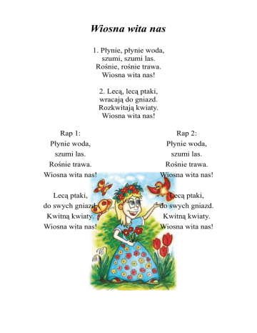 Wiosna wita nas 1. Płynie, płynie woda, szumi, szumi las. Rośnie, rośnie trawa. Wiosna wita nas! 2. Lecą, lecą ptaki, wracają do gniazd. Rozkwitają kwiaty. Wiosna wita nas! Rap 1: Płynie woda, szumi las. Rośnie trawa. Wiosna wita nas! Rap 2: Płynie woda, szumi las. Rośnie trawa. Wiosna wita nas! Lecą ptaki, do swych gniazd. Kwitną kwiaty. Wiosna wita nas! Lecą ptaki, do swych gniazd. Kwitną kwiaty. Wiosna wita nas!