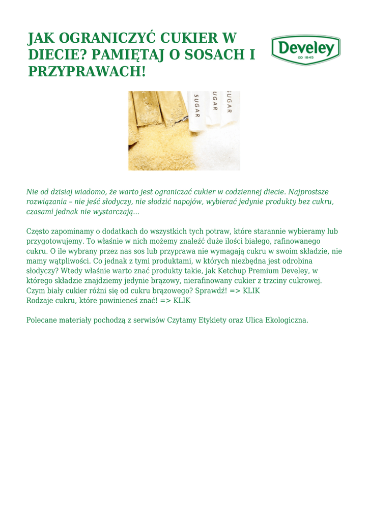 JAK OGRANICZYĆ CUKIER W DIECIE? PAMIĘTAJ O SOSACH I PRZYPRAWACH! Nie od dzisiaj wiadomo, że warto jest ograniczać cukier w codziennej diecie. Najprostsze rozwiązania – nie jeść słodyczy, nie słodzić napojów, wybierać jedynie produkty bez cukru, czasami jednak nie wystarczają... Często zapominamy o dodatkach do wszystkich tych potraw, które starannie wybieramy lub przygotowujemy. To właśnie w nich możemy znaleźć duże ilości białego, rafinowanego cukru. O ile wybrany przez nas sos lub przyprawa nie wymagają cukru w swoim składzie, nie mamy wątpliwości. Co jednak z tymi produktami, w których niezbędna jest odrobina słodyczy? Wtedy właśnie warto znać produkty takie, jak Ketchup Premium Develey, w którego składzie znajdziemy jedynie brązowy, nierafinowany cukier z trzciny cukrowej. Czym biały cukier różni się od cukru brązowego? Sprawdź! => KLIK Rodzaje cukru, które powinieneś znać! => KLIK Polecane materiały pochodzą z serwisów Czytamy Etykiety oraz Ulica Ekologiczna.