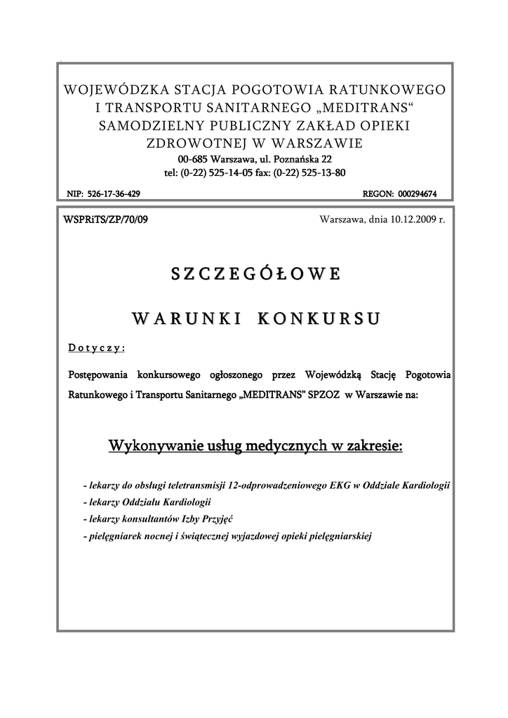 8 WOJEWÓDZKA STACJA POGOTOWIA RATUNKOWEGO I TRANSPORTU SANITARNEGO „MEDITRANS“ SAMODZIELNY PUBLICZNY ZAKŁAD OPIEKI ZDROWOTNEJ W WARSZAWIE 0000-685 Warszawa, ul. Poznańska 22 tel: (0(0-22) 525525-1414-05 fax: (0(0-22) 525525-1313-80 NIP: 526526-1717-3636-429 REGON: 000294674 WSPRiTS/ZP/ WSPRiTS/ZP/70 /ZP/70/0 70/09 /09 Warszawa, dnia 10.12.2009 r. SZCZEGÓŁOWE WARUNKI KONKURSU Dotyczy: Postępowania konkursowego ogłoszonego przez Wojewódzką Stację Pogotowia Ratunkowego i Transportu Sanitarnego „MEDITRANS” SPZOZ w Warszawie na: Wykonywanie usług medycznych w zakresie: - lekarzy do obsługi teletransmisji 12-odprowadzeniowego EKG w Oddziale Kardiologii - lekarzy Oddziału Kardiologii - lekarzy konsultantów Izby Przyjęć - pielęgniarek nocnej i świątecznej wyjazdowej opieki pielęgniarskiej I. OPIS SPOSOBU PRZYGOTOWANIA OFERTY 1. Oferent składa ofertę zgodnie z wymaganiami określonymi w Szczegółowych Warunkach Konkursu. ▪ Każdy oferent może złożyć jedną ofertę . ▪ Oferent, który złoży więcej niż jedną ofertę zostanie odrzucony z postępowania. ▪ Oferta zawierająca wariantowe propozycje cenowe zostanie odrzucona. 2. Oferenci ponoszą wszelkie koszty związane z przygotowaniem i złożeniem oferty. 3. Ofertę należy opracować na druku "OFERTA". Oferentowi nie wolno dokonywać żadnych zmian merytorycznych we wzorze druku „OFERTA”, (w załączeniu: pisemny wzór dokumentu). 4. Oferta - pod rygorem jej odrzucenia - powinna być napisana w języku polskim (z wyłączeniem pojęć medycznych), na maszynie, komputerze lub ręcznie nieścieralnym atramentem oraz podpisana przez osobę / osoby upoważnione do złożenia oferty. 5. Oferty złożone po wyznaczonym terminie lub nadane jako przesyłka pocztowa lub droga faksu, niezależnie od daty nadania, nie będą rozpatrywane. 6. Każda zapisana strona oferty powinna być parafowana przez osobę podpisującą ofertę. 7. Wszystkie dokumenty i oświadczenia sporządzone w językach obcych należy złożyć wraz z tłumaczeniami na język polski sporządzonymi przez tłumaczy przysięgłych. 8. Ofertę wraz ze wszystkimi załącznikami na ponumerowanych stronach należy umieścić w zapieczętowanej kopercie opatrzonej napisem: Konkurs ofert na wykonywanie usług medycznych Nie otwierać przed 29.12.2009 r. godz. 10.00 Liczba stron (określić, ile zapisanych stron znajduje się w kopercie) 9. Oferta pod rygorem odrzucenia musi zawierać wszystkie wymagane w Szczegółowych Warunkach Konkursu dokumenty wymienione w rozdziale II. Jeśli dokument przedstawiony jest w postaci kserokopii - poświadczenie, oprócz adnotacji: „za zgodność z oryginałem”, musi być opatrzone imienną pieczątką i podpisem osoby upoważnionej do podpisania oferty. 10. Wszelkie poprawki lub zmiany w tekście oferty muszą być parafowane przez osobę podpisującą ofertę. 11. Ofertę przed upływem terminu składania ofert można zmienić lub wycofać. 12. Powiadomienie o wprowadzeniu zmian lub wycofaniu oferty winno zostać złożone w sposób i formie przewidzianej dla oferty, z tym, że koperta winna być dodatkowo oznaczona określeniem „ZMIANA” lub „WYCOFANIE”. 13. Zamawiający może żądać przedstawienia oryginału lub notarialnie potwierdzonej kopii dokumentu wyłącznie wtedy, gdy przedstawiona przez oferenta kopia dokumentu jest nieczytelna lub budzi wątpliwości co do jej prawdziwości, a zamawiający nie może sprawdzić jej prawdziwości w inny sposób. II. WYMAGANIA FORMALNO - PRAWNE W ODNIESIENIU ODNIESIENIU DO OFERENTÓW: 1. Oferent ubiegający się o udzielanie usług medycznych zobowiązany jest do złożenia: • oświadczenia oferenta o zapoznaniu się z treścią ogłoszenia, projektem umowy i SWK (załącznik załącznik nr 1); 1 • wypełnionego formularza oferty, przedstawionego przez Zamawiającego; • CV; • zaświadczenia o kwalifikacjach zawodowych osób, które będą udzielały świadczeń w postaci: - dyplomu lekarza - prawa wykonywania zawodu lekarza - dyplomu specjalizacji odpowiednio dla pielęgniarek: - prawo wykonywania zawodu - zaświadczenia o ukończonych kursach - dyplom ukończenia szkoły • odpisu zezwolenia oraz odpisu wpisu do rejestru indywidualnych praktyk lekarskich/ pielęgniarskich we właściwej okręgowej izbie lekarskiej z numerem zezwolenia stosownie do zapisów Ustawy o zawodzie lekarza z dnia 5 grudnia 1996r. / Dz. U. Nr. 26, poz. 152 z późn. zmianami/ lub oświadczenia o wszczęciu postępowania rejestracji praktyki indywidualnej. Odpowiednio stosowne dokumenty dla pielęgniarek (arzy) zaświadczenie o wpisie do rejestru indywidualnych specjalistycznych praktyk pielęgniarek i położnych we właściwej okręgowej izbie pielęgniarskiej (na obszarze działania Warszawskiej Okręgowej Izby Pielęgniarek i Położnych); • zaświadczenie o wpisie do ewidencji działalności gospodarczej; • kopii decyzji o nadaniu NIP; • kopii decyzji o nadaniu REGON; 2. Dokumenty wymienione w ust.1 mogą być przedłożone w formie kopii, poświadczonej za zgodność z oryginałem przez oferenta. 3. W przypadku osób, które składały oferty konkursowe w 2007 r. i w 2008 r. jako poświadczenie posiadania ww. dokumentów należy wypełnić i podpisać oświadczenie (wzór w załączniku). W sytuacji gdyby złożone w poprzednim konkursie dokumenty uległy zmianie lub straciły aktualność – należy złożyć aktualne kopie. 4. Niezłożenie ww. dokumentów spowoduje odrzucenie oferty. 5. O odrzuceniu z postępowania konkursowego wynajmujący powiadomi niezwłocznie oferenta, podając uzasadnienie. III. USZCZEGÓŁOWIENIE PRZEDMIOTÓW KONKURSU 1. Określenie przedmiotu konkursu Świadczenie usług medycznych w zakresie: - lekarze do obsługi teletransmisji 12-odprowadzeniowego EKG w Oddziale Kardiologii; Oferenci powinni spełniać wymagania: lekarz specjalista kardiologii lub lekarz w trakcie specjalizacji z kardiologii (2 lata) lub specjalista chorób wew
