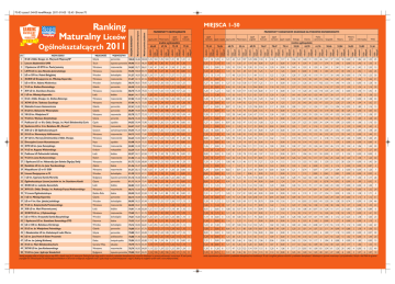 70-83 czesc1:04-05 kwalifikacje 2011-01-05 12:43 Strona 70 Gdynia 2 Liceum Akademickie UMK Toruń 3 2 Społeczne LO STO im. Pawła Jasienicy Warszawa 4 LXVII LO im. Jana Nowaka-Jeziorańskiego Warszawa 100,00 96,86 100,00 1,25 kujawsko-pomorskie 99,46 97,51 98,29 1,28 mazowieckie 94,65 99,71 86,61 1,34 mazowieckie 93,56 100,00 84,19 1,33 5 LO nr XIV im. Polonii Belgijskiej Wrocław dolnośląskie pomorskie PRZEDMIOTY DODATKOWE ZDAWANE NA POZIOMIE ROZSZERZONYM 51,61 liczba zdających 53,03 wskaźnik 56,53 liczba zdających 52,84 wskaźnik 50,46 liczba zdających 61,76 wskaźnik WOS liczba zdających Informatyka wskaźnik Historia sztuki liczba zdających Historia wskaźnik Geografia liczba zdających liczba zdających wskaźnik Fizyka i astronomia wskaźnik Chemia średnie ogólnopolskie 55,38 63,70 liczba zdających liczba zdających 79,14 Biologia wskaźnik Język rosyjski wskaźnik 70,47 liczba zdających liczba zdających 74,67 Język niemiecki wskaźnik Język francuski wskaźnik 69,70 liczba zdających liczba zdających 53,16 wskaźnik liczba zdających 60,75 wskaźnik liczba zdających 76,86 Język angielski wskaźnik Język rosyjski Język polski Matematyka wskaźnik 73,34 liczba zdających liczba zdających 77,01 Język niemiecki wskaźnik Język francuski wskaźnik WOJEWÓDZTWO III LO z Oddz. Dwujęz. im. Marynarki Wojennej RP liczba zdających MIEJSCOWOŚĆ 1 wskaźnik NAZWA SZKOŁY 63,68 Język angielski średnie ogólnopolskie 67,74 73,19 liczba zdających 2011 Język polski Matematyka wskaźnik 2011 liczba zdających OGÓLNOKSZTAŁCĄCE PRZEDMIOTY OBOWIĄZKOWE wskaźnik EDUKACYJNY Wskaźnik przedmioty dodatkowe LICEA RANKING WSKAŹNIK RANKINGOWY MATURALNY MIEJSCA 1–50 Wskaźnik przedmioty obowiązkowe Ranking RANKING Maturalny Liceów Ogólnokształcących 2011 163 1,35 163 1,31 99 1,21 4 1,21 16 1,29 4 1,21 45 1,41 107 1,23 206 1,18 8 1,18 6 1,17 6 1,36 32 1,40 31 1,33 46 1,41 37 1,32 18 0,00 0 1,84 22 1,35 25 45 1,36 45 1,31 34 1,30 1 1,31 5 1,14 3 1,40 11 1,56 27 1,19 66 0,00 0 1,29 2 0,00 0 1,34 9 1,34 9 1,35 17 1,74 9 1,46 0,00 0 1,40 6 1,36 41 1,36 41 1,34 31 1,26 3 1,35 5 0,00 0 1,05 10 1,50 18 1,30 33 1,16 4 1,29 4 0,00 0 1,49 6 1,33 8 1,39 8 1,41 5 1,41 11 1,41 6 1,43 2 1,55 13 0 0,00 0 1,48 3 1 1,62 26 5 8 64 1,37 64 1,34 39 0,00 0 1,33 24 1,30 1 1,43 16 1,61 28 1,31 60 1,25 3 1,27 4 1,26 1 0,00 1,63 20 1,51 30 1,56 2 1,02 91,37 94,59 85,28 1,24 171 1,30 171 1,27 111 1,22 3 1,21 13 1,14 1 1,17 48 1,33 113 1,11 84 1,13 5 1,22 2 1,26 1 1,28 37 1,28 45 1,19 79 1,17 30 1,40 26 0,00 0 1,74 10 1,23 30 6 XXXIII LO Dwujęzyczne im. Mikołaja Kopernika Warszawa mazowieckie 91,07 92,13 87,16 1,10 152 1,28 152 0,00 1,22 4 1,29 0,00 0 1,11 22 1,32 77 1,26 18 1,20 2 1,25 5 0,00 0 1,18 33 1,15 30 1,23 31 1,36 52 1,21 23 0,99 1 1,06 1 1,26 31 7 LO nr III im. Adama Mickiewicza Wrocław dolnośląskie 90,14 98,01 79,45 1,27 150 1,38 150 1,31 133 1,25 0 1 1,27 16 0,00 8 0 1,27 53 1,42 128 1,17 107 1,25 1 1,11 8 0,00 0 1,30 21 1,26 20 1,17 102 1,33 14 1,40 14 1,36 2 0,00 0 1,28 16 8 V LO im. Stefana Żeromskiego Gdańsk pomorskie 89,38 93,92 82,04 1,21 174 1,27 174 1,31 139 0,00 0 1,21 22 0,00 0 0,98 59 1,28 86 1,13 244 0,00 0 1,18 18 1,23 2 1,37 31 1,22 35 1,16 26 1,16 27 1,23 27 1,20 3 1,24 6 1,14 30 9 XIV LO im. Stanisława Staszica Warszawa mazowieckie 88,70 95,30 79,32 1,13 172 1,42 172 1,30 157 1,22 1 1,20 9 1,22 1 1,02 14 1,59 171 1,18 124 0,00 0 1,17 8 0,00 0 1,31 14 1,20 20 1,33 116 1,35 20 1,45 0,00 0 1,56 11 1,42 10 I LO im. Mikołaja Kopernika Łódź łódzkie 88,61 94,17 80,27 1,20 141 1,32 141 1,31 117 1,13 20 1,25 3 1,30 1 1,19 26 1,43 75 1,21 82 1,07 13 1,20 4 1,26 1 1,41 60 1,34 65 1,33 49 1,37 30 1,17 17 1,77 2 1,68 2 1,38 22 11 II LO z Oddz. Dwujęz. im. Stefana Batorego Warszawa mazowieckie 87,82 95,50 77,38 1,26 150 1,33 150 1,26 100 1,21 8 1,28 15 1,17 6 0,99 23 1,46 79 1,15 63 1,20 5 1,22 5 1,19 1 1,41 34 1,37 36 1,18 22 1,47 52 1,25 28 1,27 1 0,00 0 1,48 33 12 XXVII LO im. Tadeusza Czackiego Warszawa mazowieckie 87,66 96,73 75,83 1,25 165 1,34 165 1,32 129 1,26 10 1,31 23 0,00 0 1,07 31 1,49 92 1,22 115 1,16 8 1,29 6 1,23 1 1,37 26 1,43 28 1,33 47 1,53 21 1,26 27 1,36 4 1,64 4 1,62 37 13 Gdańskie Liceum Autonomiczne Gdańsk pomorskie 87,41 92,85 79,23 1,16 69 1,29 69 1,30 63 0,97 1 1,27 4 0,00 0 0,87 12 1,36 31 1,23 106 0,00 0 1,17 8 0,00 0 1,08 11 1,31 12 1,24 17 1,01 13 1,04 14 0,95 5 1,89 2 1,16 13 14 III LO im. Bohaterów Westerplatte Gdańsk pomorskie 86,84 90,60 80,36 1,16 180 1,20 180 1,27 128 0,00 0 1,21 5 0,00 0 1,02 70 1,18 70 1,15 228 1,16 4 1,18 4 0,00 0 1,26 33 1,10 34 1,25 10 1,19 58 1,05 38 1,24 3 0,00 0 1,05 33 15 VIII LO im. Władysława IV Warszawa mazowieckie 85,78 95,77 73,10 1,27 133 1,32 133 1,29 102 1,09 4 1,28 21 1,27 1 1,02 28 1,44 60 1,24 67 1,19 4 1,26 4 1,05 1 1,32 29 1,30 29 1,30 16 1,59 41 1,32 24 0,00 0 1,77 3 1,58 37 16 VI LO im. Wacława Sierpińskiego Gdynia pomorskie 85,76 95,30 73,53 1,25 189 1,32 189 1,28 178 1,13 6 1,27 5 0,00 0 1,05 48 1,26 130 1,16 246 0,95 6 1,31 2 0,00 0 1,25 27 1,22 28 1,24 33 1,45 34 1,16 25 1,38 1 1,09 2 1,28 20 17 Publiczne LO nr III z Oddz. Dwujęz. im. Marii Skłodowskiej-Curie Opole opolskie 84,53 90,44 75,96 1,12 121 1,26 121 1,24 90 0,00 0 1,27 6 0,00 0 0,97 26 1,42 47 1,10 63 1,00 2 1,25 6 1,14 1 1,36 37 1,25 35 0,93 24 1,34 18 1,09 23 0,00 0 1,66 2 1,16 33 18 Społeczne LO nr 4 im. Batalionu AK „Parasol” Warszawa mazowieckie 84,47 90,87 75,42 1,08 28 1,27 28 1,32 24 1,22 3 1,32 1 0,00 0 0,99 1,28 14 1,17 25 0,00 0 0,00 0 0,00 0 1,05 1,29 2 0,00 0 1,45 19 XIII LO w ZS Ogólnokształcących Szczecin 117 1,31 103 0,00 0 1,32 14 0,00 0 1,21 21 1,49 52 1,20 63 0,00 0 1,29 12 0,00 0 1,31 31 1,16 30 1,33 45 1,30 21 1,32 19 0,00 0 1,64 6 1,58 20 20 IX LO im. Klementyny Hoffmanowej Warszawa 203 1,30 190 0,00 0 1,30 8 1,28 4 1,06 30 1,40 95 1,14 92 0,00 0 1,29 1 1,16 5 1,33 66 1,33 74 1,15 46 1,32 42 1,11 29 1,43 2 0,00 0 1,44 31 21 XV LO im. Narcyzy Żmichowskiej z Oddz. Dwujęz. Warszawa 114