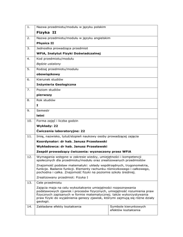 1. Nazwa przedmiotu/modułu w języku polskim Fizyka II 2. Nazwa przedmiotu/modułu w języku angielskim Physics II 3. Jednostka prowadząca przedmiot WFiA, Instytut Fizyki Doświadczalnej 4. Kod przedmiotu/modułu Będzie ustalony 5. Rodzaj przedmiotu/modułu obowiązkowy 6. Kierunek studiów Inżynieria Geologiczna 7. Poziom studiów pierwszy 8. Rok studiów I 9. Semestr letni 10. Forma zajęć i liczba godzin Wykłady: 22 Ćwiczenia laboratoryjne: 22 11. Imię, nazwisko, tytuł/stopień naukowy osoby prowadzącej zajęcia Koordynator: dr hab. Janusz Przesławski Wykładowca: dr hab. Janusz Przesławski Zespół prowadzący ćwiczenia: wyznaczony przez WFiA 12. Wymagania wstępne w zakresie wiedzy, umiejętności i kompetencji społecznych dla przedmiotu/modułu oraz zrealizowanych przedmiotów Znajomość podstaw matematyki: układy współrzędnych, trygonometria, funkcje. Badanie funkcji. Elementy rachunku różniczkowego i całkowego, pochodna i całka. Znajomość fizyki na poziomie szkoły średniej. Zrealizowany przedmiot: Fizyka I 13. Cele przedmiotu Zajęcia maja na celu wykształcenie umiejętności rozpoznawania podstawowych zjawisk i procesów fizycznych, umiejętność rozumienia praw fizycznych zapisanych w formie matematycznej; także wykorzystywania praw fizyki do wyjaśnienia genezy zjawisk, którymi zajmują się różne działy geologii. 14. Zakładane efekty kształcenia Symbole kierunkowych efektów kształcenia 15. W_1 Zna podstawowe prawa i zasady fizyki. Rozumie fizyczne podstawy nauk przyrodniczych. K1_W01, K1_W03, InżK_W01 W_2 Posiada wiedzę z fizyki na poziomie pozwalającym opisać matematycznie niektóre zjawiska przyrodnicze. K1_W02, InżK_W01 U_1 Potrafi zastosować metody fizyczne do opisu zjawisk geologicznych. K1_U02, InżK_U02 U_2 Potrafi przedstawić wyniki analizy zjawiska wykorzystując podstawowe programy komputerowe. K1_U08 K_1 Potrafi współpracować w trakcie zajęć w laboratorium fizycznym. K1_K01 K_2 Wykazuje potrzebę aktualizowania wiedzy w zakresie metod fizycznych stosowanych w geologii Treści programowe K1_K06 Wykłady: Elektryczność i magnetyzm. Oddziaływanie elektromagnetyczne, wielkości opisujące zjawiska elektromagnetyczne. Pole elektryczne. Elektryczność w atmosferze. Prąd elektryczny stały i zmienny. Przewodnictwo elektryczne w jądrze i płaszczu Ziemi. Pole geomagnetyczne. Zorze. Wariacje pola geomagnetycznego. Teorie powstania pola. Paleomagnetyzm. Zjawiska optyczne. Fale elektromagnetyczne – widmo. Odbicie, załamanie, dyspersja, absorbcja. Interferencja - holografia. Tęcza. Lidar, radar, laser. Teledetekcja. Dyfrakcja – siatka dyfrakcyjna. Polaryzacja – przez odbicie, podwójne załamanie i rozproszenie. Kolor nieba. Mikroskop polaryzacyjny. Radar geologiczny. Elementy fizyki kwantowej. Budowa materii, atomy, cząstki elementarne. Fale materii. Zasada nieoznaczoności. Zjawiska kwantowe: tunelowanie. Atom wodoru w teorii Schrödingera. Funkcja falowa. Liczby kwantowe Elementy spektroskopii. Zastosowanie fal elmgt. o różnych długościach do obserwacji oddziaływań z materią. Rodzaje widm. Metody spektroskopowe. Spektroskopia w podczerwieni; identyfikacja minerałów; zastosowania do badań strukturalnych. Inne metody spektroskopowe: NMR, EPR, spektrometria masowa, spektroskopia fotoelektronów. Mikroskop ramanowski. Promieniotwórczość naturalna i sztuczna. Przemiany promieniotwórcze – prawo, czas połowicznego zaniku. Datowanie. Promieniotwórczość w skorupie ziemskiej. Strumień cieplny a koncentracja pierwiastków radioaktywnych. Energetyka jądrowa – rozszczepienie i synteza jąder atomowych. ITER. Narzędzia nowej fizyki. Mikroskopia polaryzacyjna nowej generacji. Mikroskop sił atomowych – AFM. Wielki zderzacz hadronów LHC. Ćwiczenia laboratoryjne: Student wykonuje 8 ćwiczeń wybieranych przez prowadzących zajęcia z poniższej listy: 16. Prawo Ohma dla prądu stałego. Prawo Ohma dla prądu przemiennego. Prawa Ohma i Kirchhoffa. Elektryczne metody pomiaru temperatury. Pomiary oscyloskopowe. Badanie transformatora. Zależność oporu elektrycznego metalu i półprzewodnika od temperatury. Pomiar składowej poziomej indukcji magnetycznej Ziemi. Wyznaczanie współczynnika załamania światła dla ciał stałych. Sprawdzenie prawa Malusa. Dyfrakcja światła. Analiza spektralna za pomocą spektroskopu. Pomiar koncentracji roztworów za pomocą sacharymetru. Badanie elektrycznych źródeł światła. Pomiar przepuszczalności filtrów za pomocą spektrofotometru. Badanie zjawiska fotoelektrycznego. Prawa statystyczne rozpadów promieniotwórczych. Pomiar współczynnika pochłaniania cząstek β. Zalecana literatura Literatura podstawowa: Halliday D., Resnick R., Walker J.,2005, Podstawy fizyki, PWN WLiteratura uzupełniająca: 17. Young H., Freedman R., 2000, University Physics – Addison-Wesley 2000 Lewowski T., 1997, Wybrane działy fizyki dla studentów geologii, Mar-Mar W-w Szczeniowski Sz., 1976, Fizyka doświadczalna, PWN Boeker E., van Grandelle R., 2004, Fizyka środowiska, PWN Mortimer Z., 2001, Zarys fizyki Ziemi, Ucz. Wyd. Nauk. – Dyd. AGH Kraków Forma zaliczenia poszczególnych komponentów przedmiotu/modułu, sposób sprawdzenia osiągnięcia zamierzonych efektów kształcenia: Wykłady: Egzamin pisemny. Wynik pozytywny - uzyskanie co najmniej 50% punktów. W_1, W_2 Ćwiczenia laboratoryjne: Sprawdzian teoretyczny. Wynik pozytywny - uzyskanie co najmniej 50% punktów. W_1, W_2 Sprawdzian praktyczny. Wynik pozytywny - uzyskanie co najmniej 50% punktów. U_1, U_2, K_1, K_2 Sprawozdanie pisemne. Wynik pozytywny - uzyskanie co najmniej 50% punktów. W_1, W_2, U_1, U_2 18. Język wykładowy polski 19. Obciążenie pracą studenta: Forma aktywności studenta Średnia liczba godzin na zrealizowanie aktywności Godziny zajęć (wg planu studiów) z nauczycielem: - wykład: 22 - ćwiczenia laboratoryjne: 22 48 - konsultacje: 4 Praca własna studenta np.: - przygotowanie do za
