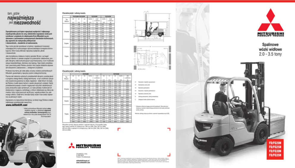 tam, gdzie Charakterystyki i udźwig masztu najważniejsza jest niezawodność Zaprojektowane pod kątem najwyższej wydajności i najlepszego współczynnika jakości do ceny, wielokrotnie nagradzane wózki podnośnikowe i urządzenia do składowania firmy Mitsubishi są produkowane z zachowaniem podwyższonych standardów technicznych, aby zapewnić ich maksymalną efektywność i niezawodność... niezależnie od zastosowania. FD/FG20N-FD/FG25N Typ Masztu Simplex Duplex Tego można się było spodziewać od jednej z największych korporacji zrzeszającej firmy wykorzystujące najnowocześniejsze rozwiązania technologiczne, które muszą oferować najwyższą wydajność, jakość i niezawodność. Jako kompleksowy dostawca możemy sprostać 98 proc. wymagań naszych klientów w zakresie urządzeń do przewożenia i składowania, ponadto oferujemy wiele konkurencyjnych opcji finansowania, w tym możliwość zakupu bezpośredniego, dzierżawy oraz leasingu. Nasz lokalny przedstawiciel z pewnością poleci Państwu produkt, który będzie dokładnie odpowiadał wskazanemu zastosowaniu i... dostępnemu budżetowi. Ponieważ rozumiemy, jak wiele zależy od pracy wózków podnośnikowych Mitsubishi, gwarantujemy najwyższy poziom obsługi technicznej. Poprzez sieć starannie wybranych przedstawicieli oferujemy wysokiej jakości programy obsługi klienta i obsługi technicznej - w tym możliwość wykupienia rozszerzonej gwarancji na układy napędowe - dzięki którym nie będą się Państwo musieli więcej martwić o awarie zakupionych urządzeń. Każdy przedstawiciel posiada w swoich magazynach dużą ilość zatwierdzonych przez producenta części zamiennych, a w razie potrzeby możliwe jest ich dostarczenie z magazynu centralnego, w którym składowane są miliony elementów i który może poszczycić się 95-proc. współczynnikiem tzw. pierwszego odbioru. Dzięki temu niemalże każdy wózek może zostać naprawiony za pierwszym razem. Zapraszamy na naszą stronę internetową, na której mogą Państwo znaleźć najbliższego przedstawiciela naszej firmy: Triplex h1 h4 h2/h5 mm 3000 3300 3740 4100 4500 5000 5500 6000 3000 3300 3700 4020 3730 4030 4300 4750 5060 5500 5990 6490 7000 mm 1995 2145 2410 2590 2800 3050 3300 3550 1995 2145 2410 2590 1800 1900 2000 2140 2260 2400 2590 2850 3050 mm 4050 4340 4770 5140 5530 6050 6550 7050 4050 4340 4750 5080 4760 5060 5360 5800 6140 6540 7040 7540 8050 mm 100 100 100 100 100 100 100 100 980 1130 1390 1570 780 880 980 1130 1250 1390 1570 1830 2040 Q@ c=500mm kg 2000 2000 2000 2000 2000 1950 1850* 1800* 2000 2000 2000 2000 2000 2000 1950 1900 1850 1800 1750* 1650* 1250* FD/FG25N h2/h5 mm 100 100 100 100 100 100 100 100 980 1130 1390 1570 780 880 980 1130 1250 1390 1570 1830 2040 Q@ c=500mm kg 2500 2500 2500 2500 2500 2400 2250* 2150* 2500 2500 2500 2500 2500 2500 2500 2400 2350 2200* 2100* 1750* 1250* Spalinowe wózki widłowe 2.0 - 3.5 tony Charakterystyki i udźwig masztu Typ Masztu Simplex Duplex www.mitforklift.com * Wózki podnośnikowe Mitsubishi zdobyły cztery niezależne nagrody w dziedzinach ergonomii, ochrony środowiska i innowacyjności przyznawane raz w roku przez stowarzyszenie Fork Lift Truck Association. FD/FG20N h3 Triplex h3 h1 mm 3030 3270 3700 4000 4500 5000 5500 6000 3000 3250 3700 4010 3690 3990 4320 4700 5060 5450 5970 6470 7000 mm 2050 2170 2430 2610 2870 3120 3370 3640 2050 2170 2430 2610 1830 1930 2050 2170 2290 2430 2610 2870 3070 FD/FG30N h4 h2/h5 mm 4090 4330 4760 5060 5560 6060 6560 7060 4060 4310 4760 5070 4750 5050 5380 5760 6120 6510 7030 7530 8060 mm 100 100 100 100 100 100 100 100 1030 1150 1420 1600 810 910 1030 1150 1270 1420 1600 1860 2060 Q@ c=500mm kg 3000 3000 3000 3000 3000 2900 2800 2700 3000 3000 3000 3000 3000 3000 3000 3000 2900 2800 2700 2350 1600 h3 h1 mm 3000 3300 3720 4000 4500 5000 5500 6000 3010 3300 3720 4000 3730 4010 4390 4700 5030 5580 6000 6510 7000 mm 2180 2300 2510 2770 3010 3260 3510 3760 2180 2300 2625 2770 1940 2060 2180 2300 2450 2630 2770 2940 3140 FD/FG35N h4 h2/h5 mm 4060 4360 4780 5060 5560 6060 6560 7060 4070 4360 4780 5060 4790 5070 5450 5760 6090 6640 7060 7570 8060 mm 100 100 100 100 100 100 100 100 1170 1290 1610 1750 930 1050 1170 1290 1430 1610 1750 1930 2120 Q@ c=500mm kg 3500 3500 3500 3500 3500 3500 3350 3250 3500 3500 3500 3500 3500 3500 3500 3500 3450 3300 3200 2350 1600 h1 Wysokość z masztem opuszczonym h2 Standardowy wolny skok h3 Wysokość podnoszenia h4 Wysokość z masztem podniesionym h5 Największy swobodny skok Q Udźwig podnoszenia, udźwig standardowy C Odległość środka ciężkości ładunku * Wskazane udźwigi wymagają użycia kół podwójnych. (Skonsultuj się z dostawcą w sprawie maksymalnego pochylenia do tyłu ażeby zachować podany udźwig) Wartości udźwigu dotyczą wózków z oponami superelastycznymi (SE). Wszystkie wymiary dotyczą wózków z oparciem ładunku. W przypadku braku tego oparcia wartość h5 zwiększa się o 390 mm (20N, 25N), 350 mm (30N), 240 mm (35N), a wartość h4 zmniejsza się o 390 mm (20N, 25N), 350 mm (30N), 240 mm (35N). FD/FG20N FD/FG25N FD/FG30N FD/FG35N CPoSM0556 (11/03) © 2003 MCFE Printed in The Netherlands [email protected] www.mitforklift.com NOTE: Performance specifications may vary depending on standard manufacturing tolerances, vehicle condition, types of tyre, floor or surface conditions, applications or operating environment. Trucks may be shown with non-standard options. Specific performance requirements and locally available configurations should be discussed with your distributor of Mitsubishi forklift trucks. Mitsubishi follows a policy of continual product improvement. For this reason, some materials, options and specifications could change without notice. Najważniejsze cechy 1.1 1.2 1.3 1.4 1.5 1.6 1.8 1.9 2.1 2.2 2.3 3.1 3.2 3.3 3.5 3.6 3.7 4.1 4.2 4.3 4.4 4.5 4.7 4.8 4.12 4.19 4.20 4.21 4.22 4.23 4.24 4.31 4.32 4.33 4.34 4.35 4.36 5.1 5.2 5.3 5.5 5.7 5.9 5.10 7.1 7.2 7.3 7.4 7.5 8.1 8.2