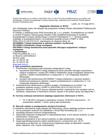 Projekt Przedsiębiorca na mAXA nr UDA-POKL.02.01.01-00-213/12 jest współfinansowany ze środków Unii Europejskiej, w ramach Europejskiego Funduszu Społecznego, realizowany pod nadzorem Polskiej Agencji Rozwoju Przedsiębiorczości Lublin, dn. 14 maja 2014 r. Zapytanie ofertowe nr 9/213 (do niniejszego trybu nie stosuje się przepisów Ustawy Prawo Zamówień Publicznych) Szanowni Państwo, W związku z realizacją przez PAIZ Konsulting Sp. z o.o. projektu „Przedsiębiorca na mAXA” w ramach Programu Operacyjnego Kapitał Ludzki współfinansowanego ze środków Europejskiego Funduszu Społecznego w ramach Poddziałania 2.1.1 „Rozwój kapitału ludzkiego w przedsiębiorstwach, na podstawie zawartej umowy z PARP nr UDAPOKL.02.01.01-00-213/12-01, zapraszamy do złożenia oferty na: 551200000-7 Usługi hotelarskie w zakresie spotkań i konferencji 55110000-4 Hotelarskie usługi noclegowe 55270000-3 Usługi świadczone przez placówki oferujące wyżywienie i miejsca noclegowe I. Zamawiający PAIZ Konsulting Sp. z o.o. ul. Boczna Lubomelskiej 4 20-070 Lublin tel.: 81 533 51 48 tel.: 81 533 51 48 www.paiz.com.pl II. Opis przedmiotu zamówienia 1. Przedmiotem zamówienia jest realizacja następujących usług: a. wyżywienie (55270000-3 Usługi świadczone przez placówki oferujące wyżywienie i miejsca noclegowe) i nocleg (55110000-4 Hotelarskie usługi noclegowe) świadczone zgodnie z opisem przedstawionym w Załączniku nr 1 do niniejszego Zapytania ofertowego, b. wynajem sali szkoleniowej (551200000-7 Usługi hotelarskie w zakresie spotkań i konferencji) świadczone zgodnie z opisem przedstawionym w Załączniku nr 1 do niniejszego Zapytania ofertowego. 2. Zamówienie jest realizowane w ramach projektu „Przedsiębiorca na mAXA”, na podstawie zawartej umowy z PARP nr UDA-POKL.02.01.01-00-213/12-01 3. Zapytanie ofertowe nr 9/213 dotyczy zakwaterowania i wyżywienia oraz wynajem sali na szkolenie, realizowane w Kazimierzu Dolnym, łącznie 2 dni pobytu grupy wg załącznika 1. III. Terminy realizacji zamówienia objętego zapytaniem ofertowym nr 9/213,: 1. 16-17.06.2014; (przyjazd uczestników i trenera 15.06.2014 wieczorem) – 15 uczestników szkoleń, 1 trener, jedna sala szkoleniowa IV. Warunki udziału w postępowaniu (kryteria formalne): O udzielenie zamówienia mogą ubiegać się Wykonawcy, którzy spełniają poniższe warunki: 1. nie są powiązani osobowo ani kapitałowo z firmą PAIZ Konsulting Sp. z o.o. 2. posiadają standard minimum trzygwiazdkowy 3. dysponują miejscami noclegowymi w odpowiedniej ilości, w tym samym budynku co sale szkoleniowe i restauracja 4. zapewnią wyżywienie w tym samym budynku co sale szkoleniowe i noclegi 5. dysponują klimatyzowanymi salami szkoleniowymi o powierzchni min. 40 m2, wyposażoną we flipchart, art. piśmiennicze (zapasowy papier do flipcharta i mazaki), ekran, telewizor, dvd, rzutnik multimedialny Projekt współfinansowany przez Unię Europejską w ramach Europejskiego Funduszu Społecznego 1 6. lokalizacja szkolenia będzie w Kazimierzu Dolnym, 7. Łączny koszt wyżywienia, noclegów i sali konferencyjnej zgodnie z opisem przedmiotu zamówienia dla grupy 16-osobowej (15 uczestników i 1 trener) w terminie 16-17.06.2014 nie może przekraczać 9 420,00 zł brutto. Zamawiający dokona oceny spełnienia przez Wykonawcę warunków udziału w postępowaniu na podstawie żądanych dokumentów i oświadczeń, zgodnie z formułą „spełnia-nie spełnia”. V. Kryteria jakościowe: Za spełnienie każdego z poniższych kryteriów przyznawane są 4 punkty: 1. możliwość bezpłatnego korzystania z Internetu z dostępem do sieci Wi-Fi; 2. możliwość korzystania z bezpłatnego monitorowanego parkingu przez uczestników i trenerów; 3. zapewnienie owoców podczas przerw kawowych; 4. zapewnienie kawy z ekspresu podczas przerw kawowych; 5. zapewnienie posiłków wegetariańskich na obiedzie Oferta, która ma największą liczbę punktów jakościowych otrzymuje maksymalną ilość punktów tj. 20 pkt. VI. Opis sposobu przygotowania oferty 1. Oferta powinna zostać przygotowana zgodnie z załącznikiem nr 2 do niniejszego zapytania. 2. Zaoferowana cena powinna uwzględniać wykonanie wszystkich prac i czynności świadczonych przez okres i na warunkach określonych w ofercie. 3. Ceny podane w ofercie nie podlegają zmianom przez okres realizacji zamówienia. 4. Ceny należy wyrazić w PLN w kwocie brutto, obejmującej podatek VAT od towaru i usług, z dokładnością do dwóch miejsc po przecinku. 5. Rozliczenia między Zamawiającym, a Wykonawcą będą prowadzone w PLN. 6. Zamawiający zastrzega sobie możliwość zmniejszenia lub zwiększenia zamówienia. VII. Miejsce oraz termin dostarczania ofert 1. Ofertę wraz z załącznikami i propozycją menu należy złożyć do dnia 28 maja 2014 r. do godz. 16.00. e-mailem, faksem, bądź listownie. 2. Każdorazowo korespondencję e-mailową należy kierować na adres: [email protected] 3. Zamawiający może przedłużyć termin przesyłania ofert. O przedłużeniu terminu składania ofert Zamawiający niezwłocznie powiadamia wszystkich Wykonawców. 4. Wykonawca może, przed upływem terminu przesyłania ofert, zmienić lub wycofać ofertę 5. W toku badania i oceny ofert Zamawiający może poprosić Wykonawców o wyjaśnienia dotyczące treści złożonych ofert. VIII. Ocena ofert Zamawiający zastrzega sobie prawo do nieskorzystania z ofert w przypadku, gdy stawki cenowe będą przekraczały kwoty z budżetu projektu. Ocena ofert składa się z dwóch etapów: a) Etap 1 - Zamawiający dokonuje oceny spełnienia przez Wykonawcę warunków udziału w postępowaniu na podstawie oświadczenia Wykonawcy stanowiącego załącznik do niniejszego zapytania, zgodnie z formułą „spełnia-nie spełnia”. Do oferty należy dołączyć propozycję menu dla grupy (po min. 5 propozycji menu na obiad i kolację, zgodnie ze standardem hotelu) Projekt współfinansowany przez Unię Europejską w 