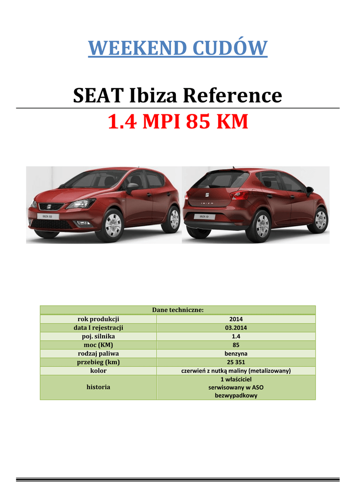 WEEKEND CUDÓW SEAT Ibiza Reference 1.4 MPI 85 KM Dane techniczne: rok produkcji data I rejestracji poj. silnika moc (KM) rodzaj paliwa przebieg (km) kolor historia 2014 03.2014 1.4 85 benzyna 25 351 czerwień z nutką maliny (metalizowany) 1 właściciel serwisowany w ASO bezwypadkowy Wyposażenie: BEZPIECZEŃSTWO ELEKTRONIKA o ABS, o Przednie poduszki powietrzne o Boczna poduszka powietrzna chroniąca również głowę + system przypominający o konieczności zapięcia pasów na 2 fotelach o Zaczepy iSOFIX i Top Tether przy siedzeniach tylnej kanapy (1+1) o Zawieszenie COMFORT NADWOZIE o Pojedyncze światła jednoogniskowe o Światła do jazdy dziennej o Tylny spoiler z dodatkowym światłem „STOP” o Elektryczne, podgrzewane lusterka boczne o 15-calowe felgi stalowe „Mamba” o Koło zapasowe o Klimatyzacja manualna o Centralny zamek z pilotem o Pakiet audio 1: Instalacja stereo z 4 głośnikami + radio + CD + AUX-in + pilot sterowania przy kierownicy WNĘTRZE o Składana tylna kanapa (dzielona) o Elektrycznie sterowane szyby boczne z przodu o Zamykany i podświetlany schowek o pojemności 10.7 l w desce rozdzielczej o Fotel kierowcy z regulacją wysokości o Fotele typu Comfort o Kierownica wielofunkcyjna i dźwignia zmiany biegów z tworzywa sztucznego OPCJE DODATKOWE: ESC Reflektory przeciwmgielne z przodu z funkcją doświetlania zakrętów Cena katalogowa nowego auta 51 243,00 zł Cena weekendu cudów 34 900 zł Gwarancja Fabryczna
