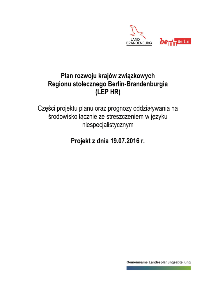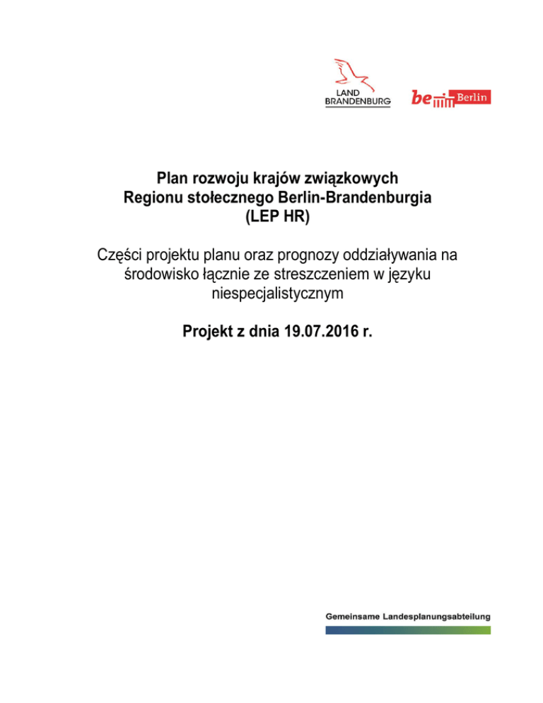 Plan rozwoju krajów związkowych Regionu stołecznego Berlin-Brandenburgia (LEP HR) Części projektu planu oraz prognozy oddziaływania na środowisko łącznie ze streszczeniem w języku niespecjalistycznym Projekt z dnia 19.07.2016 r. Części projektu planu oraz prognozy oddziaływania na środowisko łącznie ze streszczeniem w języku niespecjalistycznym Projekt planu rozwoju krajów związkowych dla regionu stołecznego Berlin-Brandenburgia (LEP HR), stan na 19.07.2016 r. Spis treści I II. A II. B III III. 1 III. 2 III. 3 III. 4 III. 5 III. 6. III. 7 III. 8 III. 9 IV V Podstawy prawne i relacja LEP HR do innych programów i planów zagospodarowania przestrzennego Warunki ramowe i strukturalno-przestrzenne trendy rozwojowe dla regionu stołecznego Założenia rozwojowe i regulacyjne LEP HR Ustalenia tekstowe i uzasadnienia Region stołeczny Rozwój gospodarczy Miejscowości centralne, obszary realizacji funkcji głównych, zabezpieczenie potrzeb bytowych i handel detaliczny Krajobrazy kulturowe Rozwój osadnictwa Rozwój terenów otwartych Rozwój komunikacji i infrastruktury Klimat, powodzie i energia Współpraca międzygminna i regionalna Objaśnienia do strategicznej oceny oddziaływania na środowisko w formie streszczenia oraz podane działania monitorujące [zostanie sporządzone po procedurze udziału społeczeństwa Mapa ustaleń Rozdział I Podstawy prawne i relacja LEP HR do innych programów i planów zagospodarowania przestrzennego Plan rozwoju krajów związkowych dla regionu stołecznego Berlin-Brandenburgia (LEP HR) stanowi wykonanie przez wspólny organ planistyczny krajów związkowych Berlin i Brandenburgia zlecenia planowania i koordynacji zawartego w prawie federalnym i krajowym. Federalna ustawa o gospodarce przestrzennej (ROG) oraz umowa o planowaniu krajów związkowych zawierają podstawy prawne dla sporządzenia wspólnych planów rozwoju krajów związkowych. Dla stworzonego z krajów związkowych Berlin i Brandenburgia regionu stołecznego wspólne planowanie na poziomie krajów związkowych realizowane jest poprzez ogół programów i planów wysokiego stopnia. Obok LEP HR obowiązują następujące dokumenty planistyczne: Program rozwoju krajów związkowych 2007 (LEPro 2007), § 19 ustęp 11 programu rozwoju krajów związkowych (LEPro) z roku 2003 oraz Plan rozwoju krajów związkowych dotyczący terenów portu lotniczego (LEP FS) z roku 2006. LEP FS nakłada się jako merytoryczny i przestrzenny plan częściowy na ustalenia LEP HR. LEP HR zastępuje plan rozwoju krajów związkowych Berlin-Brandenburgia (LEP B-B). 1/12 Części projektu planu oraz prognozy oddziaływania na środowisko łącznie ze streszczeniem w języku niespecjalistycznym LEP HR zawiera ustalenia dotyczące rozwoju, ładu przestrzennego i zabezpieczenia regionu stołecznego, w szczególności odnośnie funkcji i wykorzystania przestrzeni i uchwalany jest w formie rozporządzenia rządu kraju związkowego obowiązującego na terenie danego kraju związkowego. Adresatami planu rozwoju krajów związkowych, przy którego tworzeniu współdziałają wszystkie resorty rządów krajów związkowych, są: jednostki samorządu terytorialnego, planowanie regionalne, planowanie specjalistyczne, pozostałe instytucje publiczne oraz osoby prawa prywatnego zgodnie z § 4 ustęp 1 Ustawy o gospodarce przestrzennej (ROG). Z uwagi na hierarchiczną relację pomiędzy planami gospodarki przestrzennej wysokiego stopnia oraz planami regionalnymi, cele i zasady planu wyższej rangi wypierają sprzeczne z nimi cele i zasady planów regionalnych, jeżeli nie są one jeszcze dopasowane do zmienionego w międzyczasie lub późnej uchwalonego planu gospodarki przestrzennej obowiązującego na terenie całego kraju związkowego. Regulacje planu są zróżnicowane w taki sposób, że mają za przedmiot jako cele gospodarki przestrzennej, których należy przestrzegać, wiążące wytyczne w formie przestrzennie i merytorycznie określonych lub możliwych do określenia, rozważonych przez organy odpowiedzialne za gospodarkę przestrzenną ustaleń, które nie są już możliwe do zmian w ramach rozważań lub jako konieczne do uwzględnienia zasady gospodarki przestrzennej mają za przedmiot stwierdzenia dotyczące rozwoju, ładu i zabezpieczenia przestrzeni, jako wytyczne do następujących później decyzji podejmowanych na podstawie rozważań i według uznania. Ustalenia planu rozwoju kraju związkowego oznaczane są literą "Z" w przypadku celów gospodarki przestrzennej oraz "G" w przypadku zasad gospodarki przestrzennej. Rozdział II. B Założenia rozwojowe i regulujące LEP HR Zasadniczą podstawę planu rozwoju krajów związkowych dla regionu stołecznego stanowią opisane w rozdziale II A warunki ramowe i przestrzenne trendy rozwojowe w Berlinie i Brandenburgii. Te warunki i trendy traktowane są z punktu widzenia gospodarki przestrzennej w odniesieniu do ich skutków dla struktury przestrzennej i oceniane pod względem ich znaczenia dla planowania na poziomie krajów związkowych. Zarządzanie przestrzenią poprzez planowanie na poziomie krajów związkowych następuje tylko wtedy, gdy jest to możliwe i konieczne za pomocą będących do dyspozycji instrumentów gospodarki przestrzennej w celu uzyskania zrównoważonego rozwoju całej przestrzeni. LEP HR zawiera ustalenia odnośnie ładu przestrzennego, aby w rozumieniu ustawy ROG uzgodnić ze sobą różne wymagania związane z przestrzenią, regulować konflikty wynikające z użytkowania przestrzeni oraz zabezpieczyć potrzeby poszczególnych sposobów użytkowania i funkcji przestrzeni. 2/12 Części projektu planu oraz prognozy oddziaływania na środowisko łącznie ze streszczeniem w języku niespecjalistycznym LEP HR różnicuje region stołeczny Berlin-Brandenburgia w przestrzenie strukturalne Berlin i Brandenburga wspólnie tworzą region stołeczny z jego w różny sposób ukształtowanymi przestrzeniami strukturalnymi - Berline