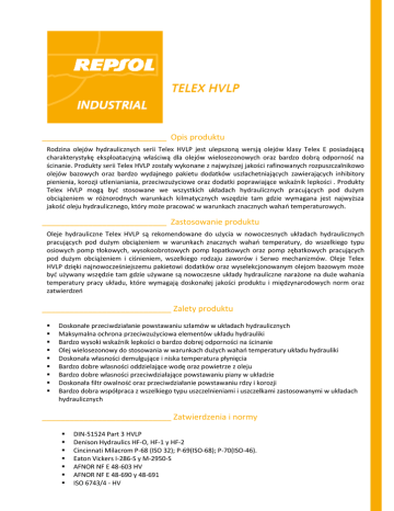 ___________________________ Opis produktu Rodzina olejów hydraulicznych serii Telex HVLP jest ulepszoną wersją olejów klasy Telex E posiadającą charakterystykę eksploatacyjną właściwą dla olejów wielosezonowych oraz bardzo dobrą odporność na ścinanie. Produkty serii Telex HVLP zostały wykonane z najwyższej jakości rafinowanych rozpuszczalnikowo olejów bazowych oraz bardzo wydajnego pakietu dodatków uszlachetniających zawierających inhibitory pienienia, korozji utlenianiania, przeciwzużyciowe oraz dodatki poprawiające wskaźnik lepkości . Produkty Telex HVLP mogą być stosowane we wszystkich układach hydraulicznych pracujących pod dużym obciążeniem w różnorodnych warunkach kilmatycznych wszędzie tam gdzie wymagana jest najwyższa jakość oleju hydraulicznego, który może pracować w warunkach znacznych wahań temperaturowych. ___________________________ Zastosowanie produktu Oleje hydrauliczne Telex HVLP są rekomendowane do użycia w nowoczesnych układach hydraulicznych pracujących pod dużym obciążeniem w warunkach znacznych wahań temperatury, do wszelkiego typu osiowych pomp tłokowych, wysokoobrotowych pomp łopatkowych oraz pomp zębatkowych pracujących pod dużym obciążeniem i ciśnieniem, wszelkiego rodzaju zaworów i Serwo mechanizmów. Oleje Telex HVLP dzięki najnowocześniejszemu pakietowi dodatków oraz wyselekcjonowanym olejom bazowym może być używany wszędzie tam gdzie używane są nowoczesne układy hydrauliczne narażone na duże wahania temperatury pracy układu, które wymagają doskonałej jakości produktu i międzynarodowych norm oraz zatwierdzeń ____________________________ Zalety produktu Doskonałe przeciwdziałanie powstawaniu szlamów w układach hydraulicznych Maksymalna ochrona przeciwzużyciowa elementów układu hydrauliki Bardzo wysoki wskaźnik lepkości o bardzo dobrej odporności na ścinanie Olej wielosezonowy do stosowania w warunkach dużych wahań temperatury układu hydrauliki Doskonała własności demulgujące i niska temperatura płynięcia Bardzo dobre własności oddzielające wodę oraz powietrze z oleju Bardzo dobre własności przeciwdziałające powstawaniu piany w układzie Doskonała filtr owalność oraz przeciwdziałanie powstawaniu rdzy i korozji Bardzo dobra współpraca z wszelkiego typu uszczelnieniami i uszczelkami zastosowanymi w układach hydraulicznych ____________________________ Zatwierdzenia i normy DIN-51524 Part 3 HVLP Denison Hydraulics HF-O, HF-1 y HF-2 Cincinnati Milacrom P-68 (ISO 32); P-69(ISO-68); P-70(ISO-46). Eaton Vickers I-286-S y M-2950-S AFNOR NF E 48-603 HV AFNOR NF E 48-690 y 48-691 ISO 6743/4 - HV ____________________________ Charakterystyczne dane techniczne Jednostka Metoda Wartość Wartość Wartość ISO Grade 32 46 68 o Lepkość Kinematyczna, 100 C cSt ASTM D 445 6,2 8,2 11,3 Lepkość Kinematyczna, 40oC cSt ASTM D 445 32 46 68 ASTM D 2270 150 150 150 Wskaźnik Lepkości ≥C ASTM D 92 215 225 235 Temperatura zapłonu, C/O Temperatura płynięcia ≥C ASTM D 97 -33 -33 -33 o ASTM D 130 1b 1b 1b Korozja miedzi 3h at 100 C mg KOH/g ASTM D 943 2 2 2 Utlenianie, NN at 2500 h. FZG, test DIN 51354 12 12 12 ____________________________ Opakowania Telex HVLP 32 : 875 Kg mauzer, beczki 185 i 45 Kg Telex HVLP 46 : cysterna, 875 Kg mauzer, beczki 185 i 45 Kg, 5 litrowe metalowe opakowania Telex HVLP 46 : cysterna, 875 Kg mauzer, beczki 185 i 45 Kg, 5 litrowe metalowe opakowania Karta katalogowa : wydanie 2, Maj 2004