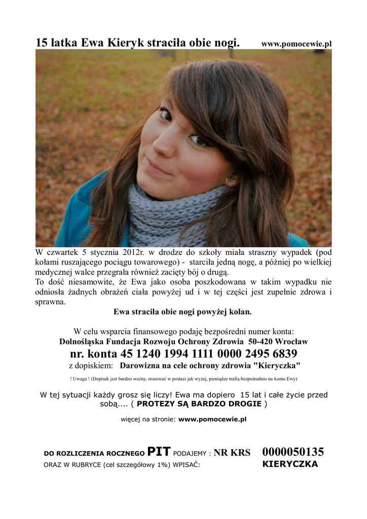 15 latka Ewa Kieryk straciła obie nogi. www.pomocewie.pl W czwartek 5 stycznia 2012r. w drodze do szkoły miała straszny wypadek (pod kołami ruszającego pociągu towarowego) - starciła jedną nogę, a póżniej po wielkiej medycznej walce przegrała również zacięty bój o drugą. To dość niesamowite, że Ewa jako osoba poszkodowana w takim wypadku nie odniosła żadnych obrażeń ciała powyżej ud i w tej części jest zupełnie zdrowa i sprawna. Ewa straciła obie nogi powyżej kolan. W celu wsparcia finansowego podaję bezpośredni numer konta: Dolnośląska Fundacja Rozwoju Ochrony Zdrowia 50-420 Wrocław nr. konta 45 1240 1994 1111 0000 2495 6839 z dopiskiem: Darowizna na cele ochrony zdrowia "Kieryczka" ! Uwaga ! (Dopisek jest bardzo ważny, stosować w postaci jak wyżej, pieniądze trafią bezpośrednio na konto Ewy) W tej sytuacji każdy grosz się liczy! Ewa ma dopiero 15 lat i całe życie przed sobą.... ( PROTEZY SĄ BARDZO DROGIE ) więcej na stronie: www.pomocewie.pl DO ROZLICZENIA ROCZNEGO PIT PODAJEMY : NR KRS 0000050135 ORAZ W RUBRYCE (cel szczegółowy 1%) WPISAĆ: KIERYCZKA
