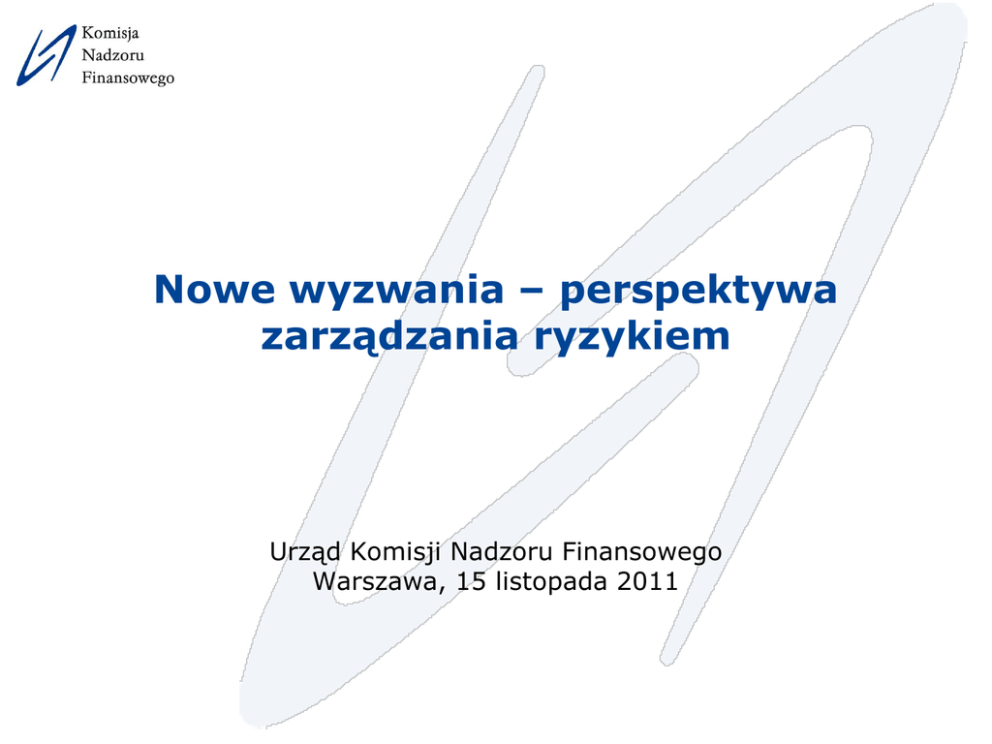 Nowe wyzwania – perspektywa zarządzania ryzykiem Urząd Komisji Nadzoru Finansowego Warszawa, 15 listopada 2011 W skrócie Panta rhei (Heraklit z Efezu) Nowe warunki Komunikacja Globalizacja Wrażliwość Nieciągłość Korelacja Nieufność Erozja wiarygodności Nowe warunki Bankowość elektroniczna Moral hazard Alienacja sfery finansowej Mobilność kapitału Natura cykliczności Zabezpieczenia (CDS) Nowe warunki – nieciągłość i korelacja Metodycznie jedno z najważniejszych zagadnień w pomiarze ryzyka Adekwatność modeli zbudowanych w innych jakościowo warunkach (zmiana otoczenia, populacji) i przy innych zależnościach między zmiennymi (korelacja) Adekwatność scenariuszy w stress testach Nowe warunki – erozja wiarygodności Pewne jak w banku? Wagi ryzyka i limity koncentracji dla: - ekspozycji wobec banków, - ekspozycji wewnątrzgrupowych, - ekspozycji wobec państw. Co się stanie jeśli erozja dotknie ostatni bastion – banki centralne? Czy „drukowane” pieniądze będą tyle warte realnie ile nominalne zobowiązanie? Nowe warunki – moral hazard Za duży by upaść? • Żaden duży bank europejski nie powinien upaść. • Wyższe limity gwarancji depozytów (nawet nieograniczone). • Fundusze restrukturyzacyjne. • Zarządzanie kryzysowe – transfer aktywów i płynności. • EFSF rozszerzony na banki. Nowe warunki – alienacja sfery finansowej Hazard za cudze pieniądze (deponentów)? Wielkośd rynku finansowego Samowystarczalny rynek finansowy - wysublimowane kasyno? Handel na własny rachunek Banki Potrzeby gospodarki realnej Konsumenci i podmioty gospodarcze np. opcje • Ryzyko operacyjne (ING Barings, Societe Generale, UBS itp.) Nowe warunki – mobilność kapitału Presja na zwrot (z kapitału, akcji) Krótkoterminowa perspektywa zarządzania (także ryzykiem) Zarządzanie ryzykiem to przynajmniej długi dystans (a może maraton) - przychody są szybsze niż koszty ryzyka w sprincie, później dają się wyprzedzić i to trudno je dogonić Póki gra muzyka, musisz tańczyć. My wciąż tańczymy. Charles „Chuck” Prince – b. CEO Citigroup Nowe warunki – natura cykliczności Prymat polityki nad ekonomią Stymulowanie rozwoju gospodarczego Niskie stopy procentowe (tani pieniądz) Przeszacowane aktywa (bańki spekulacyjne) Deregulacja Niska jakośd aktywów (utrata wartości) Kryzys Presja na zwrot z kapitału Słabośd nadzoru Nowe warunki - zabezpieczenia • Co – – – można zrobić z ryzykiem?: unikać (brak ekspozycji) przenosić (ubezpieczenia) ograniczać skutki (zabezpieczenia) • Ostatnie praktyki: – przenoszenie: • subprime -> MBO, SDO • banki -> państwa -> banki (Europa) • AIG – ograniczanie: • CDS • nieruchomości (Hiszpania) Mapa ryzyk – tak było Upadłośd Ryzyko kredytowe Wynik finansowy Wypłacalnośd Przejęcie Ryzyko operacyjne Wsparcie (publiczne) Mapa ryzyk – tak jest Plotka Kryzys fiskalny Przejęcie ? Reputacja/ wiarygodnośc Płynnośd Wsparcie (publiczne)? Agencje ratingowe Wynik finansowy Inne ryzyka Upadłośd Wypłacalnośd Przejęcie ? Wsparcie (publiczne)? Reakcja – podejście „czeskie”? Jak tam było, tak tam było, zawsze jakoś było. Jeszcze nigdy tak nie było, żeby jakoś nie było. Jaroslav Hasek – Przygody dobrego wojaka Szwejka podczas wojny światowej Nowe warunki – nowa reakcja Do kasyna z własnymi pieniędzmi - rozdzielenie bankowości inwestycyjnej i komercyjnej (detalicznej) Nie każdy może wejść do kasyna (nawet z własnymi pieniędzmi) - konwersja ryzyka Każde ryzyko klienta kredytowego jest ryzykiem banku Stress testy (wszystkie scenariusze są możliwe, przyszłość nie jest już kontynuacją przeszłości – „sięgaj gdzie wzrok nie sięga…”) Wzrost samowystarczalności („licz na siebie”) – bufory płynnościowe i kapitałowe (uwzględniające wyniki stress testów) Nowe warunki – nowa reakcja Plany awaryjne (zanik rynków, brak wsparcia właścicielskiego, brak wsparcia państwa) Nie ma lepszej metody na „too big too fail” jak zmniejszenie rozmiaru – SIFI: - rozwiązania organizacyjne ułatwiające podział i plan podziału (living will) - dodatkowe wymogi kapitałowe (bufor ale także ograniczenie wzrostu) - koncepcja preferowania kapitałowego rozwoju poprzez podmioty zależne a nie oddziały (FSA) Tylko zdrowe państwo jest w stanie uratować bank z problemami, w państwie zagrożonym bank będzie zawsze eksponowany na dodatkowe ryzyko Nowe warunki – nowa reakcja Nie można lekceważyć żadnego sygnału – może to być „wierzchołek góry lodowej” lub początek „efektu kuli śnieżnej” Przygotowane plany działania na najbardziej prawdopodobne scenariusze bo wobec dynamiki zdarzeń zabraknie czasu na ich opracowanie W planach działań oprócz zadań operacyjnych równie ważna jest komunikacja Dziękuję za uwagę.