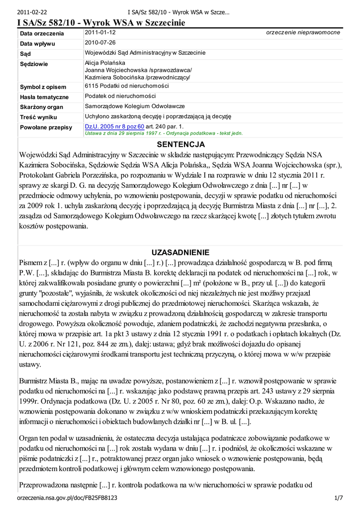 2011-02-22 I SA/Sz 582/10 - Wyrok WSA w Szcze… I SA/Sz 582/10 - Wyrok WSA w Szczecinie Data orzeczenia 2011-01-12 Data wpływu 2010-07-26 Sąd Wojewódzki Sąd Administracyjny w Szczecinie Sędziowie Symbol z opisem Alicja Polańska Joanna Wojciechowska /sprawozdawca/ Kazimiera Sobocińska /przewodniczący/ 6115 Podatki od nieruchomości Hasła tematyczne Podatek od nieruchomości Skarżony organ Samorządowe Kolegium Odwoławcze Treść wyniku Uchylono zas karżoną decyzję i poprzedzającą ją decyzję Powołane przepisy Dz.U. 2005 nr 8 poz 60 art. 240 par. 1. orzeczenie nieprawomocne Ustawa z dnia 29 sierpnia 1997 r. - Ordynacja podatkowa - tekst jedn. SENTENCJA Wojewódzki Sąd Administracyjny w Szczecinie w składzie następującym: Przewodniczący Sędzia NSA Kazimiera Sobocińska, Sędziowie Sędzia WSA Alicja Polańska,, Sędzia WSA Joanna Wojciechowska (spr.), Protokolant Gabriela Porzezińska, po rozpoznaniu w Wydziale I na rozprawie w dniu 12 stycznia 2011 r. sprawy ze skargi D. G. na decyzję Samorządowego Kolegium Odwoławczego z dnia [...] nr [...] w przedmiocie odmowy uchylenia, po wznowieniu postępowania, decyzji w sprawie podatku od nieruchomości za 2009 rok 1. uchyla zaskarżoną decyzję i poprzedzającą ją decyzję Burmistrza Miasta z dnia [...] nr [...], 2. zasądza od Samorządowego Kolegium Odwoławczego na rzecz skarżącej kwotę [...] złotych tytułem zwrotu kosztów postępowania. UZASADNIENIE Pismem z [...] r. (wpływ do organu w dniu [...] r.) [...] prowadząca działalność gospodarczą w B. pod firmą P.W. [...], składając do Burmistrza Miasta B. korektę deklaracji na podatek od nieruchomości na [...] rok, w której zakwalifikowała posiadane grunty o powierzchni [...] m² (położone w B., przy ul. [...]) do kategorii grunty "pozostałe", wyjaśniła, że wskutek okoliczności od niej niezależnych nie jest możliwy przejazd samochodami ciężarowymi z drogi publicznej do przedmiotowej nieruchomości. Skarżąca wskazała, że nieruchomość ta została nabyta w związku z prowadzoną działalnością gospodarczą w zakresie transportu drogowego. Powyższa okoliczność powoduje, zdaniem podatniczki, że zachodzi negatywna przesłanka, o której mowa w przepisie art. 1a pkt 3 ustawy z dnia 12 stycznia 1991 r. o podatkach i opłatach lokalnych (Dz. U. z 2006 r. Nr 121, poz. 844 ze zm.), dalej: ustawa; gdyż brak możliwości dojazdu do opisanej nieruchomości ciężarowymi środkami transportu jest techniczną przyczyną, o której mowa w w/w przepisie ustawy. Burmistrz Miasta B., mając na uwadze powyższe, postanowieniem z [...] r. wznowił postępowanie w sprawie podatku od nieruchomości na [...] r. wskazując jako podstawę prawną przepis art. 243 ustawy z 29 sierpnia 1999r. Ordynacja podatkowa (Dz. U. z 2005 r. Nr 80, poz. 60 ze zm.), dalej: O.p. Wskazano nadto, że wznowienia postępowania dokonano w związku z w/w wnioskiem podatniczki przekazującym korektę informacji o nieruchomości i obiektach budowlanych działki nr [...] w B. ul. [...]. Organ ten podał w uzasadnieniu, że ostateczna decyzja ustalająca podatniczce zobowiązanie podatkowe w podatku od nieruchomości na [...] rok została wydana w dniu [...] r. i podniósł, że okoliczności wskazane w piśmie podatniczki z [...] r., potraktowanej przez organ jako wniosek o wznowienie postępowania, będą przedmiotem kontroli podatkowej i głównym celem wznowionego postępowania. Przeprowadzona następnie [...] r. kontrola podatkowa na w/w nieruchomości w sprawie podatku od orzeczenia.nsa.gov.pl/doc/FB25FB8123 1/7 2011-02-22 I SA/Sz 582/10 - Wyrok WSA w Szcze… nieruchomości doprowadziła do stwierdzenia w protokole kontroli, że dojazd do działki jest możliwy przez działkę nr [...] i [...] i przez działkę [...], do której kontrolowana ma ustanowioną służebność drogi koniecznej, a "głównym problemem kontrolowanej jest działka [...], gdyż jest ona oddzielona ogrodzeniem z szerokimi bramami wjazdowymi". Stwierdzono dalej w protokole, że w świetle przepisów art. 1a ust. 1 pkt 3 ustawy, kontrolowana powinna płacić podatek od nieruchomości według maksymalnych stawek związanych z działalnością gospodarczą. Jak wynika z adnotacji skarżącej na protokole z kontroli, nie zgodziła się ona z jego treścią. Burmistrz Miasta B. decyzją z [...] r. nr [...], wydaną z powołaniem się na przepis art. 245 § 1 pkt 2 O.p., odmówił uchylenia decyzji nr [...] z dnia [...] r. w sprawie wymiaru podatku od nieruchomości za rok [...] w części dotyczącej stawki za grunty. Przywołując w uzasadnieniu przepisy art. 1a ust. 1 pkt 3 ustawy oraz wyjaśniając, że omawiane wyłączenie z zakresu przedmiotów opodatkowania gruntów związanych z prowadzeniem działalności gospodarczej dotyczy sytuacji, gdy grunt taki nie jest i nie może być wykorzystywany do prowadzenia tej działalności ze względów technicznych, wskazano dalej, że za "względy techniczne", o których mowa w w/w przepisie prawa, nie można uznać chwilowej przeszkody w postaci ogrodzeń w gospodarczym wykorzystaniu nieruchomości. Organ wskazał, że wznowienie postępowania nie potwierdziło złego stanu technicznego gruntu podatniczki i stwierdził, że pismo D.G. z [...] r. nie wniosło żadnych nowych okoliczności mających wpływ na zmianę stanu faktycznego ustalonego przez organ podatkowy po złożeniu wniosku z dnia [...] r. Stwierdzono dalej, że z uwagi na niestwierdzenie istnienia przesłanki określonej w art. 240 § 1 pkt 5 O. p., należało odmówić uchylenia dotychczasowej decyzji. W odwołaniu od decyzji, wnosząc o jej uchylenie, D.G. zarzuciła naruszenie przepisu art. 180, 187, 197, 290 O. p. oraz błędną wykładnię przepisu art. 1a ust. 1 pkt 3 O. p. Uzasadniając powyższe podatniczka wskazała, że protokół z kontroli odebrała [...] r., 14-dniowy termin do zgłoszenia uwag upływał [...] r., a już [...] r. organ podatkowy doręczył skarżącej postanowieni