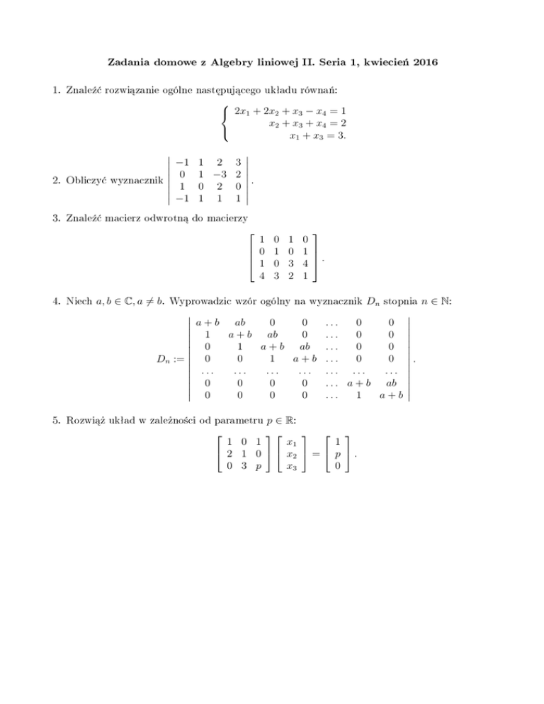 Zadania domowe z Algebry liniowej II. Seria 1, kwiecie« 2016 1. Znale¹¢ rozwi¡zanie ogólne nast¦puj¡cego ukªadu równa«: 2x1 + 2x2 + x3 − x4 = 1 x2 + x3 + x4 = 2 x1 + x3 = 3. 2. Obliczy¢ wyznacznik −1 0 1 −1 1 2 3 1 −3 2 . 0 2 0 1 1 1 3. Znale¹¢ macierz odwrotn¡ do macierzy 1 0 1 4 4. Niech a, b ∈ C, a 6= b. 0 1 0 3 1 0 3 2 0 1 . 4 1 Wyprowadzic wzór ogólny na wyznacznik a + b ab 0 0 1 a + b ab 0 0 1 a + b ab 0 1 a+b Dn := 0 ... . . . . . . ... 0 0 0 0 0 0 0 0 ... ... ... ... ... ... ... stopnia 0 0 0 0 0 0 0 0 . ... . . . a + b ab 1 a+b p ∈ R: 1 0 1 x1 1 2 1 0 x2 = p . 0 3 p x3 0 5. Rozwi¡» ukªad w zale»no±ci od parametru Dn n ∈ N: