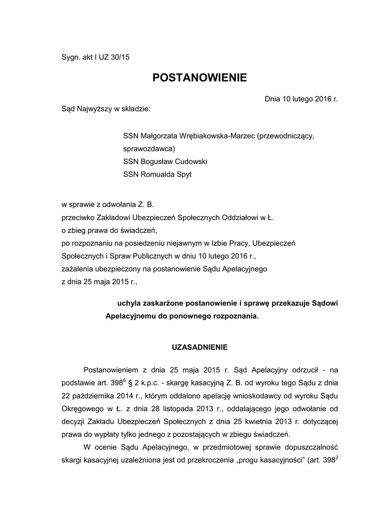 Sygn. akt I UZ 30/15 POSTANOWIENIE Dnia 10 lutego 2016 r. Sąd Najwyższy w składzie: SSN Małgorzata Wrębiakowska-Marzec (przewodniczący, sprawozdawca) SSN Bogusław Cudowski SSN Romualda Spyt w sprawie z odwołania Z. B. przeciwko Zakładowi Ubezpieczeń Społecznych Oddziałowi w Ł. o zbieg prawa do świadczeń, po rozpoznaniu na posiedzeniu niejawnym w Izbie Pracy, Ubezpieczeń Społecznych i Spraw Publicznych w dniu 10 lutego 2016 r., zażalenia ubezpieczony na postanowienie Sądu Apelacyjnego z dnia 25 maja 2015 r., uchyla zaskarżone postanowienie i sprawę przekazuje Sądowi Apelacyjnemu do ponownego rozpoznania. UZASADNIENIE Postanowieniem z dnia 25 maja 2015 r. Sąd Apelacyjny odrzucił - na podstawie art. 3986 § 2 k.p.c. - skargę kasacyjną Z. B. od wyroku tego Sądu z dnia 22 października 2014 r., którym oddalono apelację wnioskodawcy od wyroku Sądu Okręgowego w Ł. z dnia 28 listopada 2013 r., oddalającego jego odwołanie od decyzji Zakładu Ubezpieczeń Społecznych z dnia 25 kwietnia 2013 r. dotyczącej prawa do wypłaty tylko jednego z pozostających w zbiegu świadczeń. W ocenie Sądu Apelacyjnego, w przedmiotowej sprawie dopuszczalność skargi kasacyjnej uzależniona jest od przekroczenia „progu kasacyjności” (art. 3982 2 § 1 zdanie pierwsze in fine k.p.c.). W skardze kasacyjnej co prawda została wskazana wartość przedmiotu zaskarżenia przekraczająca ten próg (11.676 zł), jednak została ona określona i utrwalona na etapie wnoszenia apelacji na poziomie podanej przez wnioskodawcę kwoty 9.987,48 zł. Zdaniem Sądu odwoławczego, tożsamość rozstrzygnięcia kwestionowanego w apelacji i w skardze kasacyjnej wyłącza dopuszczalność oznaczenia w tej ostatniej wartości zaskarżenia w kwocie innej niż uprzednio w apelacji, co zostało przesądzone w orzecznictwie Sądu Najwyższego (tak np. w postanowieniach z dnia 17 listopada 2010 r., II PZ 34/10, LEX nr 725045; z dnia 14 lipca 2010 r., III CSK 118/10, LEX nr 1375406; z dnia 7 marca 2014 r., IV CZ 132/13, LEX nr 1438422; z dnia 16 października 2014 r., III CZ 42/14, LEX nr 1565771). W zażaleniu na powyższe postanowienie wnioskodawca wniósł o jego uchylenie, zarzucając naruszenie prawa procesowego, które mogło mieć istotny wpływ na wynik sprawy, a to art. 3986 § 2 w związku z art. 25, art. 26, art. 3962 § 1 oraz art. 130 § 1 i art. 391 § 1 k.p.c., przez odrzucenie skargi kasacyjnej, podczas gdy nie zachodziły prawem przewidziane przesłanki do jej odrzucenia, gdyż rzeczywista wartość przedmiotu zaskarżenia sprawia, że „kasacja” w niniejszej sprawie jest dopuszczalna (wartość przedmiotu zaskarżenia w apelacji stanowiąca sumę należnych świadczeń za ten sam okres, omyłkowo została oznaczona przy uwzględnieniu wartości świadczeń netto a nie brutto). Sąd Najwyższy zważył, co następuje. Zażalenie okazało się usprawiedliwione. Niewątpliwie sąd drugiej instancji nie może bezkrytycznie przyjmować twierdzeń strony o wartości przedmiotu zaskarżenia skargą kasacyjną. Jednak nie jest trafne stanowisko Sądu Apelacyjnego, że w przypadku tożsamości rozstrzygnięcia kwestionowanego w apelacji i skardze kasacyjnej, wartość zaskarżenia kasacyjnego w każdym przypadku musi odpowiadać wartości „utrwalonej” na etapie wnoszenia apelacji. Swój pogląd w tym zakresie Sąd ten oparł na powołanych postanowieniach Sądu Najwyższego, pomijając, że zapadły one w innych sytuacjach niż występująca w niniejszej sprawie. Postanowienie z 3 dnia 17 listopada 2010 r., II PZ 34/10 odnosiło się do ustalenia wartości przedmiotu sporu i wartości zaskarżenia w celu określenia wysokości należnych opłat sądowych oraz - co istotniejsze - zapadło w sytuacji niedopuszczalnej zmiany żądania w toku postępowania apelacyjnego. Z kolei postanowienia z dnia 14 lipca 2010 r., III CSK 118/10 oraz z dnia 16 października 2014 r., III CZ 42/14 odnosiły się do oznaczenia wartości przedmiotu sporu i zaskarżenia na podstawie art. 19 § 2 w związku z art. 1261 § 1 k.p.c. Nie budzi wątpliwości stanowisko, że w takich sytuacjach próby „sztucznego” podwyższania tej wartości tylko w celu przekroczenia progu limitującego dopuszczalność skargi kasacyjnej nie mogą odnieść skutku. Wreszcie pogląd wyrażony w postanowieniu z dnia 7 marca 2014 r., IV CZ 132/13 dotyczył związania - na podstawie art. 365 § 1 k.p.c. - sądu orzekającego o dopuszczalności skargi kasacyjnej orzeczeniem sądu pierwszej instancji ustalającym wartość przedmiotu sporu. Żadna z tych sytuacji nie zachodzi w niniejszej sprawie, w której - jak się wydaje - wartość przedmiotu zaskarżenia kasacyjnego podlega ustaleniu na podstawie art. 22 k.p.c., zaś wartość przedmiotu sporu i przedmiotu zaskarżenia apelacyjnego nie była sprawdzona. W judykaturze Sądu Najwyższego podkreśla się, że dopuszczalność skargi kasacyjnej z uwagi na wartość przedmiotu zaskarżenia wynika ze szczególnych przepisów o postępowaniu kasacyjnym (art. 3981 i art. 3982 § 1 k.p.c.), co sprawia, iż w procedurze tej w każdym stanie sprawy sąd drugiej instancji lub Sąd Najwyższy mają obowiązek zweryfikowania wystąpienia tej bezwzględnej przesłanki procesowej poprzez sprawdzenie wartości przedmiotu kasacyjnego zaskarżenia (por. np. postanowienia z dnia 15 czerwca 2007 r., II PZ 21/07, LEX nr 951507 oraz z dnia 19 lutego 2014 r., V CSK 275/13, LEX nr 1444465). Błędne wskazanie przez stronę wartości przedmiotu sporu i w konsekwencji wartości przedmiotu zaskarżenia nie jest dla sądu wiążące, gdyż badanie przesłanek dopuszczalności skargi kasacyjnej następuje z urzędu (por. postanowienie z dnia 15 czerwca 2007 r., II CZ 38/07, LEX nr 951278). Dopuszczalności skargi kasacyjnej nie wyznacza zatem wartość przedmiotu sporu lub przedmiotu apelacyjnego zaskarżenia, ale kryterium wartości przedmiotu zaskarżenia kasacyjnego (por. postanowienie z dnia 15 czerwca 20