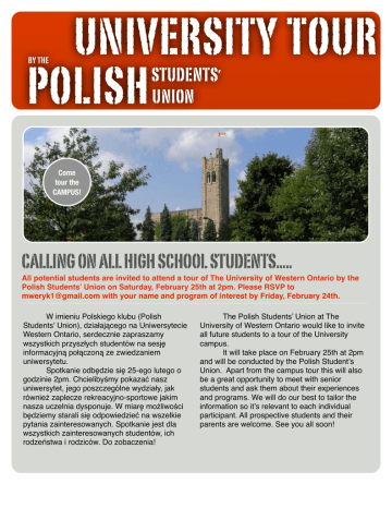 UNIVERSITY TOUR POLISH BY THE STUDENTS’ UNION Come tour the CAMPUS! CALLING ON ALL HIGH SCHOOL STUDENTS..... All potential students are invited to attend a tour of The University of Western Ontario by the Polish Students’ Union on Saturday, February 25th at 2pm. Please RSVP to [email protected] with your name and program of interest by Friday, February 24th. W imieniu Polskiego klubu (Polish Students’ Union), działającego na Uniwersytecie Western Ontario, serdecznie zapraszamy wszystkich przyszłych studentów na sesję informacyjną połączoną ze zwiedzaniem uniwersytetu. $ Spotkanie odbędzie się 25-ego lutego o godzinie 2pm. Chcielibyśmy pokazać nasz uniwersytet, jego poszczególne wydziały, jak również zaplecze rekreacyjno-sportowe jakim nasza uczelnia dysponuje. W miarę możliwości będziemy starali się odpowiedzieć na wszelkie pytania zainteresowanych. Spotkanie jest dla wszystkich zainteresowanych studentów, ich rodzeństwa i rodziców. Do zobaczenia! ! ! ! ! ! ! ! ! The Polish Students’ Union at The University of Western Ontario would like to invite all future students to a tour of the University campus. $ It will take place on February 25th at 2pm and will be conducted by the Polish Student’s Union. Apart from the campus tour this will also be a great opportunity to meet with senior students and ask them about their experiences and programs. We will do our best to tailor the information so it’s relevant to each individual participant. All prospective students and their parents are welcome. See you all soon! !