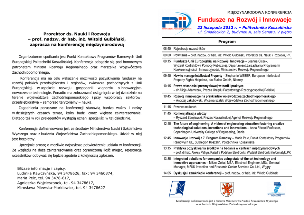 MIĘDZYNARODOWA KONFERENCJA Fundusze na Rozwój i Innowacje 22 listopada 2012 r. – Politechnika Koszalińska ul. Śniadeckich 2, budynek A, sala Senatu, V piętro Prorektor ds. Nauki i Rozwoju – prof. nadzw. dr hab. inż. Witold Gulbiński, zaprasza na konferencję międzynarodową Program 08:45 Rejestracja uczestników Organizatorem spotkania jest Punkt Kontaktowy Programów Ramowych Unii Europejskiej Politechniki Koszalińskiej. Konferencja odbędzie się pod honorowym patronatem Ministra Rozwoju Regionalnego oraz Marszałka Województwa Zachodniopomorskiego. Konferencja ma na celu wskazanie możliwości pozyskiwania funduszy na rozwój polskich przedsiębiorstw i regionów, zwłaszcza pochodzących z Unii Europejskiej, w aspekcie rozwoju gospodarki w oparciu o innowacyjne, nowoczesne technologie. Ponadto ma zobrazować osiągnięcia w tej dziedzinie na terenie województwa zachodniopomorskiego i przy współpracy sektorów: przedsiębiorstwa – samorząd terytorialny – nauka. Zagadnienia poruszane na konferencji stanowią bardzo ważny i nośny w dzisiejszych czasach temat, który budzi coraz większe zainteresowanie. Dlatego też w roli prelegentów wystąpią uznani specjaliści w tej dziedzinie. Konferencja dofinansowana jest ze środków Ministerstwa Nauki i Szkolnictwa Wyższego oraz z budżetu Województwa Zachodniopomorskiego. Udział w niej jest bezpłatny. Uprzejmie proszę o możliwie najszybsze potwierdzenie udziału w konferencji. Ze względu na duże zainteresowanie oraz ograniczoną ilość miejsc, rejestracja uczestników odbywać się będzie zgodnie z kolejnością zgłoszeń. Bliższe informacje i zapisy: Ludmiła Kawczyńska, 94 3478626, fax: 94 3460374, Maria Pelc, tel. 94 3478-617, Agnieszka Wojcieszonek, tel. 94 3478617, Mirosława Pilewska-Markiewicz, tel. 94 3478627 09:00 Powitanie – prof. nadzw. dr hab. inż. Witold Gulbiński, Prorektor ds. Nauki i Rozwoju, PK 09:15 Fundusze Unii Europejskiej na Rozwój i Innowacje – Joanna Ciszek, Wydział Kontraktów i Pomocy Publicznej, Departament Zarządzania Programami Konkurencyjności i Innowacyjności, Ministerstwo Rozwoju Regionalnego 09:45 How to manage Intellectual Property – Stephanie WEBER, European Intellectual Property Rights Helpdesk, c/o Eurice GmbH, Niemcy 10:15 Prawo własności przemysłowej w teorii i praktyce – dr Alicja Adamczak, Prezes Urzędu Patentowego Rzeczypospolitej Polskiej 10:45 Rozwój i Innowacje na przykładzie województwa zachodniopomorskiego – Andrzej Jakubowski, Wicemarszałek Województwa Zachodniopomorskiego 11:15 Przerwa na lunch 11:45 Komercjalizacja wiedzy – Ryszard Zdrojewski, Prezes Koszalińskiej Agencji Rozwoju Regionalnego 12:15 The future of engineering: A vision of engineering education fostering creative technological solutions, inventions and innovations – Anna Friesel Professor, Copenhagen University College of Engineering, Dania 12:45 Innowacje i rozwój a 7. Program Ramowy – Maria Pelc, Punkt Kontaktowy Programów Ramowych UE, Subregion Koszalin, Politechnika Koszalińska 13:15 Praktyka pozyskiwania środków na badania w centrach międzynarodowych – prof. dr hab. Aleksy Patryn, Katedra Podstaw Elektroniki, Wydział Elektroniki i Informatyki,PK 13:35 Integrated solutions for companies using state-of-the-art technology and innovative approaches – Miklos Zoltai, MBA, Electrical Engineer, MSc, General Manager, MFKK Invention and Research Center Services Co. Ltd., Węgry 14:05 Dyskusja i zamknięcie konferencji – prof. nadzw. dr hab. inż. Witold Gulbiński Konferencja dofinansowana jest z budżetu Ministerstwa Nauki i Szkolnictwa Wyższego oraz budżetu Województwa Zachodniopomorskiego.