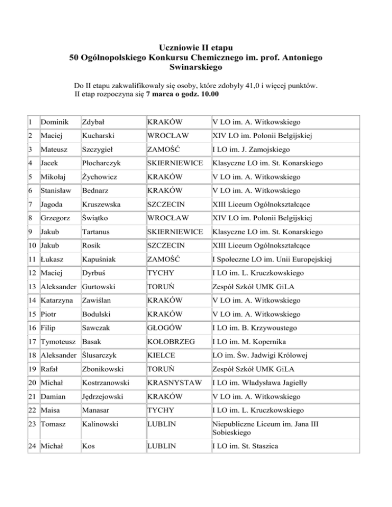 Uczniowie II etapu 50 Ogólnopolskiego Konkursu Chemicznego im. prof. Antoniego Swinarskiego Do II etapu zakwalifikowały się osoby, które zdobyły 41,0 i więcej punktów. II etap rozpoczyna się 7 marca o godz. 10.00 1 Dominik Zdybał KRAKÓW V LO im. A. Witkowskiego 2 Maciej Kucharski WROCŁAW XIV LO im. Polonii Belgijskiej 3 Mateusz Szczygieł ZAMOŚĆ I LO im. J. Zamojskiego 4 Jacek Płocharczyk SKIERNIEWICE Klasyczne LO im. St. Konarskiego 5 Mikołaj Żychowicz KRAKÓW V LO im. A. Witkowskiego 6 Stanisław Bednarz KRAKÓW V LO im. A. Witkowskiego 7 Jagoda Kruszewska SZCZECIN XIII Liceum Ogólnokształcące 8 Grzegorz Świątko WROCŁAW XIV LO im. Polonii Belgijskiej 9 Jakub Tartanus SKIERNIEWICE Klasyczne LO im. St. Konarskiego 10 Jakub Rosik SZCZECIN XIII Liceum Ogólnokształcące 11 Łukasz Kapuśniak ZAMOŚĆ I Społeczne LO im. Unii Europejskiej 12 Maciej Dyrbuś TYCHY I LO im. L. Kruczkowskiego TORUŃ Zespół Szkół UMK GiLA 13 Aleksander Gurtowski 14 Katarzyna Zawiślan KRAKÓW V LO im. A. Witkowskiego 15 Piotr Bodulski KRAKÓW V LO im. A. Witkowskiego 16 Filip Sawczak GŁOGÓW I LO im. B. Krzywoustego 17 Tymoteusz Basak KOŁOBRZEG I LO im. M. Kopernika 18 Aleksander Ślusarczyk KIELCE LO im. Św. Jadwigi Królowej 19 Rafał Zbonikowski TORUŃ Zespół Szkół UMK GiLA 20 Michał Kostrzanowski KRASNYSTAW I LO im. Władysława Jagiełły 21 Damian Jędrzejowski KRAKÓW V LO im. A. Witkowskiego 22 Maisa Manasar TYCHY I LO im. L. Kruczkowskiego 23 Tomasz Kalinowski LUBLIN Niepubliczne Liceum im. Jana III Sobieskiego 24 Michał Kos LUBLIN I LO im. St. Staszica 25 Michał Gala GLIWICE I LO im. E. Dembowskiego 26 Wojciech Lasoń WROCŁAW XIV LO im. Polonii Belgijskiej 27 Michał Jarosiński LUBLIN I LO im. St. Staszica 28 Wojciech Gług KRAKÓW V LO im. A. Witkowskiego 29 Tomasz Cichoń JAWORZNO I LO im. T. Kościuszki 30 Fabian Kosko KOSZALIN I LO im. St. Dubois 31 Kamil Kos STASZÓW LO im. Ks. Kard. Stefana Wyszyńskiego 32 Karolina Fita INOWROCŁAW I LO im. J. Kasprowicza 33 Marcin Kucharski SKIERNIEWICE Klasyczne LO im. St. Konarskiego 34 Agnieszka Grot JANÓW LUB. LO im. Bohaterów Porytowego Wzgórza 35 Paweł Bartnowski TUREK ZSzO im. T. Kościuszki 36 Rafał Stempowski INOWROCŁAW I LO im. J. Kasprowicza 37 Jarosław Krawczyk SKIERNIEWICE Klasyczne LO im. St. Konarskiego 38 Małgorzata Kasprzak LUBLIN I LO im. St. Staszica 39 Małgorzata Bołt GDYNIA III LO im. Marynarki Wojennej RP 40 Miłosz Adach KIELCE II LO im. J. Śniadeckiego 41 Michał Brzeziński GDAŃSK V LO im. St. Żeromskiego 42 Tomasz Białek KIELCE II LO im. J. Śniadeckiego 43 Michał Kopyt PRZEMYŚL II LO im. K. Morawskiego 44 Michał Kaczmarczyk POŁANIEC ZSz im. Oddziału Partyzanckiego AK "Jędrusie" 45 Mateusz Raczyński SZCZECIN Katolickie LO im. Św. Maksymiliana Marii Kolbego 46 Arkadiusz Szul KROSNO MZS nr 4, II LO im. Konstytucji 3 Maja 47 Marcin Woś KIELCE LO im. Św. Jadwigi Królowej 48 Joanna Michalik WROCŁAW XIV LO im. Polonii Belgijskiej 49 Justyna Oleszkiewicz BYTÓW I LO im. Bojowników o Polskość i Wolność Ziemi Bytowskiej 50 Paweł Kochanowski STASZÓW LO im. Ks. Kard. Stefana Wyszyńskiego 51 Klaudia Laks TORUŃ Zespół Szkół UMK GiLA 52 Wojciech Szkółka PRZEMYŚL II LO im. K. Morawskiego 53 Przemysław Gajda KRAKÓW V LO im. A. Witkowskiego 54 Aldona Babiarz RZESZÓW LO Sióstr Prezentek im. Jana Pawła II 55 Adrian Michalczuk ZAMOŚĆ I LO im. J. Zamojskiego 56 Izabela Lewinska GDAŃSK II LO im. dr Władysława Pniewskiego 57 Daniel Gut RZESZÓW IV LO im. M. Kopernika 58 Szymon Budnick CZŁUCHÓW ZSzSpoł. Tow. Ośw. im. J. NowakaJeziorańskiego 59 Natalia Siwecka ŁÓDŹ LO im. M. Kopernika 60 Bartosz Szostak SZCZECIN XIII Liceum Ogólnokształcące 61 Anna Wrona TARNOBRZEG I Społ. LO im. Hetmana J. Tarnowskiego 62 Paweł Wójcik KRAKÓW V LO im. A. Witkowskiego 63 Iwona Szymkiewicz OPATÓW LO im. Bartosza Głowackiego 64 Daniel Ryczkowski GRUDZIĄDZ II LO im. Króla Jana III Sobieskiego 65 Ada Frankowska KRAKÓW V LO im. A. Witkowskiego 66 Justyna Makarow ŁÓDŹ XXXIII LO im. Armii Krajowej 67 Kamil Marudziński TORUŃ Zespół Szkół UMK GiLA 68 Dawid Czeluśniak RZESZÓW IV LO im. M. Kopernika KIELCE IV LO im. H. Sawickiej SZCZECIN XIII Liceum Ogólnokształcące 71 Aleksandra Blida GŁOGÓW I LO im. B. Krzywoustego 72 Maria Karczewska ŁOWICZ Pijarskie LO Królowej Pokoju 73 Wojciech Stawski WROCŁAW XIV LO im. Polonii Belgijskiej 74 Joanna Nowaczyk WROCŁAW XIV LO im. Polonii Belgijskiej 75 Krzysztof Bartkowiak BYDGOSZCZ VI LO im. J.J. Śniadeckich 76 Patryk Pyrcz JAROSŁAW I LO im. M. Kopernika 77 Patryk Rybczyński TORUŃ Zespół Szkół UMK GiLA 78 Dominik Górczyński PŁOŃSK I LO im. H. Sienkiewicza 79 Bartosz Gąsiorkiewicz WROCŁAW XIV LO im. Polonii Belgijskiej 80 Dominik Pędzich SŁUPSK II LO im. A. Mickiewicza 81 Piotr Wolak KIELCE II LO im. J. Śniadeckiego 82 Karina Zając TUREK ZSzO im. T. Kościuszki 69 Magdalena Pawłowska 70 Klaudia Lipińska 83 Karolina Śmieszek STĄPORKÓW ZSz Ponadgimnazjalnych im. S. Staszica 84 Monika Węsierska BYTÓW I LO im. Bojowników o Polskość i Wolność Ziemi Bytowskiej 85 Maciej Redlich-Michalski KIELCE LO im. Św. Jadwigi Królowej 86 Julia Giełdon TORUŃ Zespół Szkół UMK GiLA 87 Marcin Cymerys OSTROWIEC ŚW. LO nr III im. W. Broniewskiego 88 Jacek Wątorek BYDGOSZCZ I LO Tow. Salezj. im. Św. Jana Bosko