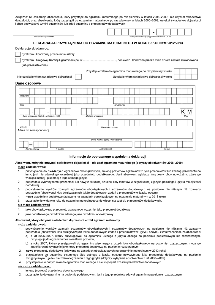 Załącznik 1c Deklaracja absolwenta, który przystąpił do egzaminu maturalnego po raz pierwszy w latach 2008–2009 i nie uzyskał świadectwa dojrzałości, oraz absolwenta, który przystąpił do egzaminu maturalnego po raz pierwszy w latach 2005–2009, uzyskał świadectwo dojrzałości i chce podwyższyć wyniki egzaminów lub zdać egzaminy z przedmiotów dodatkowych Pieczęć szkoły lub OKE identyfikator szkoły (wypełnia szkoła lub OKE) DEKLARACJA PRZYSTĄPIENIA DO EGZAMINU MATURALNEGO W ROKU SZKOLNYM 2012/2013 Deklarację składam do: dyrektora ukończonej przeze mnie szkoły dyrektora Okręgowej Komisji Egzaminacyjnej w ........................................., ponieważ ukończona przeze mnie szkoła została zlikwidowana (lub przekształcona) Przystąpiłem/łam do egzaminu maturalnego po raz pierwszy w roku Nie uzyskałem/łam świadectwa dojrzałości Uzyskałem/łam świadectwo dojrzałości w roku Dane osobowe Nazwisko Imię Drugie imię - - K M Data urodzenia (dzień – miesiąc – rok) PESEL Miejsce urodzenia Płeć Nazwisko rodowe Adres do korespondencji Ulica, numer domu / mieszkania – Kod pocztowy (Poczta) Miejscowość Telefon Informacje do poprawnego wypełnienia deklaracji Absolwent, który nie otrzymał świadectwa dojrzałości – nie zdał egzaminu maturalnego (dotyczy absolwentów 2008–2009) może zadeklarować: 1. przystąpienie do niezdanych egzaminów obowiązkowych, zmianę poziomów egzaminów z tych przedmiotów lub zmianę przedmiotu na inny, jeśli nie zdawał go wcześniej jako przedmiotu dodatkowego. Jeśli absolwent wybierze inny język obcy nowożytny, zdaje go w części ustnej i pisemnej z tego samego języka 2. poprzednio wybrany temat prezentacji lub nowy z aktualnej szkolnej listy tematów w części ustnej z języka polskiego i języka mniejszości narodowej 3. podwyższenie wyników zdanych egzaminów obowiązkowych i egzaminów dodatkowych na poziomie nie niższym niż zdawany poprzednio (absolwenci klas dwujęzycznych także dodatkowych zadań z przedmiotów w języku obcym) 4. nowe przedmioty dodatkowe (zdawane na zasadach obowiązujących na egzaminie maturalnym w 2013 roku) 5. przystąpienie w danym roku do egzaminu maturalnego z nie więcej niż sześciu przedmiotów dodatkowych. nie może zadeklarować 1. jako obowiązkowego przedmiotu zdawanego wcześniej jako przedmiot dodatkowy 2. jako dodatkowego przedmiotu zdanego jako przedmiot obowiązkowy. Absolwent, który otrzymał świadectwo dojrzałości – zdał egzamin maturalny może zadeklarować: 1. podwyższenie wyników zdanych egzaminów obowiązkowych i egzaminów dodatkowych na poziomie nie niższym niż zdawany poprzednio (absolwenci klas dwujęzycznych także dodatkowych zadań z przedmiotów w języku obcym), z zastrzeżeniem, że absolwenci a) z lat 2005–2007, którzy przystępowali do egzaminu ustnego z języka obcego na poziomie podstawowym lub rozszerzonym, przystępują do egzaminu bez określania poziomu, b) z roku 2007, którzy przystępowali do egzaminu pisemnego z przedmiotu obowiązkowego na poziomie rozszerzonym, mogą go zadeklarować wyłącznie jako nowy przedmiot dodatkowy na poziomie rozszerzonym, 2. nowe przedmioty dodatkowe (zdawane na zasadach obowiązujących na egzaminie maturalnym w 2013 roku) 3. przystąpienie do egzaminu pisemnego i/lub ustnego z języka obcego nowożytnego jako przedmiotu dodatkowego na poziomie *** dwujęzycznym , jeżeli nie zdawał egzaminu z tego języka (dotyczy wyłącznie absolwentów z lat 2008–2009) 4. przystąpienie w danym roku do egzaminu maturalnego z nie więcej niż sześciu przedmiotów dodatkowych. nie może zadeklarować: 1. innego (nowego) przedmiotu obowiązkowego, 2. przystąpienia do egzaminu na poziomie podstawowym, jeśli z tego przedmiotu zdawał egzamin na poziomie rozszerzonym. Załącznik 1c (strona 2) 1. Deklaruję przystąpienie do egzaminów obowiązkowych z następujących przedmiotów: wpisać jedną z możliwości: przedmiot część poziom: (U – ustna; P – pisemna) podstawowy / rozszerzony / bez określania poziomu**** / dwujęzyczny** (a) poprzednio nie zdałem/łam egzaminu z tego przedmiotu (b) zmieniam wybór, poprzednio nie zdałem/łam egzaminu z przedmiotu (jakiego) .................................. (c) chcę podwyższyć wynik egzaminu, poprzednio zdawałem/łam go na poziomie............................................. 1. 2. 3. 4. Temat prezentacji z języka polskiego: ...............................................................................................................................................................……… .................................................................................................................................................................................................................................... Temat prezentacji z języka mniejszości narodowej: ..........................................................................................................................................……… .................................................................................................................................................................................................................................... 2. Deklaruję przystąpienie do egzaminów dodatkowych z następujących przedmiotów (część ustna dotyczy języków obcych nowożytnych, języka mniejszości narodowej, etnicznej i języka regionalnego): przedmiot wpisać jedną z możliwości: część poziom (U – ustna; P – pisemna) podstawowy/ rozszerzony/ bez określania poziomu***** / dwujęzyczny* (a) (b) podwyższam wynik deklaruję nowy przedmiot 2.1. 2.2. 2.3. 2.4. 2.5 2.6 Temat prezentacji z języka mniejszości narodowej / mniejszości etnicznej / języka regionalnego: ......................................................................... ..................................................................................