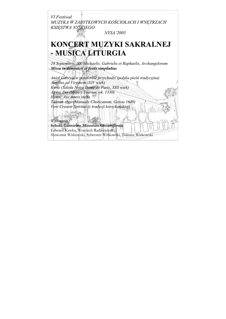 VI Festiwal MUZYKA W ZABYTKOWYCH KOŚCIOŁACH I WNĘTRZACH KSIĘSTWA NYSKIEGO NYSA’2005 KONCERT MUZYKI SAKRALNEJ - MUSICA LITURGIA 29 Septembris: SS. Michaelis, Gabrielis et Raphaelis, Archangelorum Missa in dominicis et festis simpliabus Anioł Gabryel w poselstwie przychodzi (polska pieśń tradycyjna) Angelus ad Virginem (XIV wiek) Kyrie (Szkoła Notre Dame de Paris, XIII wiek) Agnus Dei (Msza z Tournai, ok. 1330) Hymn: Ave maris stella Tantum ergo (Manuale Choricanum, Genoa 1649) Veni Creator Spiritus (z tradycji korsykańskiej) Wykonawcy Schola Cantorum Minorum Chosoviensis Edward Kawka, Wojciech Radziejewski, Sławomir Witkowski, Sylwester Witkowski, Tomasz Witkowski