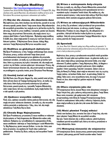 (6) M-twa o wstrzymanie Anty-chrysta Och Jezu, ja modlę się, aby Bóg w Swoim Miłosierdziu uniemożliwił Tłumaczenie z: http://www.thewarningsecondcoming.com/ Z posłania Pana Jezusa dla Marii Bożego Miłosierdzia w dn. 17 listopada 2011: „Moja Anty-chrystowi i jego niegodziwej armii spowodowanie terroru i wywołanie nędzy i cierpienia Twoich dzieci. My modlimy się, aby ukochana córko, poproś Moje dzieci, aby odmawiały te modlitwy od teraz aż do został on powstrzymany, i żeby można było uniknąć Ręki Kary dzięki Ostrzeżenia. Moi uczniowie są proszeni o odmawianie tych modlitw…” nawróceniu, które zostanie osiągnięte podczas Ostrzeżenia. (1) Mój dar dla Jezusa, dla zbawienia dusz Mój najdroższy Jezu, który kochasz nas tak bardzo, pozwól mi na mój (7) M-twa za odrzucających Miłosierdzie skromny sposób, pomóc zbawić Twoje cenne dusze. Miej miłosierdzie Jezu, ja chcę Cię przekonać, żebyś przebaczył tym grzesznikom, dla wszystkich grzeszników, bez względu na to, jak bardzo ciężko Cię których dusza jest tak ciemna, że odrzucą światło Twojego obrażają. Pozwól mi, przez modlitwę i cierpienie, pomóc tym duszom, Miłosierdzia. Przebacz im Jezu, błagam Cię, dla odkupienia ich z grzechów, z których tak bardzo trudno będzie im się samym które mogą nie przetrwać Ostrzeżenia, aby mogły starać się o miejsce obok Ciebie w Twoim Królestwie. Wysłuchaj mojej modlitwy, wydobyć. Zalej ich serca promieniami Twojego Miłosierdzia i daj im O słodki Jezu, abym mógł pomóc Ci zwyciężyć nad tymi duszami, za szansę powrotu do Twojej owczarni! którymi tęsknisz. O Najświętsze Serce Jezusa, ślubuję Moją (8) Spowiedź wierność Twojej Najświętszej Woli przez wszystkie czasy! Krucjata Modlitwy (2) Modlitwa za globalnych dyktatorów Mój Ojcze Przedwieczny, w Imię Twojego umiłowanego Syna Jezusa Chrystusa, proszę, ażebyś ochraniał Twoje dzieci przed prześladowaniami ukartowanymi przez globalne siły przeciwko niewinnym narodom. Ja modlę się o przebaczenie grzechów tych dusz, które są przyczyną tej nędzy i cierpienia, tak, aby mogły one zwrócić się do Ciebie z sercem pokornym i skruszonym. Proszę, daj Swoim torturowanym dzieciom siłę, aby przetrzymały te cierpienia, na przebłaganie za grzechy świata, przez Chrystusa Pana Naszego. (3) Uwolnij świat od lęku Och Mój Panie Jezu Chryste, błagam Cię, abyś uwolnił świat od lęku, który odrywa dusze od Twojego kochającego Serca. Ja modlę się, żeby dusze, które będą przeżywały autentyczny lęk podczas Ostrzeżenia, powstrzymały się, i pozwoliły Twojemu Miłosierdziu zalać swoje dusze, tak więc oswobodzone, będą mogły kochać Cię w taki sposób, w jak powinny. „Ja, Jezus, Wasz Król i Zbawiciel, podaję teraz Moją modlitwę do spowiedzi. Ta modlitwa powinna być odmówiona podczas Ostrzeżenia oraz po Ostrzeżeniu, aby prosić o łaski przebaczenia grzechów.” Najdroższy Jezu, proszę o przebaczenie wszystkich moich grzechów oraz bólu i krzywd, jakie wyrządziłem innym. Ja pokornie modlę się o łaski, abym mógł uniknąć ponownego obrażenia Ciebie, oraz mógł ofiarować Ci pokuty zgodnie z Twoją Najświętszą Wolą. Ja błagam o przebaczenie wszelkich przyszłych wykroczeń, które mógłbym popełnić i które spowodują Twój ból i cierpienie. Zabierz mnie ze Sobą do Nowej Ery Pokoju, abym mógł na wieczność stać się częścią Twojej rodziny. Ja kocham Ciebie Jezu! Ja potrzebuję Ciebie! Ja oddaję Tobie cześć, oraz wszystkiemu temu, do czego Ty dążysz! Pomóż mi Jezu, abym mógł być godzien wejścia do Twojego Królestwa! (9) Ofiara cierpienia jako dar O Przenajświętsze Serce Jezusa! Naucz mnie akceptować zniewagi w Twoje Święte Imię, gdy z pokorną wdzięcznością głoszę Twoje Słowo. Naucz mnie zrozumieć, jak upokorzenie, ból i cierpienie (4) Zjednocz wszystkie rodziny przyprowadzają mnie bliżej do Twojego Przenajświętszego Serca. Panie Jezu, zjednocz wszystkie rodziny podczas Ostrzeżenia, tak, aby Pozwól mi zaakceptować takie próby z miłością i hojnością ducha, mogły otrzymać odwieczne zbawienie. Ja modlę się, aby wszystkie abym mógł przedłożyć je jako dary tak cenne dla Ciebie w celu rodziny pozostały w zjednoczeniu z Tobą, Jezu, tak, aby mogły zbawienia. odziedziczyć Twój Nowy Raj na Ziemi. (10) Nieść płomień Twojej miłości (5) Chwała Bogu Najwyższemu Pomóż nam kochany Jezu, wzrastać bez lęku w Twoje Imię, aby móc Och Ojcze Przedwieczny, przynosimy Ci nasze modlitwy w radosnym nieść płomień Twojej Miłości do wszystkich narodów. dziękczynieniu za Twój drogocenny dar Miłosierdzia wobec całej Daj nam, Twoim dzieciom siłę w obliczu nadużyć, jakich będziemy ludzkości. Radujemy się i przedkładamy Ci, najwspanialszy Królu, świadkami pośród wszystkich tych, którzy nie wierzą prawdziwie w nasze uwielbienie i adoracje za Twoje kochające i czułe Miłosierdzie. Twoje miłosierdzie. Amen. Ty, Bóg Najwyższy, jesteś naszym Królem, i za ten dar, który nam (11) Wstrzymaj nienawiść do wizjonerów teraz przynosisz, my upadamy do Twych stóp w pokornym poddaństwie. Prosimy Cię Boże, zmiłuj się nad wszystkimi Twoimi O Przenajświętsze Serce Jezusa proszę powstrzymaj nienawiść i dziećmi! zazdrość, jakie panują pośród Twoich uczniów wobec Twoich prawdziwych wizjonerów w tych czasach. Ja modlę się, abyś usłyszał Cię Jezu i obiecuję od dnia dzisiejszego, że będę głosił Twoje Święte moją modlitwę i dał wizjonerom siłę, jakiej potrzebują, aby głosić Słowo bez strachu w moim sercu i w czystości duszy na wieki wieków. Twoje Najświętsze Słowo do niewierzącego świata. Amen . (17) Modlitwa do Matki Ocalenia (12) Modlitwa o uniknięcie grzechu pychy Och Niepokalane Serce Maryi Matki Ocalenia i Pośredniczki Och Mój Jezu pomóż mi uniknąć grzechu pychy, gdy mówię w Twoim Wszystkich Łask! Ty, kt