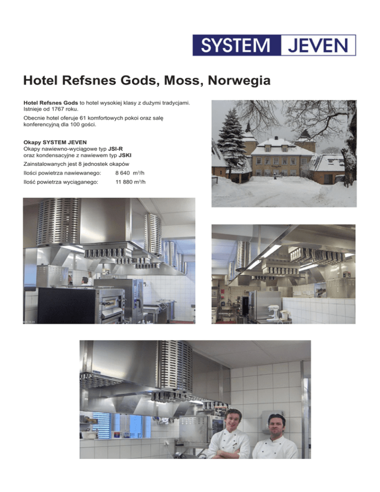 Hotel Refsnes Gods, Moss, Norwegia Hotel Refsnes Gods to hotel wysokiej klasy z dużymi tradycjami. Istnieje od 1767 roku. Obecnie hotel oferuje 61 komfortowych pokoi oraz salę konferencyjną dla 100 gości. Okapy SYSTEM JEVEN Okapy nawiewno-wyciągowe typ JSI-R oraz kondensacyjne z nawiewem typ JSKI Zainstalowanych jest 8 jednostek okapów Ilości powietrza nawiewanego: 8 640 m3/h Ilość powietrza wyciąganego: 11 880 m3/h