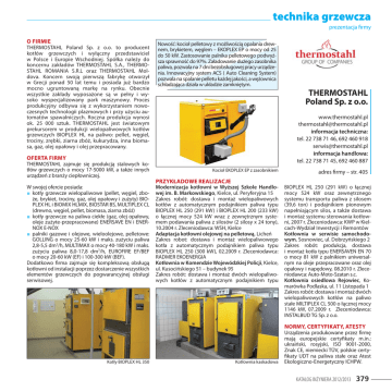 technika grzewcza prezentacja firmy O FIRMIE THERMOSTAHL Poland Sp. z o.o. to producent kotłów grzewczych i wyłączny przedstawiciel w Polsce i Europie Wschodniej. Spółka należy do koncernu zakładów THERMOSTAHL S.A., THERMOSTAHL ROMANIA S.R.L oraz THERMOSTAHL Moldova. Koncern swoją pierwszą fabrykę otworzył w Grecji ponad 50 lat temu i posiada już bardzo mocno ugruntowaną markę na rynku. Obecnie wszystkie zakłady wyposażone są w pełny i wysoko wyspecjalizowany park maszynowy. Proces produkcyjny odbywa się z wykorzystaniem nowoczesnych technologii plazmowych i przy użyciu automatów spawalniczych. Roczna produkcja wynosi ok. 25 000 sztuk. THERMOSTAHL jest światowym prekursorem w produkcji wielopaliwowych kotłów grzewczych BIOPLEX HL na paliwo: pellet, węgiel, trociny, zrębki, ziarna zbóż, kukurydza, inna biomasa, gaz, olej opałowy i olej przepracowany. Nowość: kocioł pelletowy z możliwością opalania drewnem, brykietem, węglem – EKOPLEX EP o mocy od 25 do 50 kW. Zastosowanie palnika pelletowego podwyższa sprawność do 97%. Załadowanie dużego zasobnika paliwa, pozwala na 7 dni bezobsługowej pracy urządzenia. Innowacyjny system ACS ( Auto Cleaning System) pozwala na spalanie pelletu każdej jakości, a wężownica schładzająca działa w układzie zamkniętym. THERMOSTAHL Poland Sp. z o.o. www.thermostahl.pl [email protected] informacja techniczna: tel. 22 738 71 46, 692 460 918 [email protected] informacja handlowa: tel. 22 738 71 45, 692 460 887 OFERTA FIRMY THERMOSTAHL zajmuje się produkcją stalowych kotłów grzewczych o mocy 17-5000 kW, a także innych urządzeń z branży ciepłowniczej. Kocioł EKOPLEX EP z zasobnikiem W swojej ofercie posiada: ■ kotły grzewcze wielopaliwowe (pellet, węgiel, zboże, brykiet, trociny, gaz, olej opałowy i zużyty) BIOPLEX HL i BIOMIX HLMIX, BIOSTAR BS, MULTIPLEX CL (drewno, węgiel, pellet, biomasa, ziarna zbóż) ■ kotły grzewcze na paliwa ciekłe (gaz, olej opałowy, oleje zużyte-przepracowane) ENERSAVE EN i ENERNOX E-NOX ■ palniki gazowe i olejowe, wieloolejowe, pelletowe: GOLLING o mocy 25-60 kW i maks. zużyciu paliwa 2,8-5,5 dm3/h, MULTIMAX o mocy 40-180 kW i maks. zużyciu paliwa 8,0-17,8 dm3/h, EUROFIRE EF/BEF o mocy 20-60 kW (EF) i 100-300 kW (BEF). Dodatkowo firma zajmuje się kompleksową obsługą kotłowni od instalacji poprzez dostarczenie wszystkich elementów grzewczych do pogwarancyjnej obsługi serwisowej. Modernizacja kotłowni w Wyższej Szkole Handlowej im. B. Markowskiego, Kielce, ul. Peryferyjna 15 Zakres robót: dostawa i montaż wielopaliwowych kotłów z automatycznym podajnikiem paliwa typu BIOPLEX HL 250 (291 kW) i BIOPLEX HL 200 (233 kW) o łącznej mocy 524 kW wraz z zewnętrznym systemem podawania paliwa z silosów (2 silosy x 24 tony), 10.2004 r. Zleceniodawca: WSH, Kielce Adaptacja kotłowni olejowej na pelletową, Licheń Zakres robot: dostawa i montaż wielopaliwowego kotła z automatycznym podajnikiem paliwa typu BIOPLEX HL 250 (300 kW), 02.2009 r. Zleceniodawca: RADMER EKOENERGIA Kotłownia w Komendzie Wojewódzkiej Policji, Kielce, ul. Kusocińskiego 51 – budynek 95 Zakres robót: dostawa i montaż dwóch wielopaliwowych kotłów z automatycznym podajnikiem typu adres firmy – str. 405 PRZYKŁADOWE REALIZACJE BIOPLEX HL 250 (291 kW) o łącznej mocy 524 kW oraz zewnętrznego systemu transportu paliwa z silosem (39,6 ton) i podajnikiem pionowym napełniającym silos, a także dostawa i montaż systemu sterowania kotłowni, 2007 r. Zleceniodawca: KWP w Kielcach-Wydział Inwestycji i Remontów Kotłownia w serwisie samochodowym, Sosnowiec, ul. Dobrzyńskiego 2 Zakres robót: produkcja, dostawa i montaż kotła typu ENERSAVEN EN 70 o mocy 81 kW z palnikiem uniwersalnym na oleje przepracowane oraz olej opałowy i napędowy, 08.2010 r. Zleceniodawca: Auto-Moto-Szatan s.c. Kotłownia osiedlowa Rejowiec, Komarówka Podlaska, ul. 11 Listopada 1 Zakres robót: dostawa i montaż dwóch wielopaliwowych kotłów na paliwo stałe MILTIPLEX CL 500 o łącznej mocy 1146 kW, 07.2009 r. Zleceniodawca: INSTALBUD TG Sp. z o.o. NORMY, CERTYFIKATY, ATESTY Kotły BIOPLEX HL 350 Kotłownia kaskadowa Urządzenia produkowane przez firmę mają europejskie certyfikaty m.in.: ukraiński, rosyjski, ISO 9001-2000, Znak CE, niemiecki TÜV, polskie certyfikaty UDT na paliwa stałe oraz Atest Ekologiczno-Energetyczny ICHPW. KATALOG INŻYNIERA 2012/2013 379
