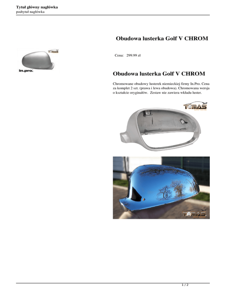 Tytuł główny nagłówka podtytuł nagłówka Obudowa lusterka Golf V CHROM Cena: 299.99 zł Obudowa lusterka Golf V CHROM Chromowane obudowy lusterek niemieckiej firmy In.Pro. Cena za komplet 2 szt. (prawa i lewa obudowa). Chromowana wersja o kształcie oryginałów. Zestaw nie zawiera wkładu luster. 1/2 Tytuł główny nagłówka podtytuł nagłówka 2/2 Powered by TCPDF (www.tcpdf.org)