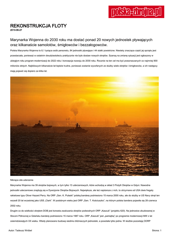REKONSTRUKCJA FLOTY 2013-06-27 Marynarka Wojenna do 2030 roku ma dostać ponad 20 nowych jednostek pływających oraz kilkanaście samolotów, śmigłowców i bezzałogowców. Polska Marynarka Wojenna to 8,1 tysiąca osób personelu, 84 jednostki pływające i 44 statki powietrzne. Niestety znacząca część jej sprzętu jest przestarzała, ponieważ w ostatnim dwudziestoleciu praktycznie nie było dostaw nowych okrętów. Szansą na zmianę sytuacji jest ogłoszony w ubiegłym roku program modernizacji do 2022 roku i koncepcja rozwoju do 2030 roku. Rocznie na ten cel ma być przeznaczanych co najmniej 900 milionów złotych. Najbliższych kilkanaście lat będzie trudne, ponieważ zostanie wycofanych ze służby wiele okrętów i śmigłowców, a ich następcy mają pojawić się dopiero za kilka lat. Niknąca siła uderzenia Marynarka Wojenna ma 39 okrętów bojowych, w tym tylko 13 uderzeniowych, które wchodzą w skład 3 Flotylli Okrętów w Gdyni. Nawodne jednostki uderzeniowe znajdują się w Dywizjonie Okrętów Bojowych. Największe, ale też najstarsze z nich, to otrzymane od USA dwie fregaty rakietowe typu Oliver Hazard Perry. Na ORP „Gen. K. Pułaski” polską banderę podniesiono 15 marca 2000 roku, ale do służby w US Navy okręt ten wszedł 20 lat wcześniej jako USS „Clark”. W podobnym wieku jest ORP „Gen. T. Kościuszko”, na którym polska bandera pojawiła się 28 czerwca 2002 roku. Drugim co do wielkości okrętem DOB jest korweta zwalczania okrętów podwodnych ORP „Kaszub” (projektu 620). Na jednostce zbudowanej w Stoczni Północnej w Gdańsku banderę podniesiono 15 marca 1987 roku. ORP „Kaszub” jest „pamiątką” po programie modernizacji MW z lat osiemdziesiątych XX wieku. Wtedy planowano budowę siedmiu bliźniaczych jednostek, a powstała tylko jedna. W służbie pozostają OORP Autor: Tadeusz Wróbel Strona: 1 „Metalowiec” i „Rolnik”, dwa z czterech okrętów rakietowych typu Tarantul I (projektu 1241 RE), które Związek Radziecki sprzedał Polsce w latach osiemdziesiątych. Najmłodsze są trzy okręty rakietowe projektu 660. OORP „Orkan”, „Piorun” i „Grom” weszły do służby w latach 1992–1995. W Stoczni Północnej do ich budowy użyto, odkupionych od stoczni VEB Peene-Werft w Wolgast po zjednoczeniu Niemiec, niewykorzystanych kadłubów typu Sassnitz (zaprojektowane dla floty wojennej Niemieckiej Republiki Demokratycznej). Niestety musiało minąć ponad dziesięć lat, by okręty te zostały uzbrojone w pociski przeciwokrętowe – szwedzkie RBS-15. Pozostałe jednostki uderzeniowe znajdują się w Dywizjonie Okrętów Podwodnych. Największą z nich jest zbudowany w ZSRR ORP „Orzeł” typu Kilo (projekt 877E). Polską banderę podniesiono na nim 29 kwietnia 1986 roku. Planowano zakup trzech takich okrętów, ale pogrążonej w kryzysie gospodarczym Polski lat osiemdziesiątych nie było stać na taką transakcję. W zamian wydzierżawiono (później odkupiono) od Związku Radzieckiego w latach 1987 i 1988 dwa używane okręty typu Foxtrot (projektu 641), które w radzieckiej flocie służyły od połowy szóstej dekady XX wieku. Na OORP „Dzik” i „Wilk” bandery opuszczono w 2003 roku. Poradzieckie jednostki zostały zastąpione przez podarowane przez Norwegów okręty typu Kobben (typ 207). Z pięciu otrzymanych do służby w latach 2002–2004 weszły cztery – OORP „Sokół”, „Sęp”, „Bielik” i „Kondor”. Jest to jednak rozwiązanie tymczasowe, ponieważ te jednostki liczą prawie tyle samo lat co wycofane Foxtroty. W najbliższych latach sytuacja marynarki będzie bardzo trudna. Według „Koncepcji rozwoju Marynarki Wojennej do 2030 roku” do 2022 roku zniknie z niej większość jednostek uderzeniowych. Już w przyszłym roku zostanie opuszczona bandera na Tarantulach i jednym z Kobbenów (na pozostałych do 2017 roku), a w 2015 roku na fregacie „Gen. T. Kościuszko”. Dwa lata później flotę opuści też „Kaszub”. Tym samym liczba okrętów uderzeniowych zredukowana zostanie o prawie dwie trzecie. Dzięki ograniczonej modernizacji fregata ORP „Gen. K. Pułaski” będzie mogła służyć do 2025 roku. Po tego typu zabiegach ORP „Orzeł” będzie użytkowany do połowy lat dwudziestych XXI wieku, a małe okręty rakietowe typu Orkan do 2030 roku. Priorytetowe okręty „Podstawowym dokumentem planistycznym opracowanym w Dowództwie Marynarki Wojennej jest «Program operacyjny – zwalczanie zagrożeń na morzu w latach 2013–2022/2030», w którym we wrześniu 2012 roku określono sposób osiągania przez MW oczekiwanych zdolności operacyjnych poprzez wprowadzanie do niej nowoczesnego sprzętu”, twierdzi komandor Krzysztof Marciniak, szef Zarządu Planowania Obronnego i Rozwoju MW – N5. W owym programie znalazły się wszystkie projekty modernizacyjne, które pojawiły się w „Koncepcji rozwoju Marynarki Wojennej do 2030 roku”. Dokument opracowany w Sztabie Generalnym Wojska Polskiego we współpracy ze specjalistami z Dowództwa MW minister obrony Tomasz Siemoniak zaakceptował w marcu 2012 roku. Na podstawie obu dokumentów Sztab Generalny przygotował „Program modernizacji SZRP w latach 2013–2022” zawierający charakterystykę projektów programu operacyjnego. Autor: Tadeusz Wróbel Strona: 2 Pierwszą nową jednostką będzie patrolowiec ORP „Ślązak”, który powstanie na bazie kadłuba korwety wielozadaniowej „Gawron”. Ma on wejść do służby w 2016 roku. Szybki okręt, rozwijający prędkość ponad 30 węzłów, będzie mógł wykonywać zadania patrolowe i eskortowe. „ORP «Ślązak» będzie spełniać również wymogi stawiane jednostkom dowodzenia zespołem okrętów oraz stanowić platformę przenoszenia modułów misji”, podkreśla komandor Marciniak. Pod określeniem „moduły misji” skrywają się mniej lub bardziej rozbudowane systemy specjalnych kontenerów z różnorodnym wyposażeniem, takim jak sonary, syste