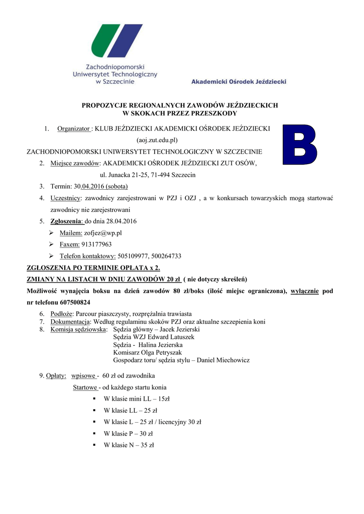 PROPOZYCJE REGIONALNYCH ZAWODÓW JEŹDZIECKICH W SKOKACH PRZEZ PRZESZKODY 1. Organizator : KLUB JEŹDZIECKI AKADEMICKI OŚRODEK JEŹDZIECKI (aoj.zut.edu.pl) ZACHODNIOPOMORSKI UNIWERSYTET TECHNOLOGICZNY W SZCZECINIE 2. Miejsce zawodów: AKADEMICKI OŚRODEK JEŹDZIECKI ZUT OSÓW, ul. Junacka 21-25, 71-494 Szczecin 3. Termin: 30.04.2016 (sobota) 4. Uczestnicy: zawodnicy zarejestrowani w PZJ i OZJ , a w konkursach towarzyskich mogą startować zawodnicy nie zarejestrowani 5. Zgłoszenia: do dnia 28.04.2016 Mailem: [email protected] Faxem: 913177963 Telefon kontaktowy: 505109977, 500264733 ZGŁOSZENIA PO TERMINIE OPŁATA x 2. ZMIANY NA LISTACH W DNIU ZAWODÓW 20 zł ( nie dotyczy skreśleń) Możliwość wynajęcia boksu na dzień zawodów 80 zł/boks (ilość miejsc ograniczona), wyłącznie pod nr telefonu 607500824 6. Podłoże: Parcour piaszczysty, rozprężalnia trawiasta 7. Dokumentacja: Według regulaminu skoków PZJ oraz aktualne szczepienia koni 8. Komisja sędziowska: Sędzia główny – Jacek Jezierski Sędzia WZJ Edward Latuszek Sędzia - Halina Jezierska Komisarz Olga Petryszak Gospodarz toru/ sędzia stylu – Daniel Miechowicz 9. Opłaty: wpisowe - 60 zł od zawodnika Startowe - od każdego startu konia W klasie mini LL – 15zł W klasie LL – 25 zł W klasie L – 25 zł / licencyjny 30 zł W klasie P – 30 zł W klasie N – 35 zł 10. NAGRODY: Klasa I II III LL 150,0 100,0 50,0 L 250,0 100,0 50,0 P 400,0 300,0 200,0 N 500,0 450,0 400,0 Pula nagród: 2950 zł W klasie mini LL flot`s dla koni, puchary i nagrody rzeczowe dla zawodników. W klasie LL flot`s dla koni oraz puchary i nagrody rzeczowe dla zawodników W klasie L flot`s dla koni oraz puchary i nagrody rzeczowe W klasach P, N, dla wszystkich nagrodzonych osób flot`s oraz dla trzech pierwszych miejsc puchary. 11. PROGRAM ZAWODÓW Sobota 30.04.2016 Odprawa techniczna 9.00. Rozpoczęcie konkursów 10.00. Wymagane dokumenty podczas odprawy : aktualne badania lekarskie, zgoda rodziców w przypadku osób niepełnoletnich, ubezpieczenie NNW, paszport konia (aktualne szczepienia), opłacone składki do PZJ lub ZZJ. konkurs nr 1: towarzyski mini LL dokładności, Art.238.1.1 konkurs nr 2: towarzyski klasy LL z trafieniem w normę czasu konkurs nr 3: klasy L egzaminacyjny (licencyjny) z oceną stylu jeźdźca Art. 6 RRZK konkurs nr 4: klasy L dwufazowy, Art.274 p.5.2 konkurs nr 5: klasy P zwykły, Art. 238.2.1 konkurs nr 6: klasy N zwykły z rozgrywką , Art. 238.2.2 UWAGA: Konkursy będą odbywać się, tylko w przypadku zgłoszenia co najmniej 7 koni. 12. Zgodnie z Regulaminem B PZJ 2016 – koń w wieku od 6 lat może startować w konkursach do klasy L1 włącznie, trzykrotnie w ciągu dnia, z zachowaniem zasady maksymalnie dwukrotnego startu w jednym konkursie. 13. Zgłaszając się na zawody zawodnik, luzak zobowiązuje się do noszenia bezpiecznego trzypunktowego nakrycia głowy, każdorazowo dosiadając konia. 14. Organizator zastrzega sobie prawo do zmian w programie zawodów, jak i odwołania zawodów z powodu złej pogody. 15. Zawody przeprowadzone zostaną zgodnie z obowiązującymi przepisami oraz regulaminem skoków PZJ. 16. Organizator nie ponosi odpowiedzialności za wypadki, kradzieże, i inne zdarzenia losowe zarówno w trakcie trwania zawodów jak w czasie transportu na zawody i z zawodów. 17. Propozycje zatwierdzone przez Zachodniopomorski Związek Jeździecki. Sponsorzy: JM Rektor prof. dr hab. Włodzimierz Kiernożycki, Prorektor ds. Kształcenia prof. dr hab. Witold Biedunkiewicz , Sklep Jeździecki EquiFashion. Kodeks postępowania z koniem: Polski Związek Jeździecki oczekuje od wszystkich osób zaangażowanych w sport jeździecki respektowania wydanego przez PZJ Kodeksu Postępowania z Końmi, jak również przestrzegania zasady, że dobro koni jest najważniejsze. Dobro koni musi być zawsze uwzględniane we współzawodnictwie sportowym oraz nie może być podporządkowane celom komercyjnym. Na każdym etapie przygotowań i treningu konia do zawodów jego dobro musi być stawiane na pierwszym miejscu. Dotyczy to stałej dbałości o konia, stosowanych metod treningowych, kucia, obrządzania oraz transportu. Konie i zawodnicy muszą być dobrze przygotowani, zgrani ze sobą, odznaczać się dobrym zdrowiem, zanim zostaną dopuszczeni do startu w zawodach. Odnosi się to również do pomocy weterynaryjnej, zapewnienia bezpieczeństwa po operacjach, w czasie ciąży oraz interwencji w razie złego traktowania konia. Zawody nie mogą zagrażać dobru konia. Oznacza to, że należy zwrócić szczególną uwagę na: prawidłowe przygotowanie terenu zawodów, rodzaj podłoża na hipodromie i trasach, warunki pogodowe, odpowiednie przygotowanie stajni, zapewnienie bezpieczeństwa i wygody koniom w drodze powrotnej z zawodów. Należy dołożyć wszelkich starań., aby zapewnić koniom opiekę po starcie w zawodach, jak również humanitarne traktowanie po zakończeniu kariery sportowej. Dotyczy to zwłaszcza odpowiedniej opieki weterynaryjnej, wymaganych szczepień (eutanazji) oraz spokojnej starości. FEI zobowiązuje osoby zaangażowane w sport jeździecki do stałego podnoszenia na wyższy poziom swojej wiedzy i kwalifikacji w tym zakresie. SERDECZNIE ZAPRASZAMY Propozycje zatwierdzone przez ZZJ w dniu 07.04.2016r.