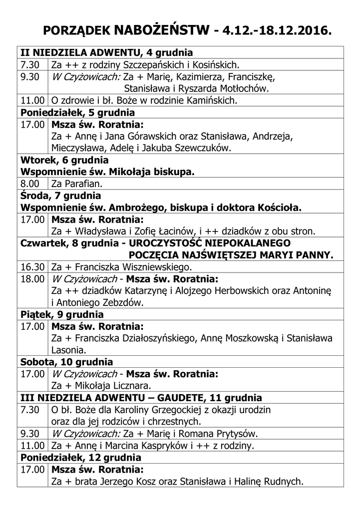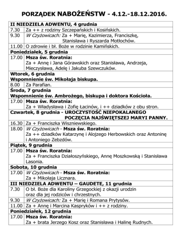 PORZĄDEK NABOŻEŃSTW - 4.12.-18.12.2016. II NIEDZIELA ADWENTU, 4 grudnia 7.30 Za ++ z rodziny Szczepańskich i Kosińskich. 9.30 W Czyżowicach: Za + Marię, Kazimierza, Franciszkę, Stanisława i Ryszarda Motłochów. 11.00 O zdrowie i bł. Boże w rodzinie Kamińskich. Poniedziałek, 5 grudnia 17.00 Msza św. Roratnia: Za + Annę i Jana Górawskich oraz Stanisława, Andrzeja, Mieczysława, Adelę i Jakuba Szewczuków. Wtorek, 6 grudnia Wspomnienie św. Mikołaja biskupa. 8.00 Za Parafian. Środa, 7 grudnia Wspomnienie św. Ambrożego, biskupa i doktora Kościoła. 17.00 Msza św. Roratnia: Za + Władysława i Zofię Łacinów, i ++ dziadków z obu stron. Czwartek, 8 grudnia - UROCZYSTOŚĆ NIEPOKALANEGO POCZĘCIA NAJŚWIĘTSZEJ MARYI PANNY. 16.30 Za + Franciszka Wiszniewskiego. 18.00 W Czyżowicach - Msza św. Roratnia: Za ++ dziadków Katarzynę i Alojzego Herbowskich oraz Antoninę i Antoniego Zebzdów. Piątek, 9 grudnia 17.00 Msza św. Roratnia: Za + Franciszka Działoszyńskiego, Annę Moszkowską i Stanisława Lasonia. Sobota, 10 grudnia 17.00 W Czyżowicach - Msza św. Roratnia: Za + Mikołaja Licznara. III NIEDZIELA ADWENTU – GAUDETE, 11 grudnia 7.30 O bł. Boże dla Karoliny Grzegockiej z okazji urodzin oraz dla jej rodziców i chrzestnych. 9.30 W Czyżowicach: Za + Marię i Romana Prytysów. 11.00 Za + Annę i Marcina Kaspryków i ++ z rodziny. Poniedziałek, 12 grudnia 17.00 Msza św. Roratnia: Za + brata Jerzego Kosz oraz Stanisława i Halinę Rudnych. Wtorek, 13 grudnia Wspomnienie św. Łucji, dziewicy i męczennicy. 8.00 Za dusze w czyśćcu. Środa, 14 grudnia Wspomnienie św. Jana od Krzyża, kapłana i doktora Koscioła. 17.00 Msza św. Roratnia: Za + Józefa Krzesińskiego (ofiarowana przez córkę Ewę z rodziną). Czwartek, 15 grudnia 16.30 Za + ks. Marcina Szewczuka w r. urodzin. 18.00 W Czyżowicach - Msza św. Roratnia: Za Parafian. Piątek, 16 grudnia 17.00 Msza św. Roratnia: Za + ks. Marcina Szewczuka. Sobota, 17 grudnia 17.00 W Czyżowicach - Msza św. Roratnia: O bł. Boże dla Adama Herbowskiego z okazji 70. r. urodzin. IV NIEDZIELA ADWENTU, 18 grudnia 7.30 Za + Krystynę Kurylak w 3. r. śm. i ++ rodziców. Za + Bogusławę Jankowską i ++ rodziców z obu stron. 9.30 W Czyżowicach: Za + Kazimierę Szymoniak oraz ++ z rodziny i pokrewieństwa /W czasie Mszy św. Sakrament Chrztu św. otrzyma Zuzanna Alicja Zawiślak/. 11.00 O zdrowie i bł. Boże dla Łucji Piotrowskiej z okazji urodzin oraz o opiekę Bożą nad rodziną. OGŁOSZENIA PARAFIALNE 4.12.-18.12.2016. Serdeczne Bóg zapłać za Wasze modlitwy, prace i ofiary na rzecz naszej parafii i naszych kościołów. *Spotkania kandydatów do Sakr. Bierzmowania: Niemysłowice – poniedziałek, 5.XII., g. 17.00 - Msza św. i Spotkanie, Czyżowice – czwartek, 8.XII., g. 18.00 - Msza św. i Spotkanie. *Na prośbę Episkopatu Polski, w niedzielę, 11 grudnia odbędzie się Dzień Modlitw i Pomocy Materialnej Kościołowi na Wschodzie. Przy drzwiach kościoła odbędzie się zbiórka ofiar na ten cel. Za składane ofiary serdeczne Bóg zapłać. *Można już zamawiać intencje mszalne na 2017 rok. *Przedświąteczne Odwiedzanie Chorych odbędzie się 23 grudnia (piątek) w Niemysłowicach od g. 9.30, w Czyżowicach od g. 10.30. W styczniu, ze względu na Odwiedziny Duszpasterskie nie będzie Odwiedzin Chorych. W styczniu Odwiedziny Chorych będą się odbywały w ramach „Kolędy”. *W niedzielę, 4 grudnia, w czasie Mszy św. o godz. 9.30 – w Czyżowicach i o godz. 11.00 – w Niemysłowicach odbędzie się Wymiana Tajemnic Różańcowych. Osoby należące do Róż Różańcowych serdecznie zapraszamy. *W zakrystii można nabywać opłatki świąteczne oraz świece wigilijne na rzecz Wigilijnego Dzieła Pomocy Dzieciom. *W zakrystii jest do nabycia kalendarz diecezjalny (7 zł.) i misyjny (5 zł.). ADWENT – CZUWAJMY I MÓDLMY SIĘ! Adwent – to święty czas, kiedy to Kościół zachęca wszystkich wierzących do spojrzenia w trzech kierunkach: - cofnięcia się do tego, co było, wspominając pamiątkę narodzenia Pana Jezusa; - do wybiegnięcia ku temu, co czeka nas w przyszłości, w czasie powtórnego przyjścia Chrystusa przy końcu czasów; - do zastanowienia się nad teraźniejszością, czyli nad tym, jak najlepiej przygotować się na przyjście Chrystusa podczas tegorocznego Adwentu. Bóg nieustannie okazuje nam swoją miłość, i przychodzi do nas w każdej chwili naszego życia. Po raz pierwszy przyszedł Bóg do każdego z nas w chwili naszych narodzin, kiedy z miłości powołał nas do życia. W chwili chrztu przyszedł, aby uczynić nas swoimi przybranymi dziećmi. Codziennie przychodzi do każdego z nas przez to, że podtrzymuje nas przy życiu. Przychodzi do nas w każdym dniu, otaczając nas dobrymi i kochanymi ludźmi, którzy są Jego posłańcami. Przychodzi do nas przez swoje święte Słowo, które czytamy albo słyszymy w Kościele. Przychodzi przez święte znaki – Sakramenty, które przyjmujemy. W szczególny sposób przychodzi do nas Chrystus w czasie każdej Mszy świętej, kiedy możemy przyjąć Go do serca pod postacią chleba. Nie powinny nas zatem dziwić słowa Jezusa: “Uważajcie i czuwajcie”, czyli zawsze bądźcie gotowi na Moje przyjście, na to, aby Mnie przyjąć. Uważajmy, zatem i czuwajmy w czasie tegorocznego Adwentu, abyśmy – nie daj Boże – nie usłyszeli kiedyś od Chrystusa słów: wiele razy chciałem przyjść do ciebie ze swoją miłością i łaską, ale zawsze drzwi twojego serca były zamknięte. „A zwłaszcza rozumiejcie chwilę obecną: teraz nadeszła dla was godzina powstania ze snu. Teraz bowiem zbawienie jest bliżej nas niż wtedy, gdyśmy uwierzyli. Noc się posunęła, a przybliżył się dzień. Odrzućmy więc uczynki ciemności, a przyobleczmy się w zbroję światła! Żyjmy przyzwoicie, jak w jasny dzień: nie w hulankach i pijatykach, nie w rozpuście i wyuzdaniu, nie w kłótni i zazdrości. Ale przyobleczcie si