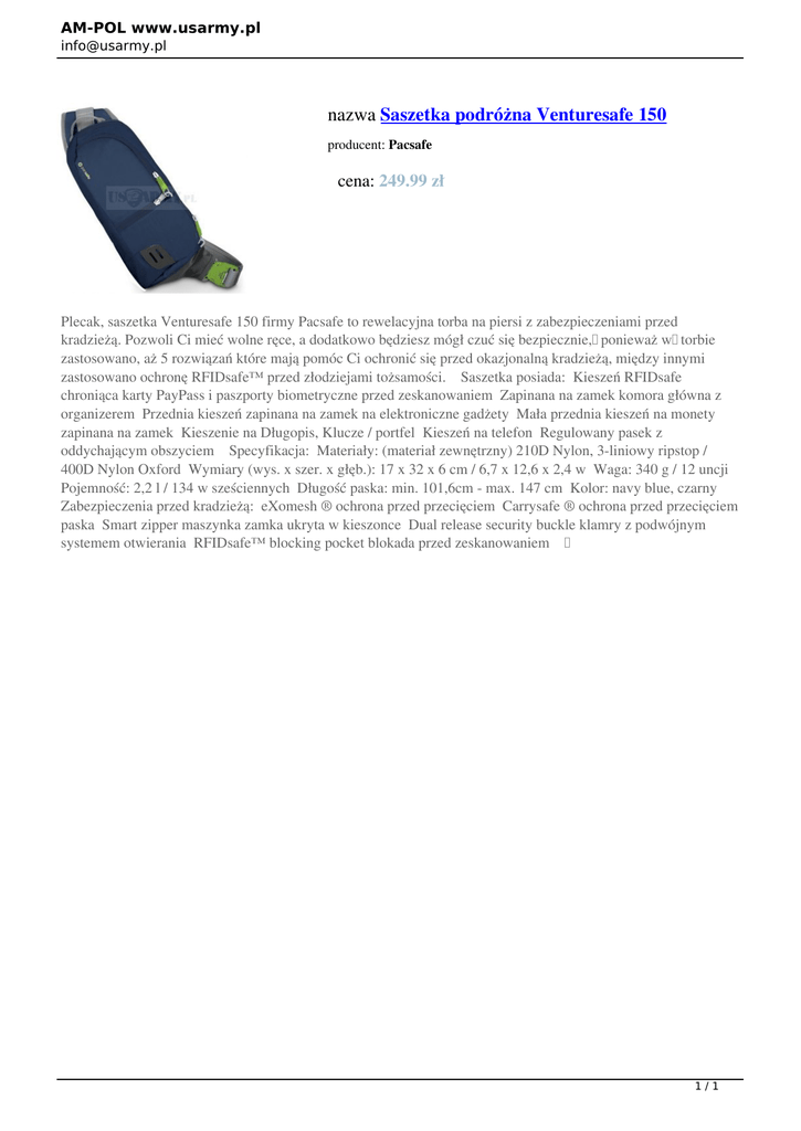 AM-POL www.usarmy.pl [email protected] nazwa Saszetka podróżna Venturesafe 150 producent: Pacsafe cena: 249.99 zł Plecak, saszetka Venturesafe 150 firmy Pacsafe to rewelacyjna torba na piersi z zabezpieczeniami przed kradzieżą. Pozwoli Ci mieć wolne ręce, a dodatkowo będziesz mógł czuć się bezpiecznie, ponieważ w torbie zastosowano, aż 5 rozwiązań które mają pomóc Ci ochronić się przed okazjonalną kradzieżą, między innymi zastosowano ochronę RFIDsafe™ przed złodziejami tożsamości. Saszetka posiada: Kieszeń RFIDsafe chroniąca karty PayPass i paszporty biometryczne przed zeskanowaniem Zapinana na zamek komora główna z organizerem Przednia kieszeń zapinana na zamek na elektroniczne gadżety Mała przednia kieszeń na monety zapinana na zamek Kieszenie na Długopis, Klucze / portfel Kieszeń na telefon Regulowany pasek z oddychającym obszyciem Specyfikacja: Materiały: (materiał zewnętrzny) 210D Nylon, 3-liniowy ripstop / 400D Nylon Oxford Wymiary (wys. x szer. x głęb.): 17 x 32 x 6 cm / 6,7 x 12,6 x 2,4 w Waga: 340 g / 12 uncji Pojemność: 2,2 l / 134 w sześciennych Długość paska: min. 101,6cm - max. 147 cm Kolor: navy blue, czarny Zabezpieczenia przed kradzieżą: eXomesh ® ochrona przed przecięciem Carrysafe ® ochrona przed przecięciem paska Smart zipper maszynka zamka ukryta w kieszonce Dual release security buckle klamry z podwójnym systemem otwierania RFIDsafe™ blocking pocket blokada przed zeskanowaniem 1/1