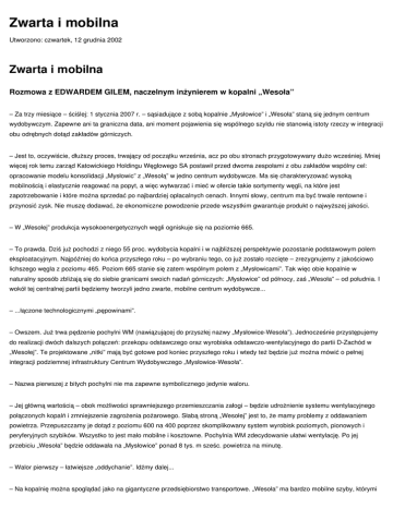 Zwarta i mobilna Utworzono: czwartek, 12 grudnia 2002 Zwarta i mobilna Rozmowa z EDWARDEM GILEM, naczelnym inżynierem w kopalni „Wesoła” – Za trzy miesiące – ściślej: 1 stycznia 2007 r. – sąsiadujące z sobą kopalnie „Mysłowice” i „Wesoła” staną się jednym centrum wydobywczym. Zapewne ani ta graniczna data, ani moment pojawienia się wspólnego szyldu nie stanowią istoty rzeczy w integracji obu odrębnych dotąd zakładów górniczych. – Jest to, oczywiście, dłuższy proces, trwający od początku września, acz po obu stronach przygotowywany dużo wcześniej. Mniej więcej rok temu zarząd Katowickiego Holdingu Węglowego SA postawił przed dwoma zespołami z obu zakładów wspólny cel: opracowanie modelu konsolidacji „Mysłowic” z „Wesołą” w jedno centrum wydobywcze. Ma się charakteryzować wysoką mobilnością i elastycznie reagować na popyt, a więc wytwarzać i mieć w ofercie takie sortymenty węgli, na które jest zapotrzebowanie i które można sprzedać po najbardziej opłacalnych cenach. Innymi słowy, centrum ma być trwale rentowne i przynosić zysk. Nie muszę dodawać, że ekonomiczne powodzenie przede wszystkim gwarantuje produkt o najwyższej jakości. – W „Wesołej” produkcja wysokoenergetycznych węgli ogniskuje się na poziomie 665. – To prawda. Dziś już pochodzi z niego 55 proc. wydobycia kopalni i w najbliższej perspektywie pozostanie podstawowym polem eksploatacyjnym. Najpóźniej do końca przyszłego roku – po wybraniu tego, co już zostało rozcięte – zrezygnujemy z jakościowo lichszego węgla z poziomu 465. Poziom 665 stanie się zatem wspólnym polem z „Mysłowicami”. Tak więc obie kopalnie w naturalny sposób zbliżają się do siebie granicami swoich nadań górniczych: „Mysłowice” od północy, zaś „Wesoła” – od południa. I wokół tej centralnej partii będziemy tworzyli jedno zwarte, mobilne centrum wydobywcze... – ...łączone technologicznymi „pępowinami”. – Owszem. Już trwa pędzenie pochylni WM (nawiązującej do przyszłej nazwy „Mysłowice-Wesoła”). Jednocześnie przystępujemy do realizacji dwóch dalszych połączeń: przekopu odstawczego oraz wyrobiska odstawczo-wentylacyjnego do partii D-Zachód w „Wesołej”. Te projektowane „nitki” mają być gotowe pod koniec przyszłego roku i wtedy też będzie już można mówić o pełnej integracji podziemnej infrastruktury Centrum Wydobywczego „Mysłowice-Wesoła”. – Nazwa pierwszej z bitych pochylni nie ma zapewne symbolicznego jedynie waloru. – Jej główną wartością – obok możliwości sprawniejszego przemieszczania załogi – będzie udrożnienie systemu wentylacyjnego połączonych kopalń i zmniejszenie zagrożenia pożarowego. Słabą stroną „Wesołej” jest to, że mamy problemy z oddawaniem powietrza. Przepuszczamy je dotąd z poziomu 600 na 400 poprzez skomplikowany system wyrobisk poziomych, pionowych i peryferyjnych szybików. Wszystko to jest mało mobilne i kosztowne. Pochylnia WM zdecydowanie ułatwi wentylację. Po jej przebiciu „Wesoła” będzie oddawała na „Mysłowice” ponad 8 tys. m sześc. powietrza na minutę. – Walor pierwszy – łatwiejsze „oddychanie”. Idźmy dalej... – Na kopalnię można spoglądać jako na gigantyczne przedsiębiorstwo transportowe. „Wesoła” ma bardzo mobilne szyby, którymi możemy wyciągać urobek i nasz i kolegów z „Mysłowic”. Sensowne jest więc całkowite staśmowanie odstawy z przekierowaniem jej na szyby i sortownię „Wesołej”. – Kolejne walory? – Najlapidarniej rzecz ujmując, idzie o to, ażeby z obu odrębnych dotąd kopalń wydobyć wszystko to, co w nich najlepsze. – Zatem... – Koledzy z „Mysłowic” mają imponujące doprawdy doświadczenia w zakresie stosowania technologii podsadzkowej, w tym tzw. zmulania skały płonnej. Natomiast „Wesoła” prowadziła dotąd eksploatację wyłącznie na zawał. Umiejętności „mysłowiczan” można więc m.in. doskonale spożytkować przy – prowadzonym w ramach prewencji przeciwpożarowej – „korkowaniu” zbędnych już przekopów i chodników oraz izolacji wyeksploatowanych rejonów. Dla odmiany „Wesoła” ma rozwinięty system odmetanowania. Latami uczyliśmy się, jak ściągać ze zrobów ten groźny pod ziemią, a jednocześnie użyteczny na powierzchni węglowodór. Połączenie obu kopalń pozwoli więc na wykorzystanie naszych instalacji do ciągnięcia metanu także z „Mysłowic”. W obu przypadkach gra idzie o bezpieczeństwo. Wspólnota, w ramach centrum wydobywczego, to wreszcie mniejsze koszty – skalkulowano, że w tym przypadku można mówić o oszczędności rzędu 10 złotych na tonę – zużycia mediów, czyli energii elektrycznej, sprężonego powietrza i wody. Wszystko przemawia więc za tego rodzaju konsolidacją. – Jaka będzie produkcja centrum? – Według wstępnych jeszcze przymiarek ma się „kręcić” wokół 20 tys. ton węgla na dobę. Sortymentowo i jakościowo mają to być atrakcyjne rynkowo węgle „z górnej półki”. W zintegrowanej kopalni – to jeszcze jeden walor w porównaniu do odrębnej działalności dwóch zakładów – wydobycie będzie biegło w 7-8 ścianach z jedną zapasową i jedną w przezbrajaniu. Dotąd – oddzielnie biorąc – ten front eksploatacyjny był bardziej rozproszony. Tymczasem wyposażenie każdej ściany, to inwestycja takiego kalibru, że powinna „hulać” w ciągłym cyklu i przy pełnym obłożeniu. – Mnoży pan walory. Zastanawiam się, czy podobnie spoglądają na ten konsolidacyjny proces załogi? – Odwołam się do własnej biografii zawodowej. Nie po raz pierwszy uczestniczę w tego rodzaju operacji, toteż z własnego doświadczenia wiem, że nigdy dotąd nie łączyły się one z jakimiś problemami pracowniczymi. Proszę pójść na cechownię i zapytać kilku z przypadkowo napotkanych górników, jak nazywa się dyrektor kopalni