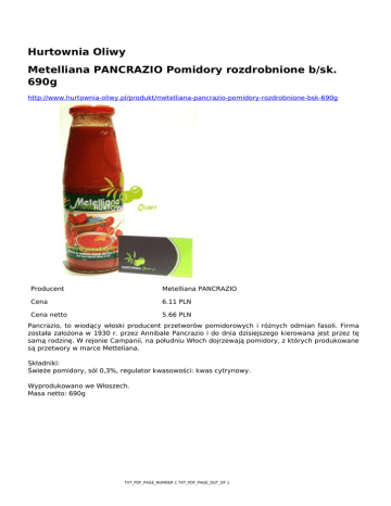Hurtownia Oliwy Metelliana PANCRAZIO Pomidory rozdrobnione b/sk. 690g http://www.hurtownia-oliwy.pl/produkt/metelliana-pancrazio-pomidory-rozdrobnione-bsk-690g Producent Metelliana PANCRAZIO Cena 6.11 PLN Cena netto 5.66 PLN Pancrazio, to wiodący włoski producent przetworów pomidorowych i różnych odmian fasoli. Firma została założona w 1930 r. przez Annibale Pancrazio i do dnia dzisiejszego kierowana jest przez tę samą rodzinę. W rejonie Campanii, na południu Włoch dojrzewają pomidory, z których produkowane są przetwory w marce Metteliana. Składniki: Świeże pomidory, sól 0,3%, regulator kwasowości: kwas cytrynowy. Wyprodukowano we Włoszech. Masa netto: 690g TXT_PDF_PAGE_NUMBER 1 TXT_PDF_PAGE_OUT_OF 1