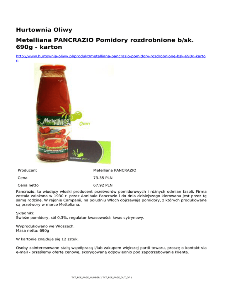 Hurtownia Oliwy Metelliana PANCRAZIO Pomidory rozdrobnione b/sk. 690g - karton http://www.hurtownia-oliwy.pl/produkt/metelliana-pancrazio-pomidory-rozdrobnione-bsk-690g-karto n Producent Metelliana PANCRAZIO Cena 73.35 PLN Cena netto 67.92 PLN Pancrazio, to wiodący włoski producent przetworów pomidorowych i różnych odmian fasoli. Firma została założona w 1930 r. przez Annibale Pancrazio i do dnia dzisiejszego kierowana jest przez tę samą rodzinę. W rejonie Campanii, na południu Włoch dojrzewają pomidory, z których produkowane są przetwory w marce Metteliana. Składniki: Świeże pomidory, sól 0,3%, regulator kwasowości: kwas cytrynowy. Wyprodukowano we Włoszech. Masa netto: 690g W kartonie znajduje się 12 sztuk. Osoby zainteresowane stałą współpracą i/lub zakupem większej partii towaru, proszę o kontakt via e-mail - prześlemy ofertę cenową, skorygowaną odpowiednio pod zapotrzebowanie klienta. TXT_PDF_PAGE_NUMBER 1 TXT_PDF_PAGE_OUT_OF 1