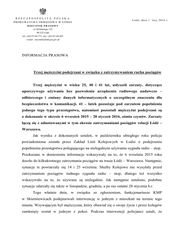 RZECZPOSPOLITA POLSKA PROKURATURA OKRĘGOWA W ŁODZI Łódź, dnia 1 luty 2016 r. RZE CZNIK P RASOWY ul. Kilińskiego 152 90-322 Łódź tel.: (42) 67-68-771, fax.: (42) 67-68-607 e-mail : [email protected] INFORMACJA PRASOWA Trzej mężczyźni podejrzani w związku z zatrzymywaniem ruchu pociągów Trzej mężczyźni w wieku 25, 40 i 41 lat, usłyszeli zarzuty, dotyczące uporczywego używania bez pozwolenia urządzenia radiowego nadawczo – odbiorczego i zmiany danych informatycznych o szczególnym znaczeniu dla bezpieczeństwa w komunikacji. 41 – latek pozostaje pod zarzutem popełnienia jednego tego typu przestępstwa, natomiast pozostali mężczyźni podejrzani są o dokonanie w okresie 6 wrzesień 2015 – 28 styczeń 2016, ośmiu czynów. Zarzuty łączą się z odnotowanymi w tym okresie zatrzymaniami pociągów relacji Łódź – Warszawa. Jak wynika z dokonanych ustaleń, w październiku ubiegłego roku policja powiadomiona została przez Zakład Linii Kolejowych w Łodzi o podejrzeniu popełnienia przestępstwa polegającego na nielegalnym używaniu sygnału radio – stop. Przekazane w doniesieniu informacje wskazywały na to, że 6 września 2015 roku doszło do kilkukrotnego zatrzymania pociągów na trasie Łódź – Warszawa. Następnie, sytuacje te powtarzały się 14 i 25 września. Służby Kolejowe nie wysyłały przed zatrzymaniem pociągów żadnego sygnału radio – stop, dlatego też wszystko wskazywało na to, że używane są nielegalnie. Jak następnie ustalono, podobne sytuacje zdarzały się także w listopadzie, grudniu, a po raz ostatni 28 stycznia b.r. Tego właśnie dnia, w związku ze zgłoszeniem, funkcjonariusze KMP w Skierniewicach podejmowali interwencję w jednym z mieszkań na terenie tego miasta. Wzywającym był mężczyzna, który obawiał się o swoje życie i przez kolegów zamknięty został w jednym z pokoi. Podczas interwencji policjanci ustali, że 2 znajdujący się w lokalu, wynajmowanym przez 40 – latka, trzej mężczyźni wspólnie spożywali alkohol. Doszło do konfliktu, który doprowadził do zamknięcia najmłodszego z nich w oddzielnym pokoju. Podczas interwencji uwagę policjantów zwróciły znajdujące się w mieszkaniu: radiotelefon, duża ilość sprzętu elektronicznego, w tym kilku przenośnych stacji, a także zamontowana antena. Policjanci szybko połączyli fakt ujawnienia tych przedmiotów z zatrzymywaniem w ostatnim okresie pociągów. Wszyscy trzej mężczyźni zostali zatrzymani, a następnie usłyszeli zarzuty. 40 i 25 – latek przyznali się do popełnienia zarzuconych im czynów. Nie przyznał się natomiast najstarszy z mężczyzn. Wszystko wskazuje na to, że sygnały „start – stop” od września 2015 roku były kilkukrotnie nadawane z mieszkania, wynajmowanego przez 40 – latka, w Skierniewicach, w którym często odwiedzał go 25 – latek. Prawdopodobnie w dniu 28 stycznia w popełnieniu przestępstwa uczestniczył także 41 – letni mężczyzna. Podejrzanym grozi kara pozbawienia wolności w wymiarze do lat 8. Prokurator zastosował w stosunku do nich policyjne dozory. Rzecznik Prasowy Prokuratury Okręgowej w Łodzi Krzysztof Kopania