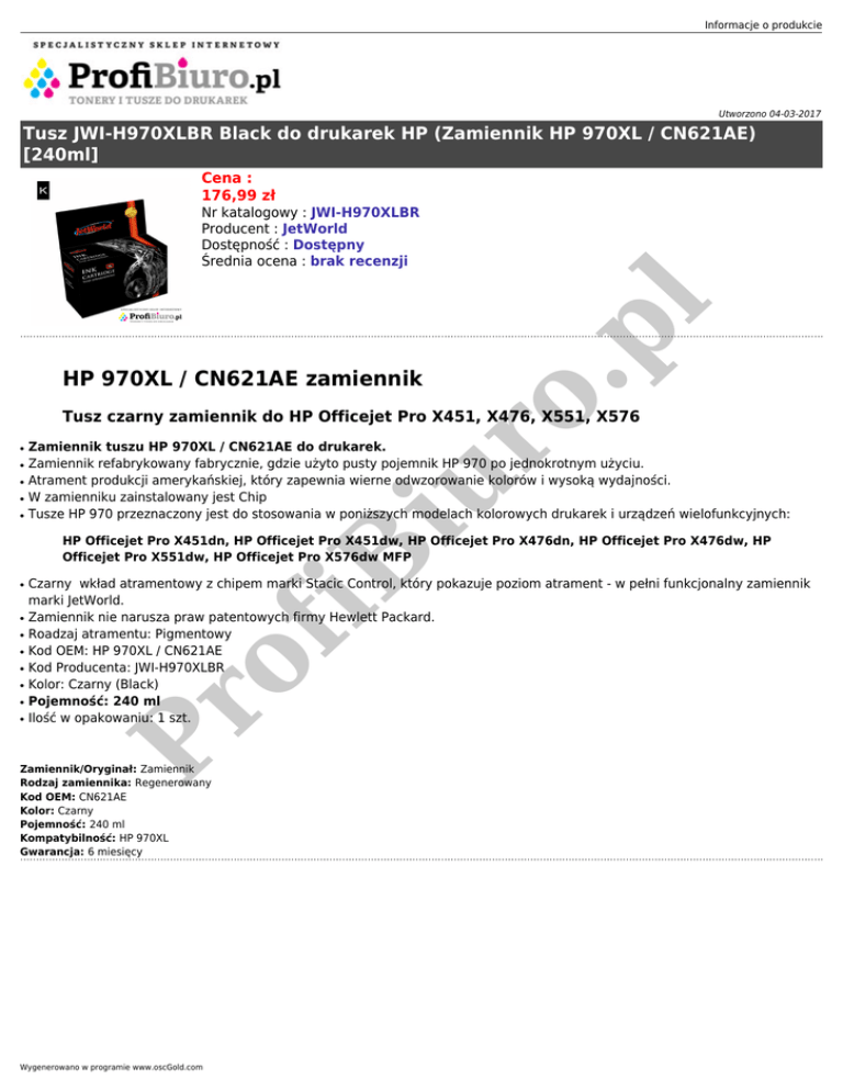 Informacje o produkcie Utworzono 04-03-2017 Tusz JWI-H970XLBR Black do drukarek HP (Zamiennik HP 970XL / CN621AE) [240ml] Cena : 176,99 zł HP 970XL / CN621AE zamiennik o. pl Nr katalogowy : JWI-H970XLBR Producent : JetWorld Dostępność : Dostępny Średnia ocena : brak recenzji Tusz czarny zamiennik do HP Officejet Pro X451, X476, X551, X576 ● ● ● ● Zamiennik tuszu HP 970XL / CN621AE do drukarek. Zamiennik refabrykowany fabrycznie, gdzie użyto pusty pojemnik HP 970 po jednokrotnym użyciu. Atrament produkcji amerykańskiej, który zapewnia wierne odwzorowanie kolorów i wysoką wydajności. W zamienniku zainstalowany jest Chip Tusze HP 970 przeznaczony jest do stosowania w poniższych modelach kolorowych drukarek i urządzeń wielofunkcyjnych: iu r ● ● ● ● ● ● ● of ● Czarny wkład atramentowy z chipem marki Stacic Control, który pokazuje poziom atrament - w pełni funkcjonalny zamiennik marki JetWorld. Zamiennik nie narusza praw patentowych firmy Hewlett Packard. Roadzaj atramentu: Pigmentowy Kod OEM: HP 970XL / CN621AE Kod Producenta: JWI-H970XLBR Kolor: Czarny (Black) Pojemność: 240 ml Ilość w opakowaniu: 1 szt. Pr ● iB HP Officejet Pro X451dn, HP Officejet Pro X451dw, HP Officejet Pro X476dn, HP Officejet Pro X476dw, HP Officejet Pro X551dw, HP Officejet Pro X576dw MFP Zamiennik/Oryginał: Zamiennik Rodzaj zamiennika: Regenerowany Kod OEM: CN621AE Kolor: Czarny Pojemność: 240 ml Kompatybilność: HP 970XL Gwarancja: 6 miesięcy Wygenerowano w programie www.oscGold.com